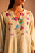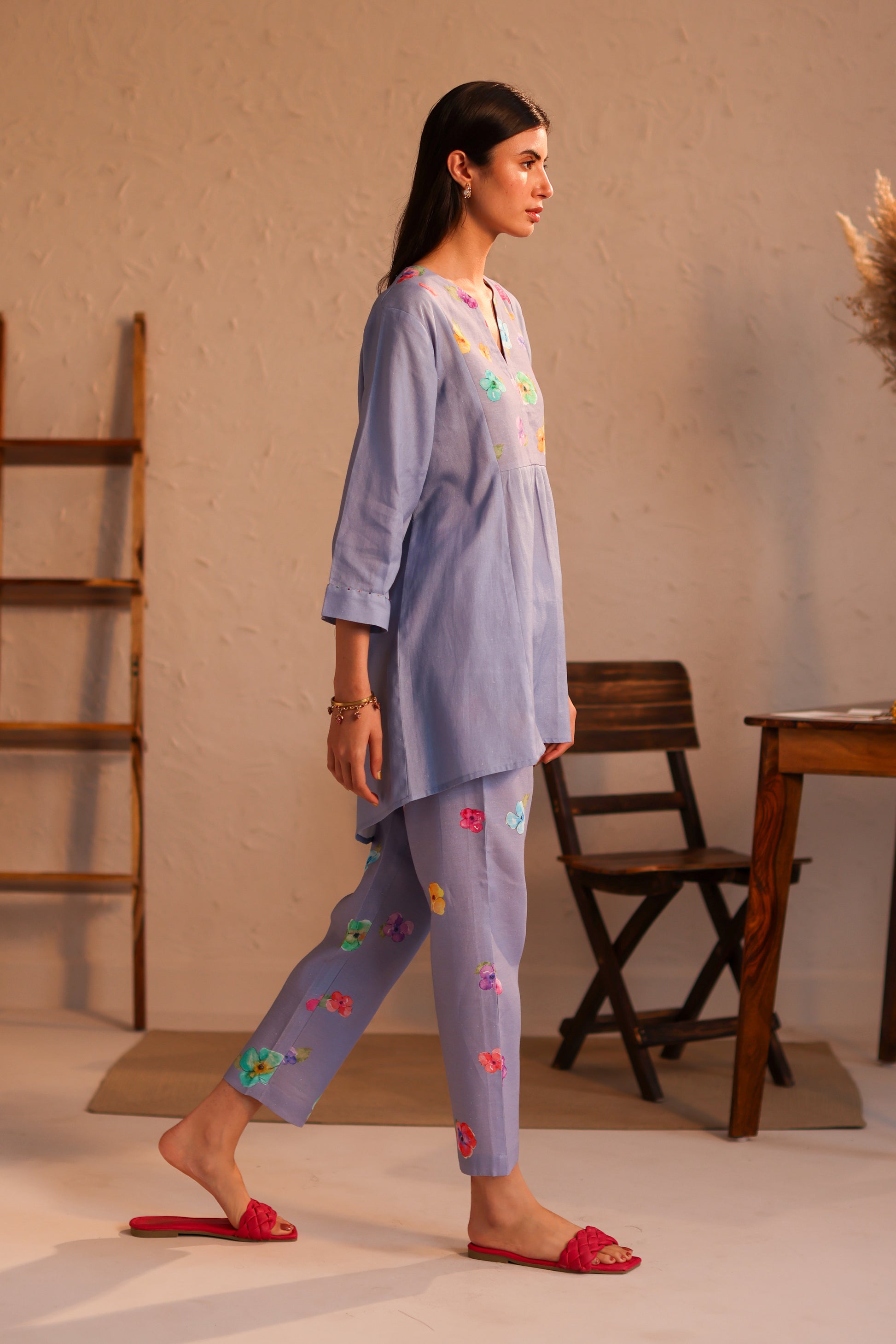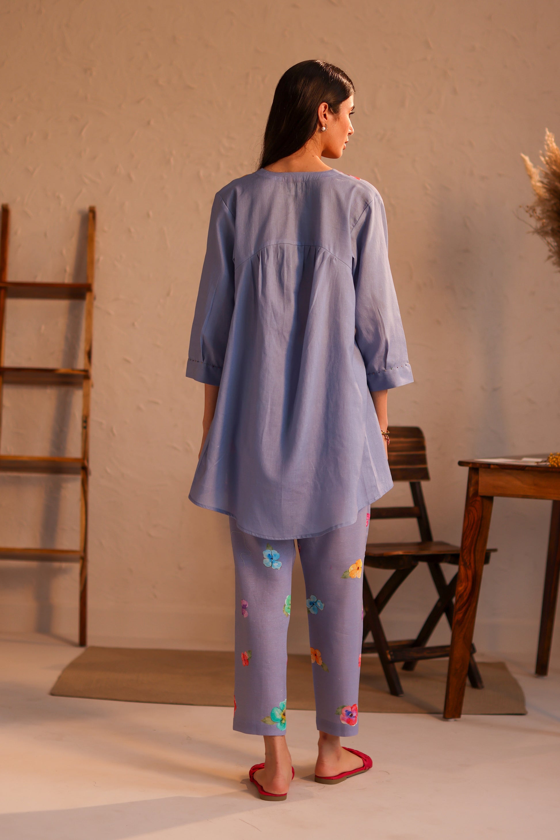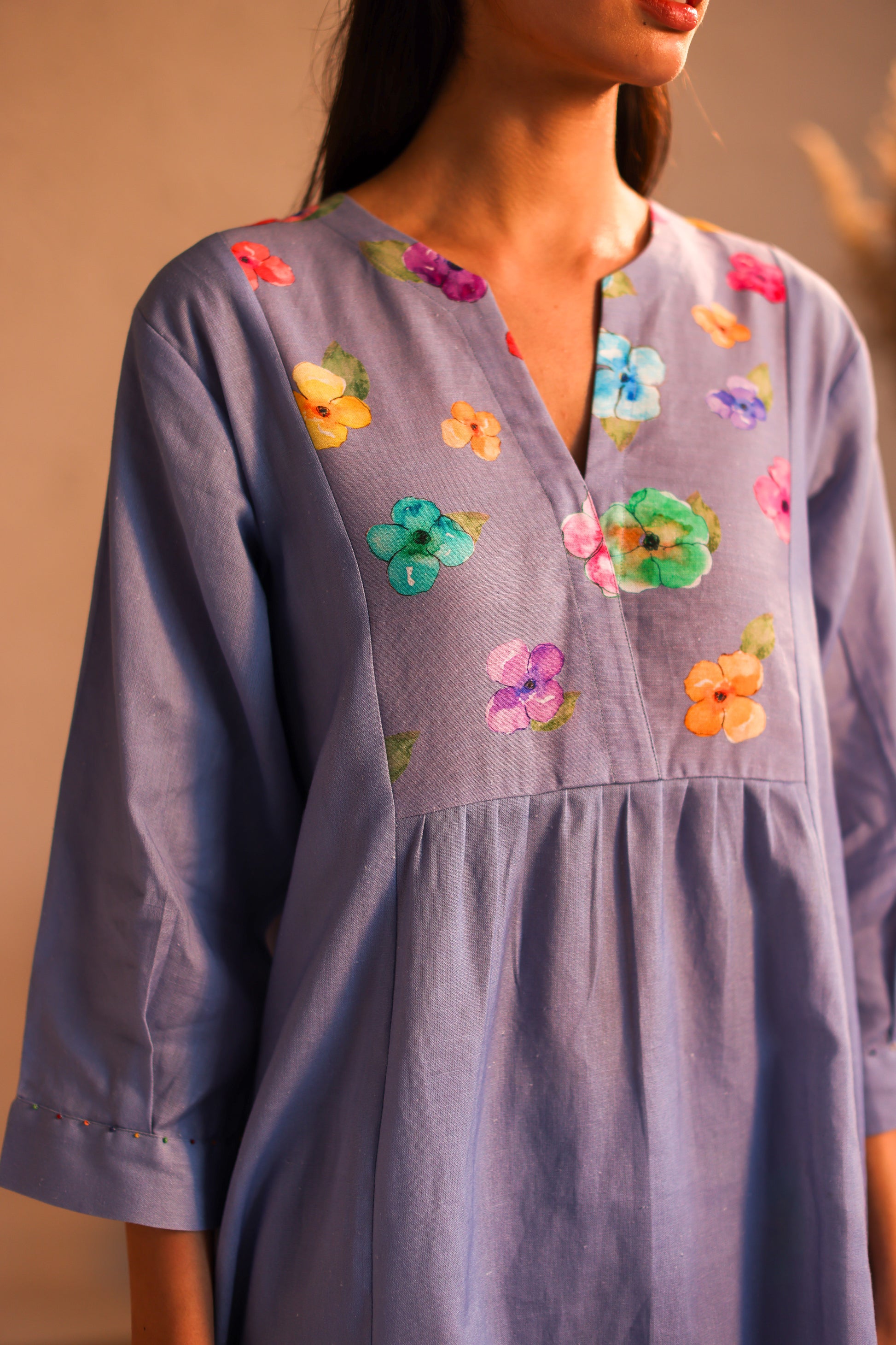 The limoncello top is a short length top in an a-line with watercolor pansies across the yoke. The sleeves are finished off with hand embroidered accents and can be paired with the limoncello pants.