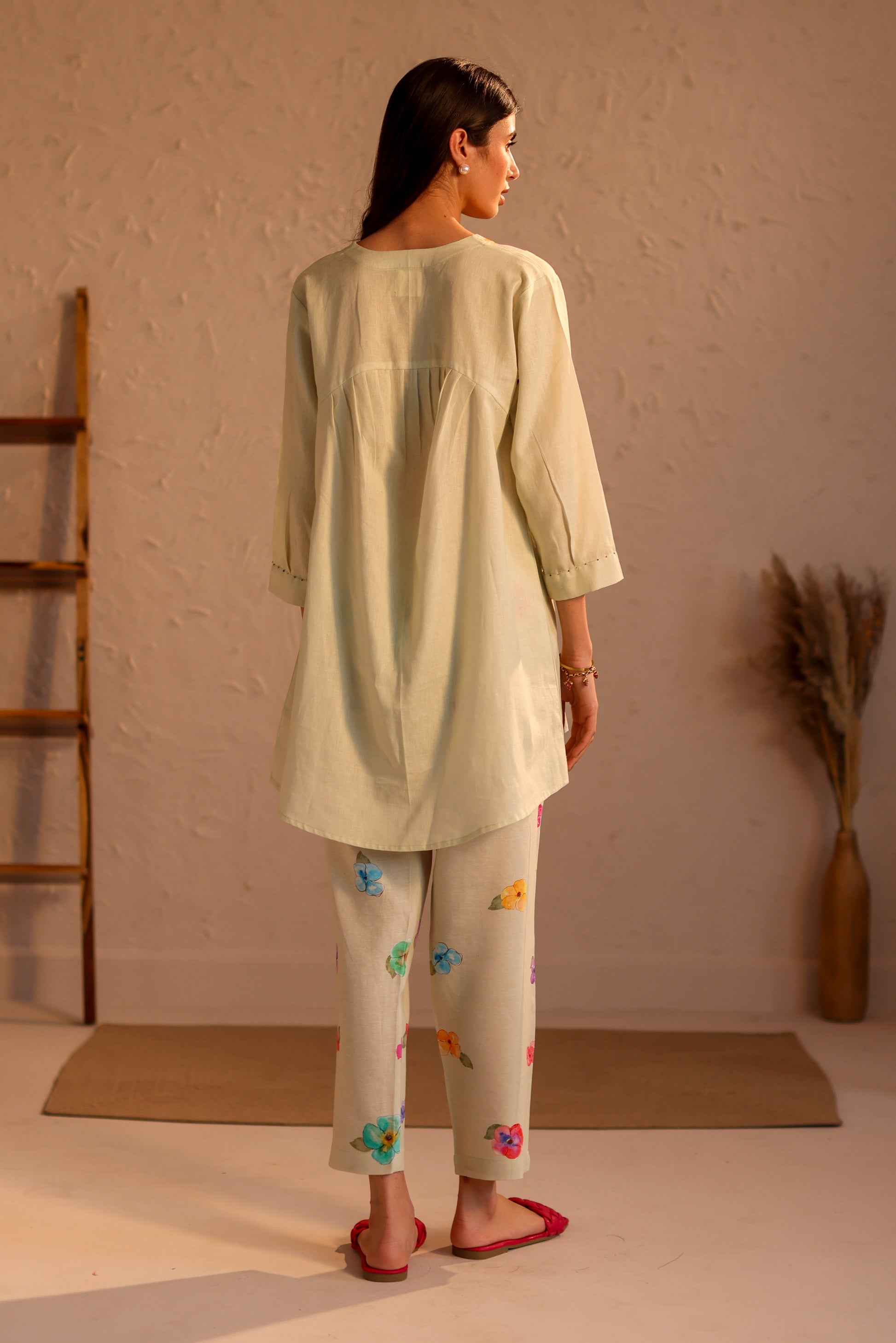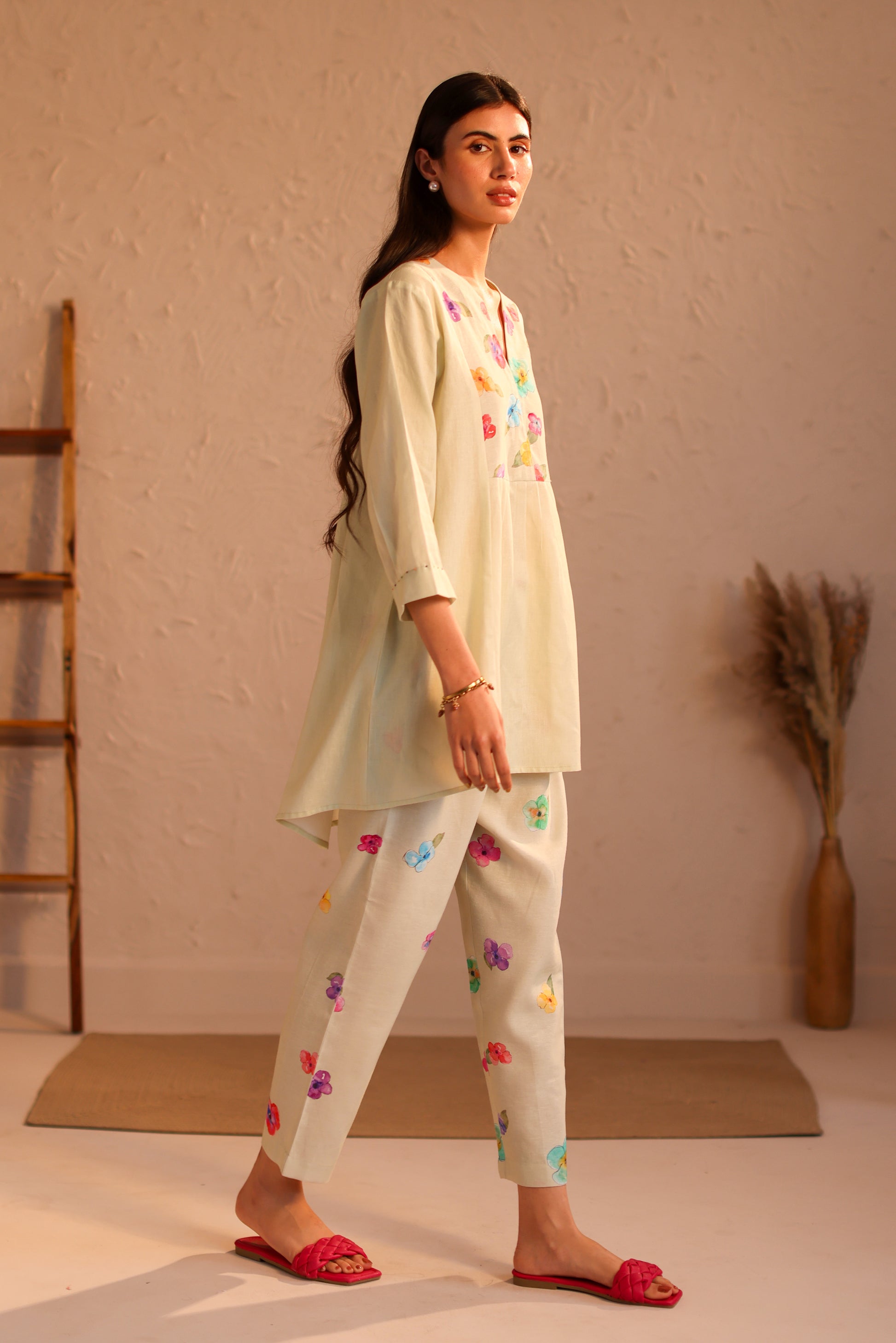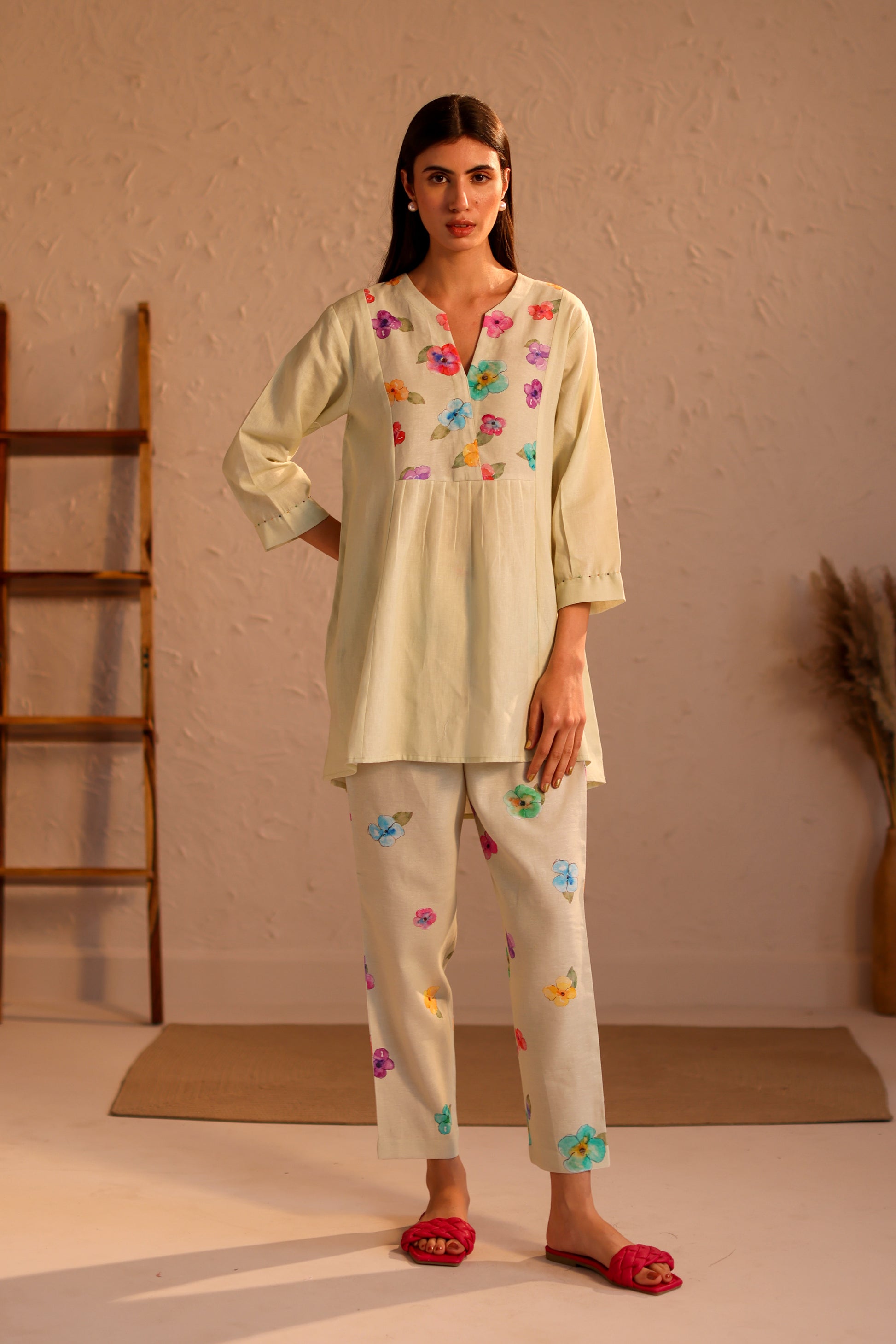The limoncello top is a short length top in an a-line with watercolor pansies across the yoke. The sleeves are finished off with hand embroidered accents and can be paired wit the limoncello pants.