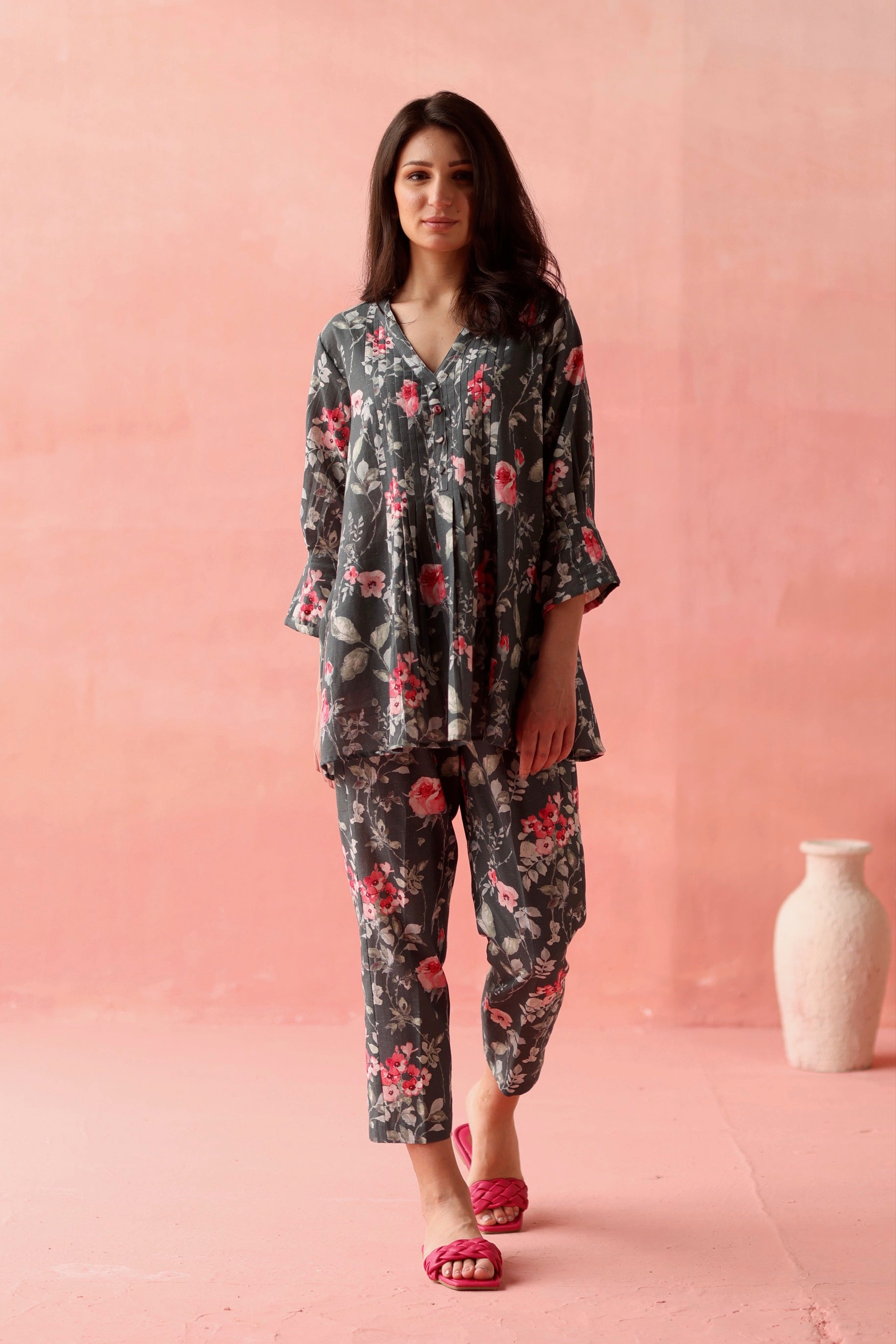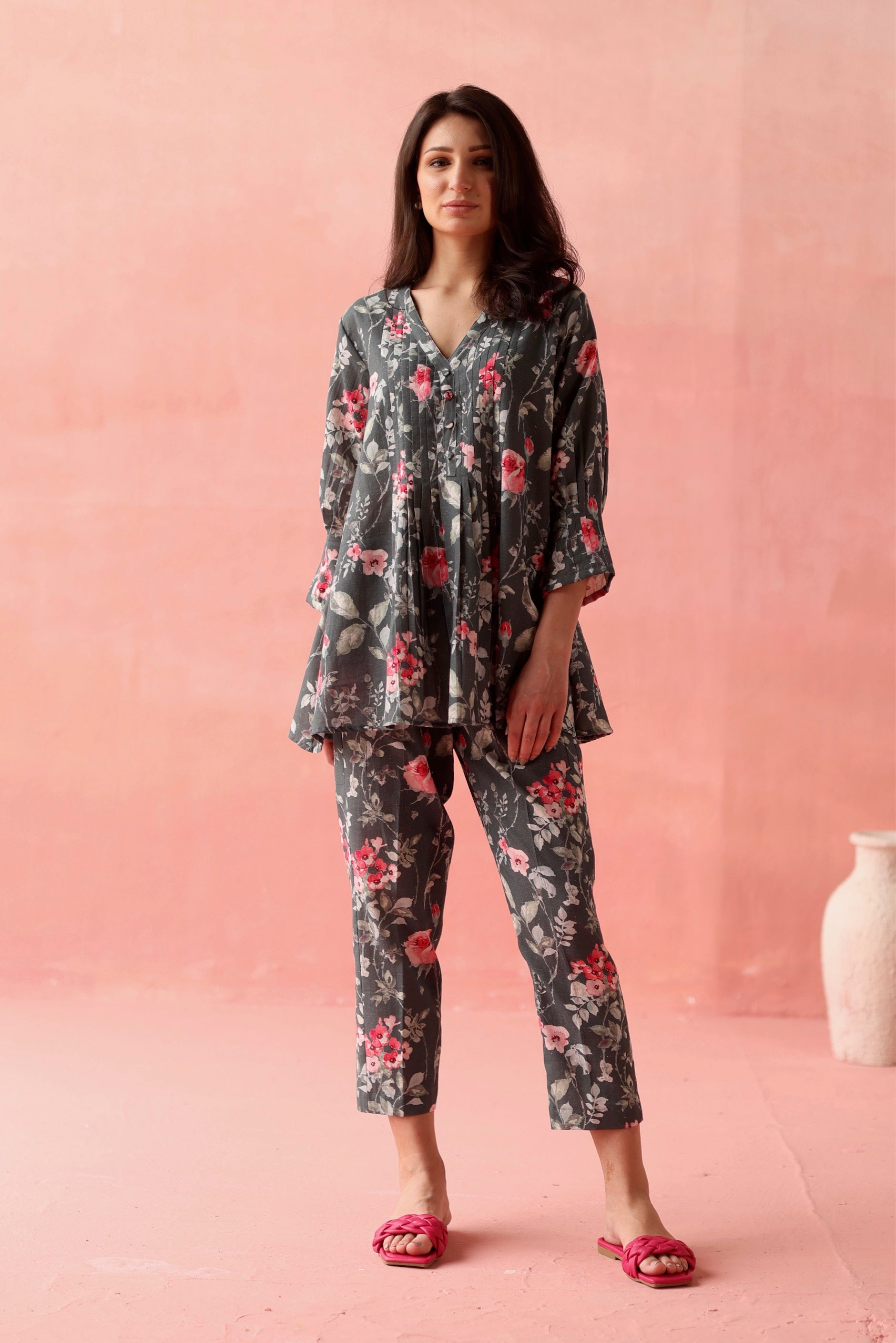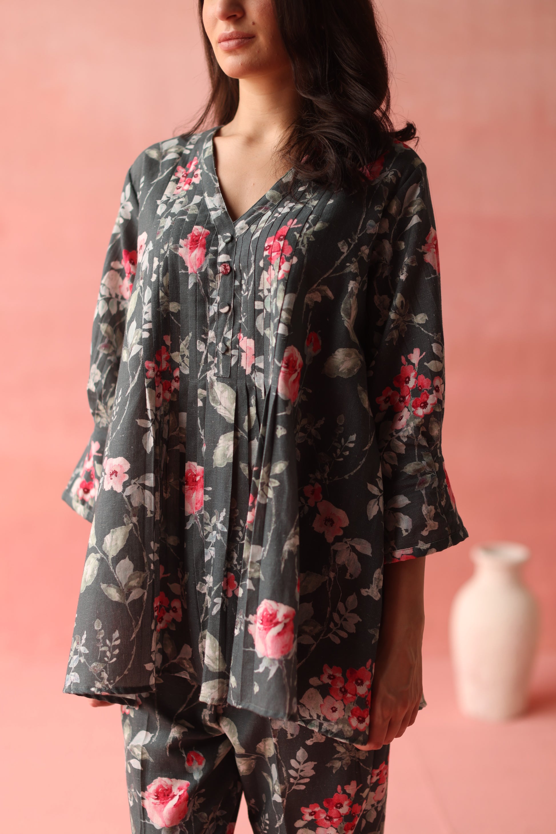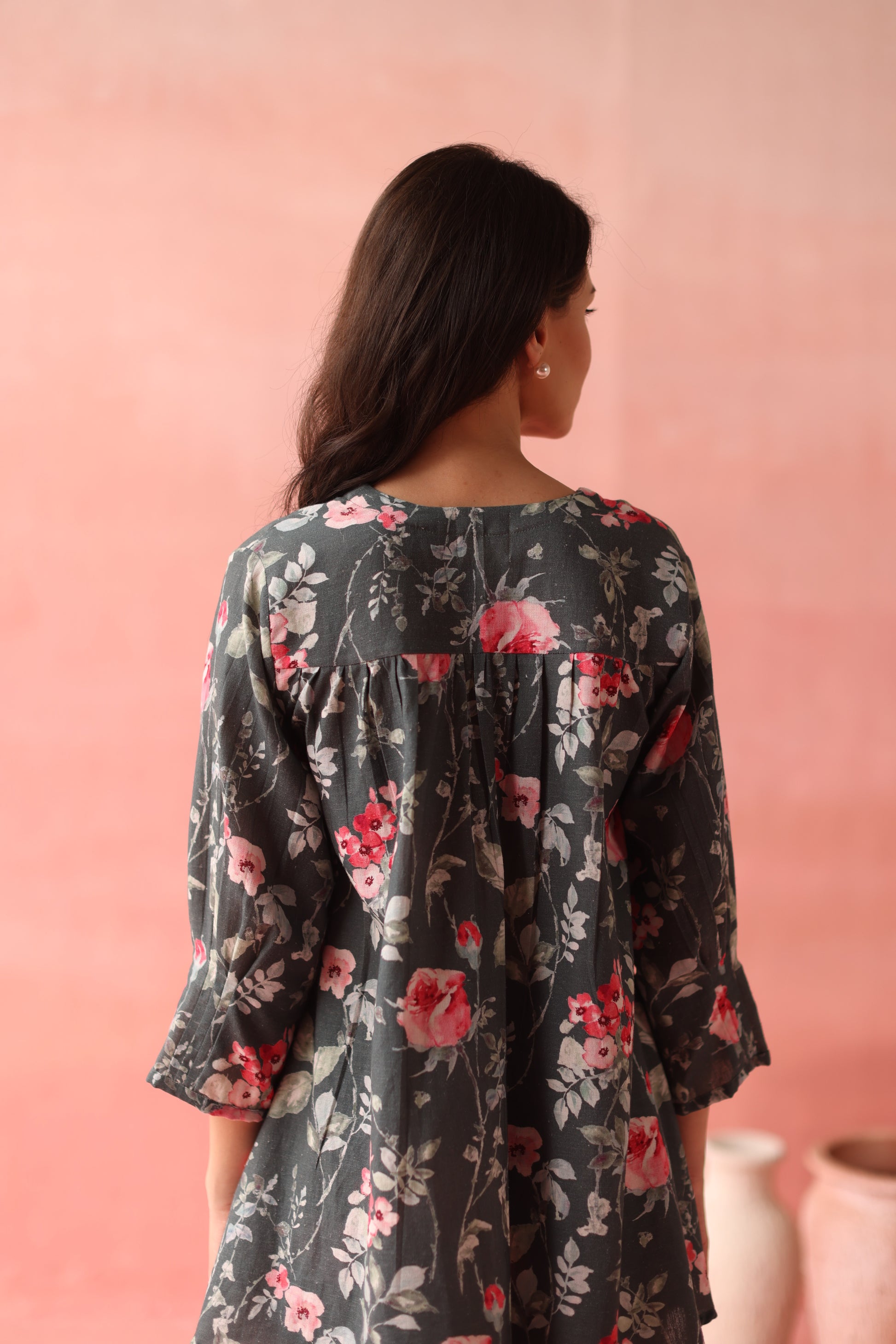 The luzern floral pleated top combines comfort, style, and a playful element with its linen fabric, pleated sleeves, and floral print. The floral print adds a feminine and vibrant element to the top, making it suitable for various occasions by pairing it with luzern pants.