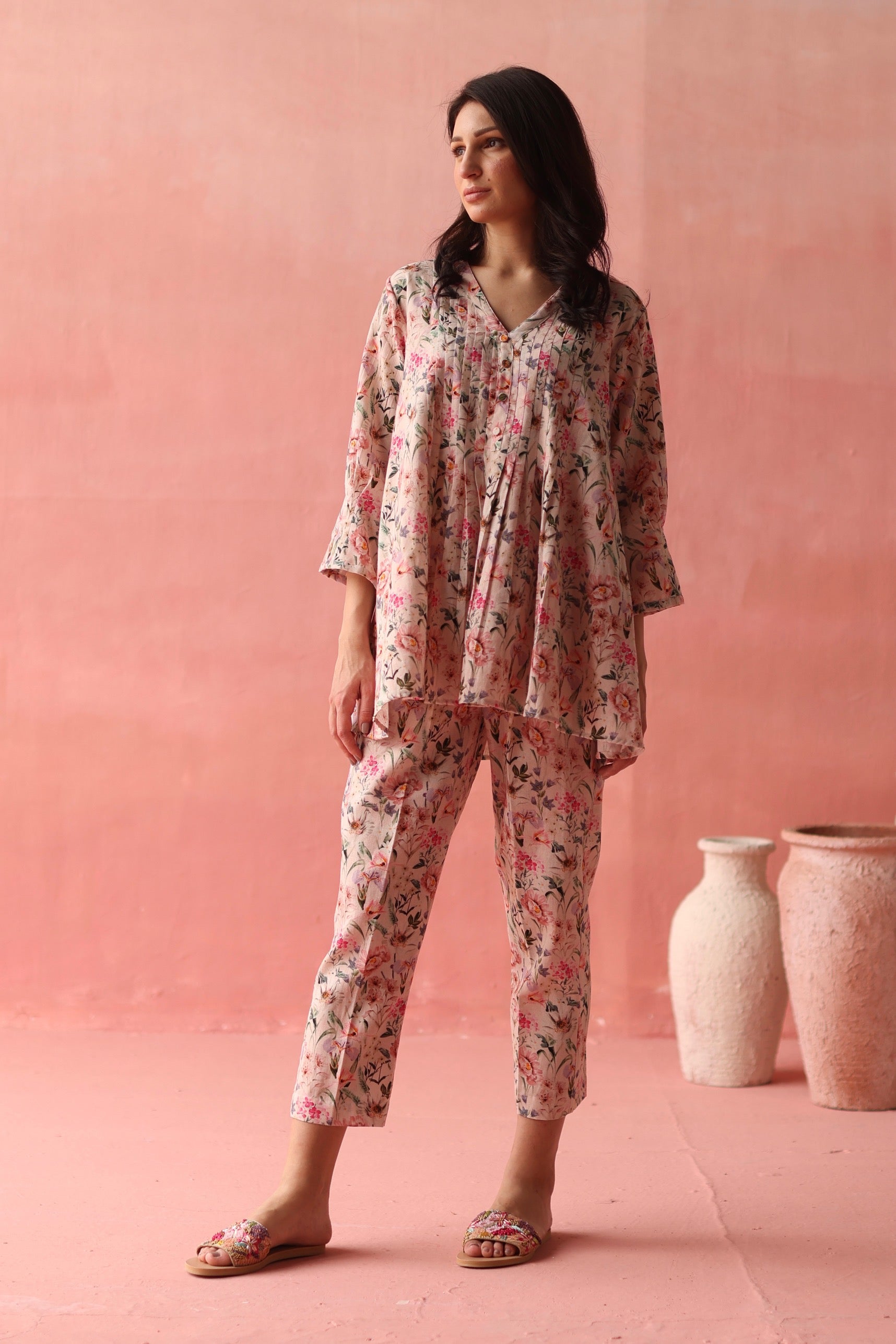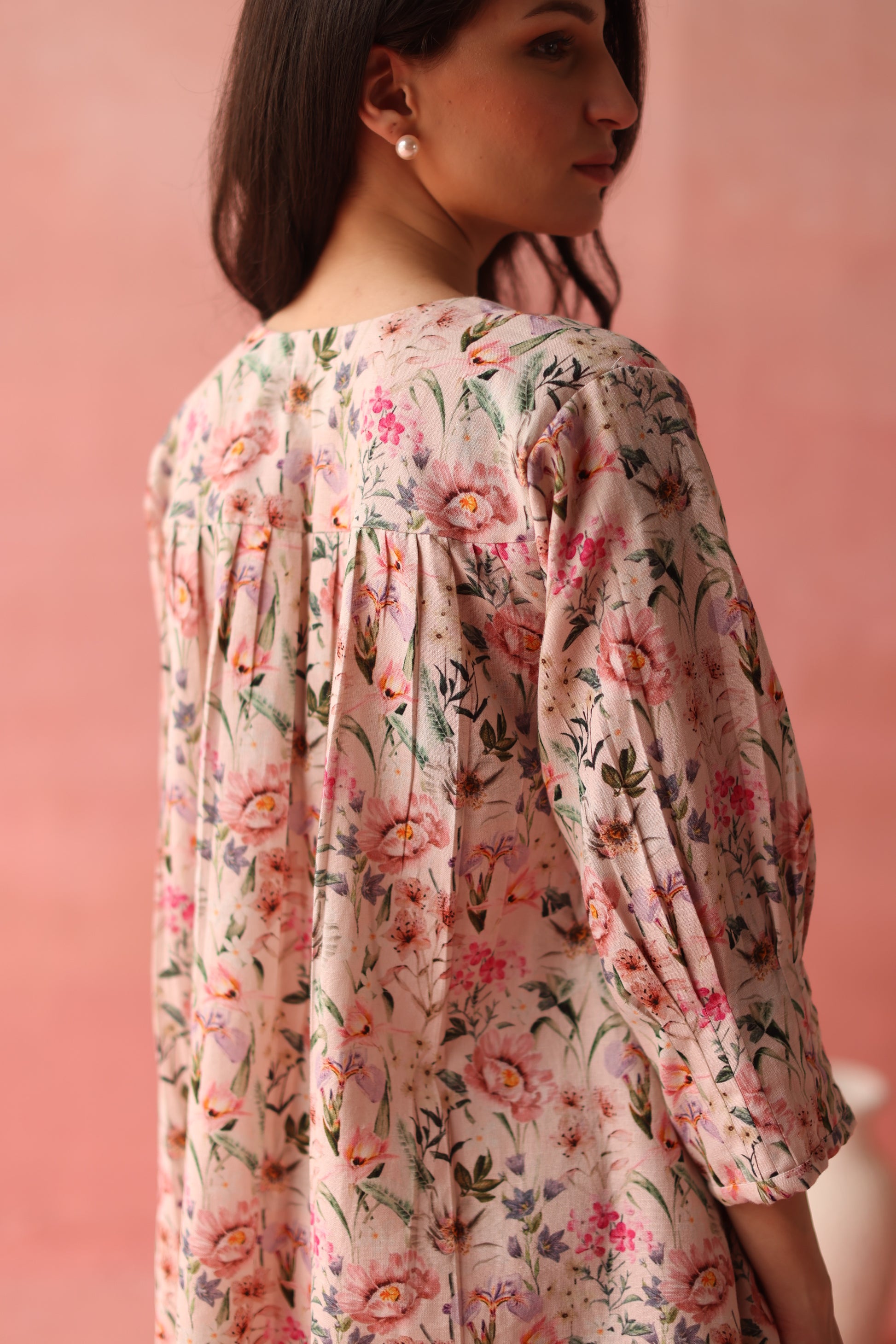 The luzern floral pleated top combines comfort, style, and a playful element with its linen fabric, pleated sleeves, and floral print. The floral print adds a feminine and vibrant element to the top, making it suitable for various occasions by pairing it with luzern pants.