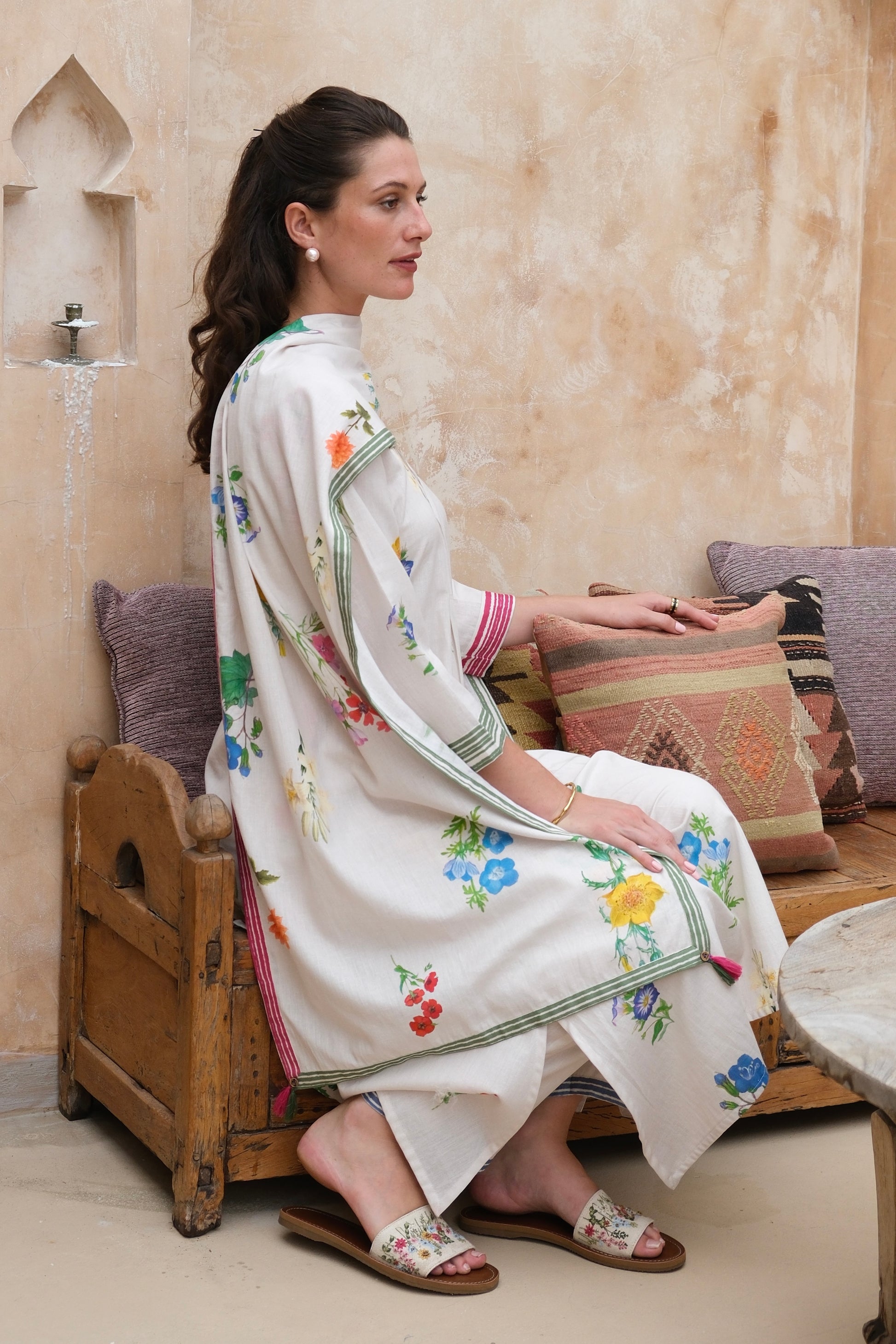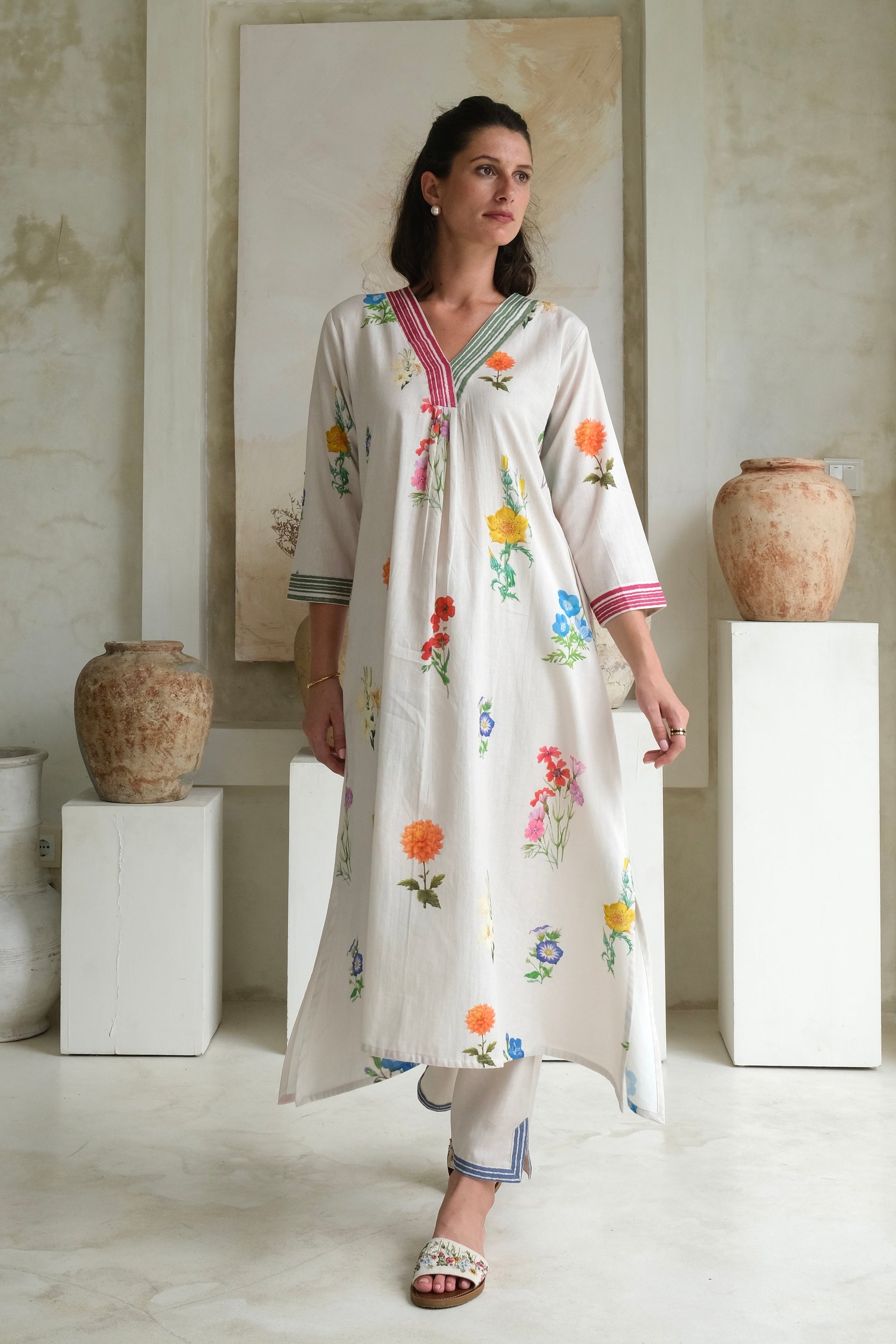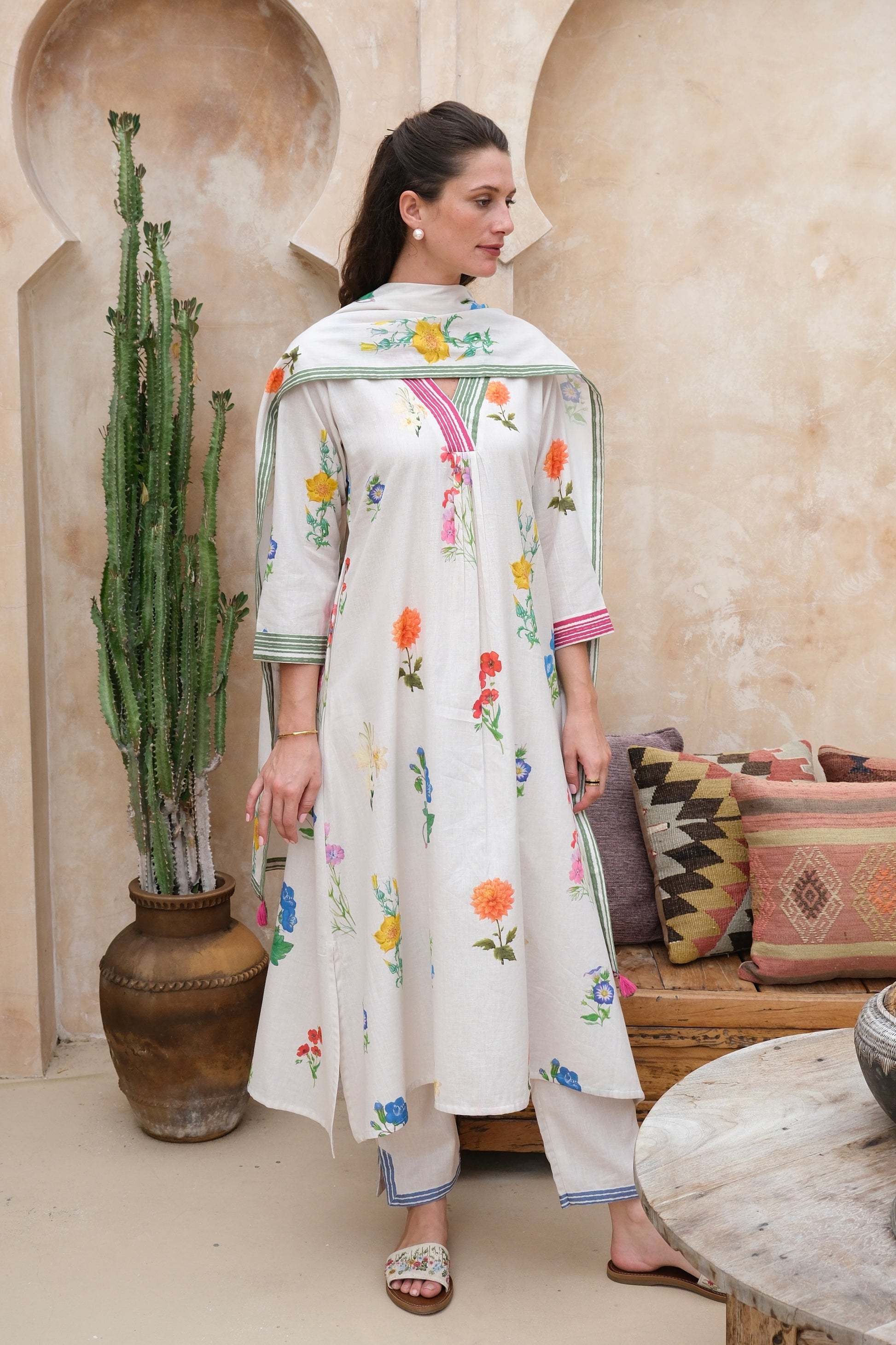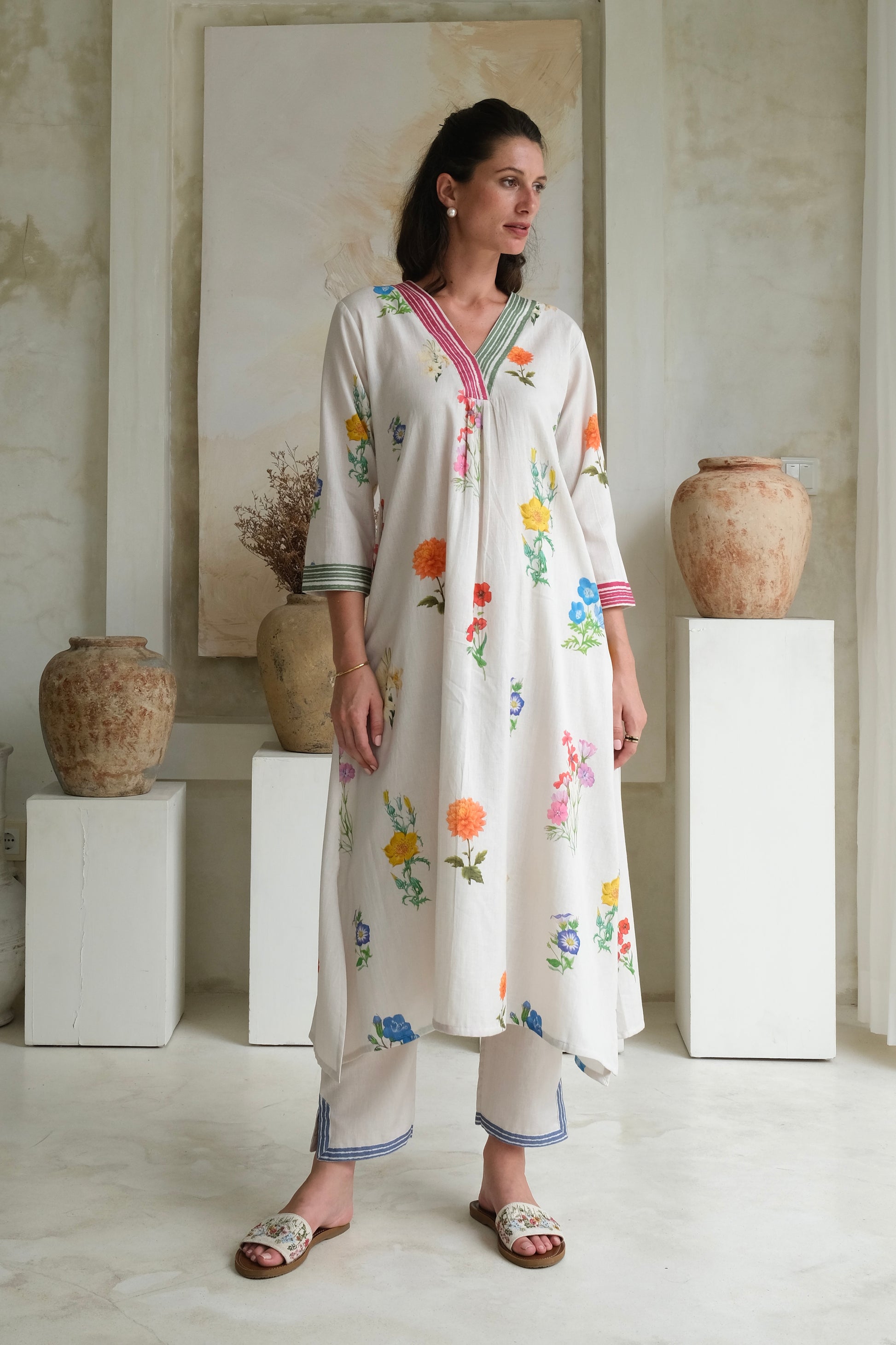 The marigold kurta set effortlessly blends modern design with classic charm. Featuring a contrasting lining border on the neck and cuffs, and adorned with a watercolor floral pattern, it exudes grace and refinement. Paired with straight pants featuring the same border and side slits.