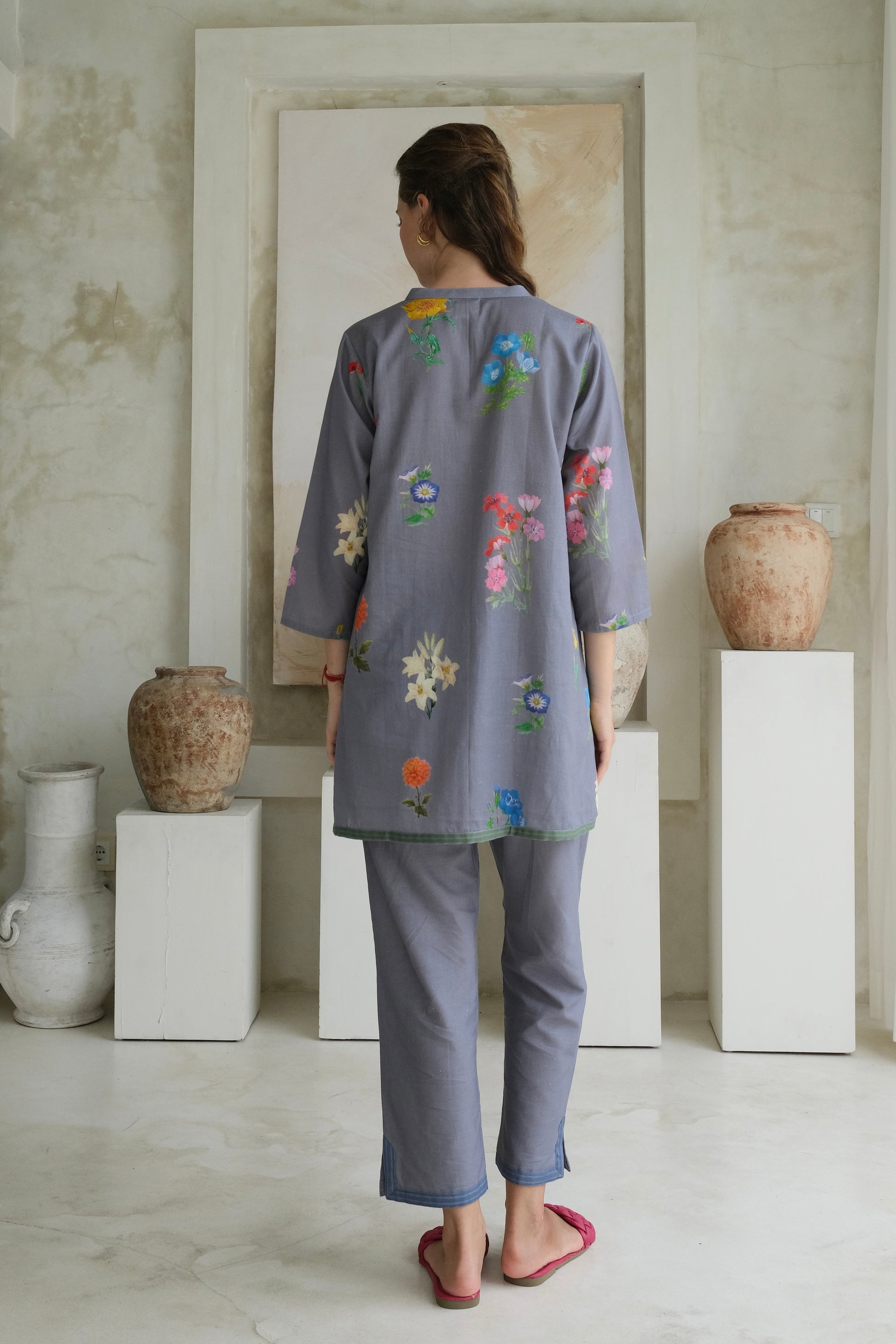 Mid-length tunic with watercolor floral pattern adorned with dainty contrasting hued hand-stitched borders, pair with marigold pants to complete the look.