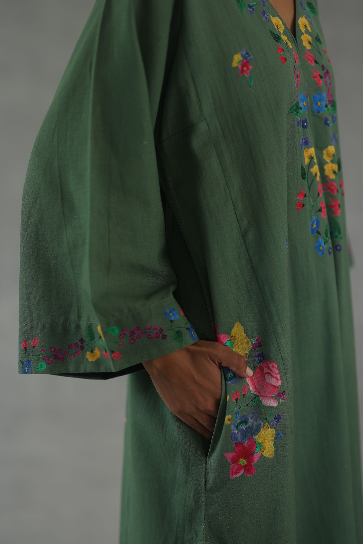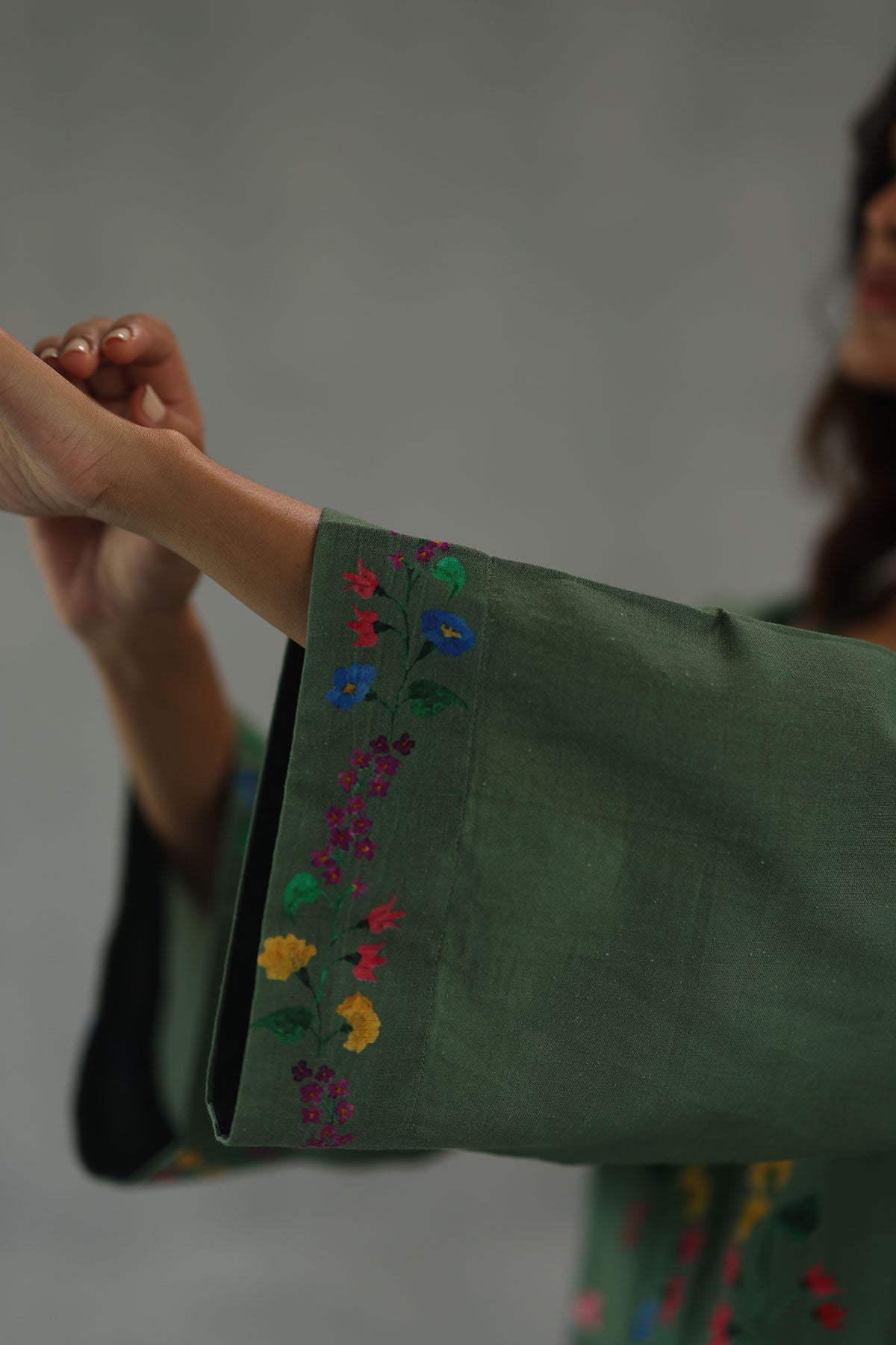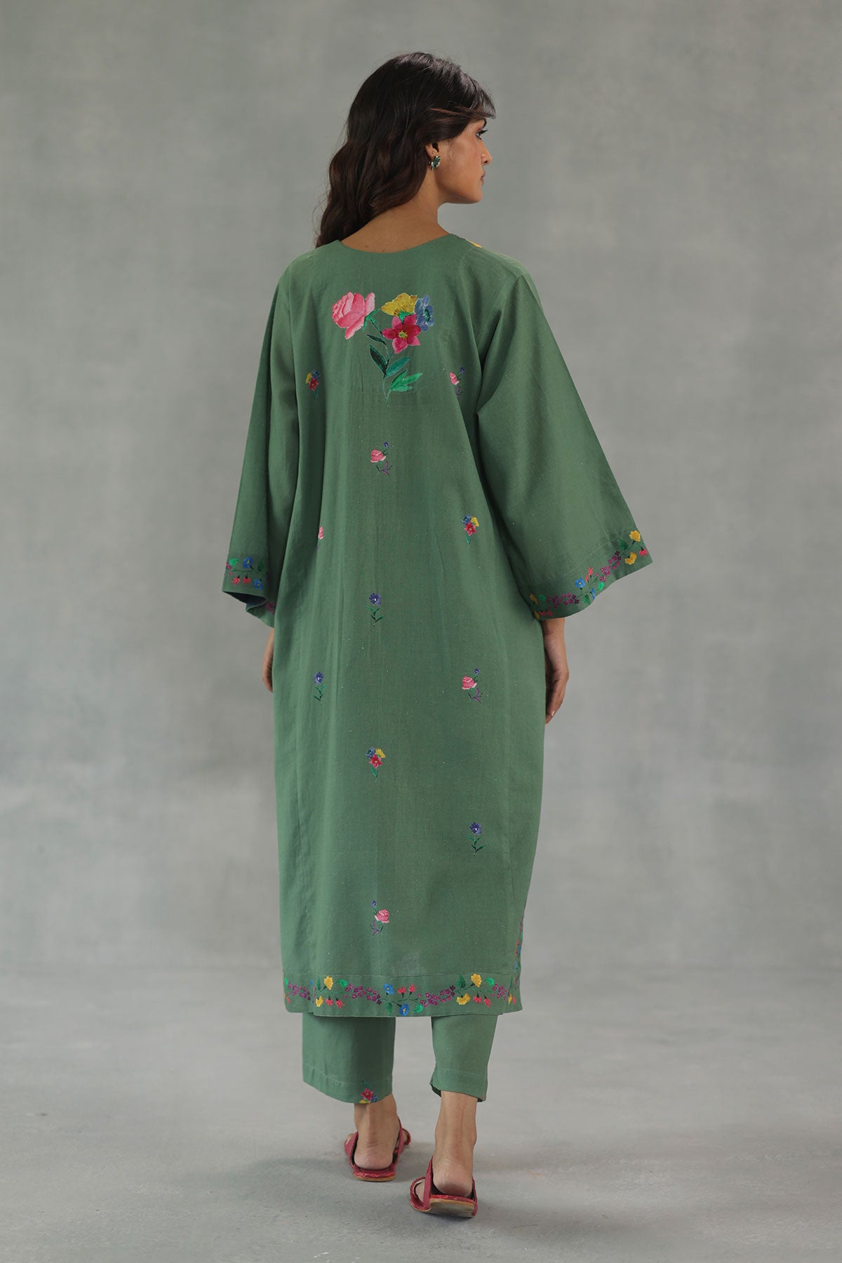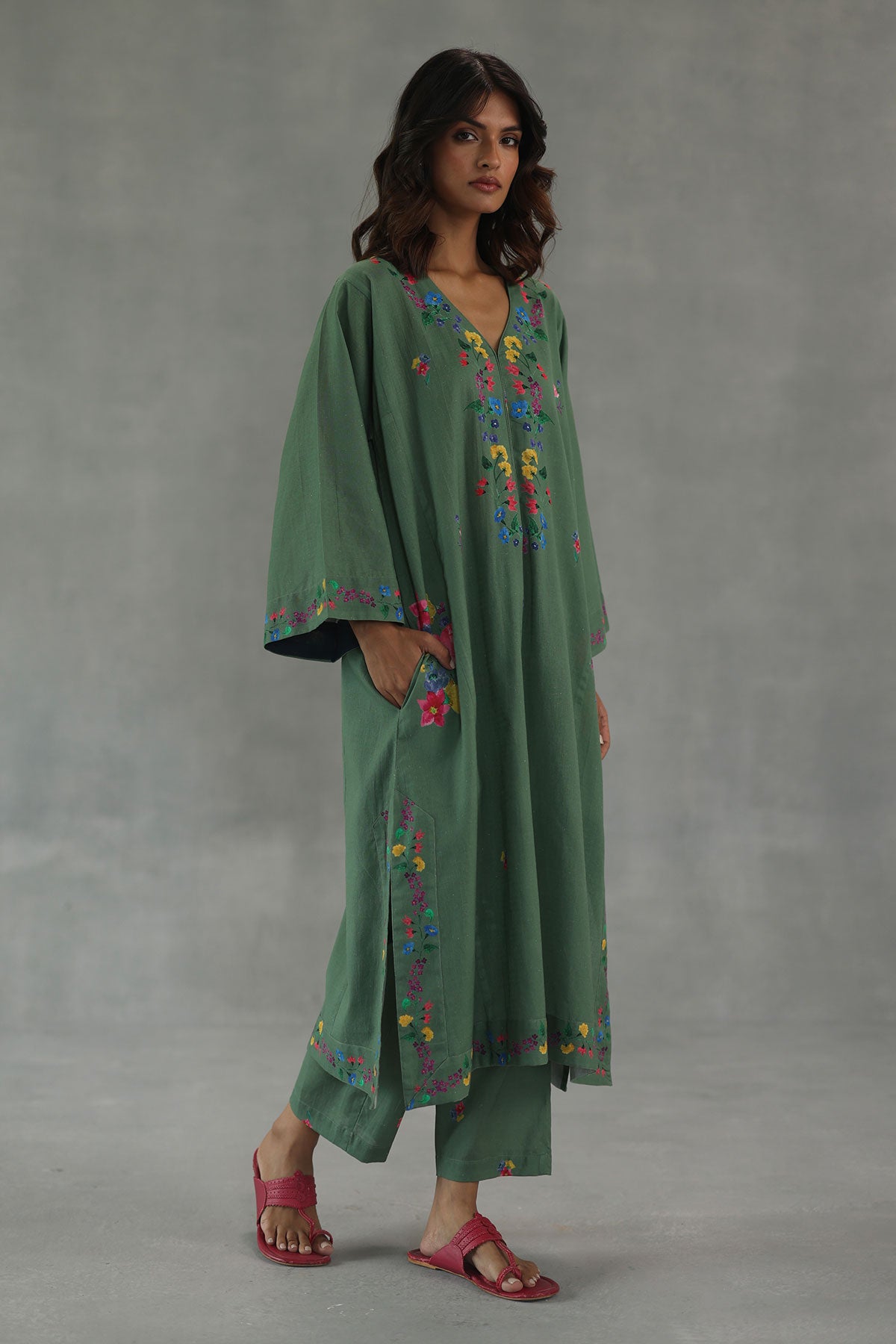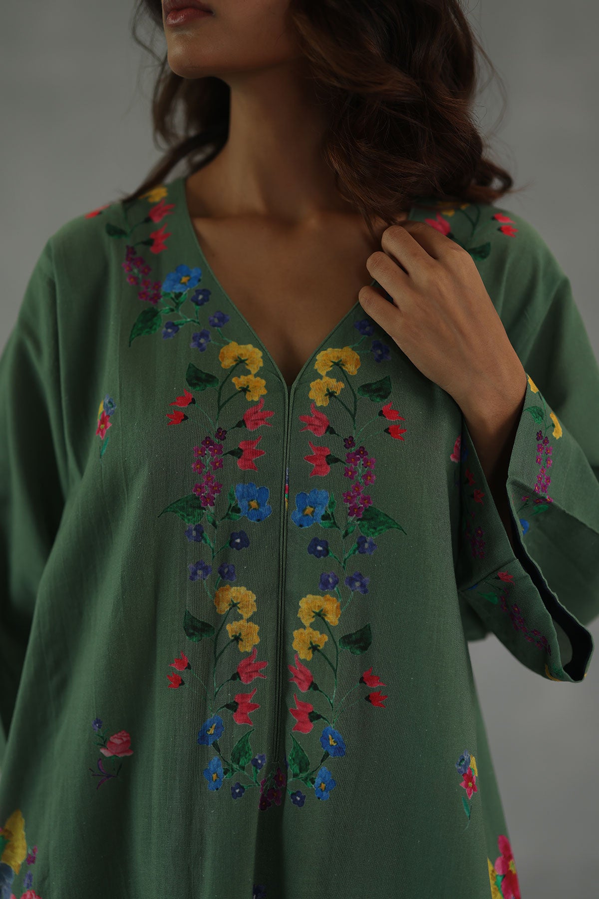 The meadow song phiran set is a signature roza offering, celebrating the timeless elegance of the phiran now central to roza’s design language. Crafted with care, it features exquisite hand-painted florals framing the neckline, intricate motifs on the pockets, and delicate vines along the sweep. Effortlessly versatile, this set moves seamlessly from festive gatherings to quiet, leisurely days capturing the spirit of comfort, beauty, and understated charm.