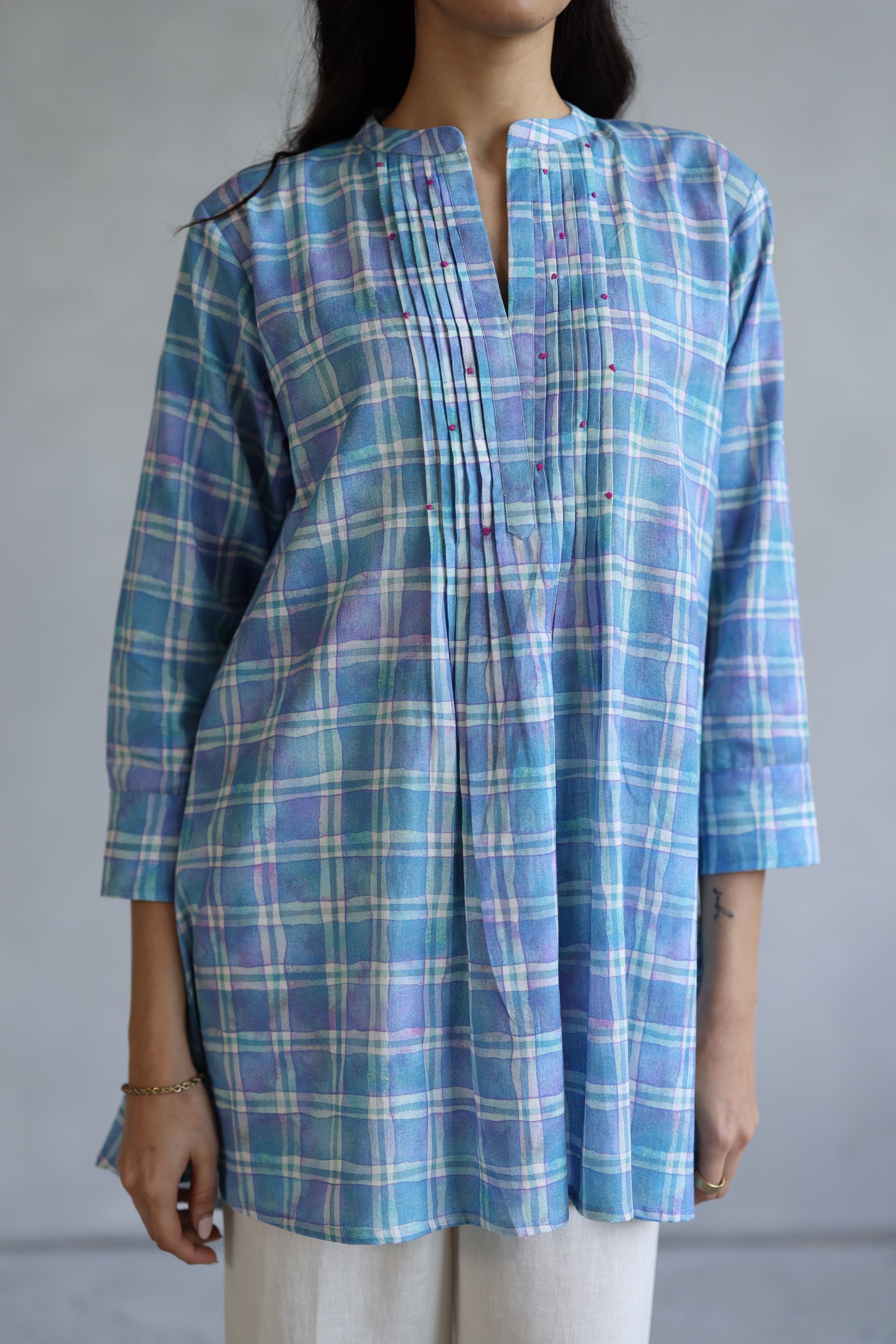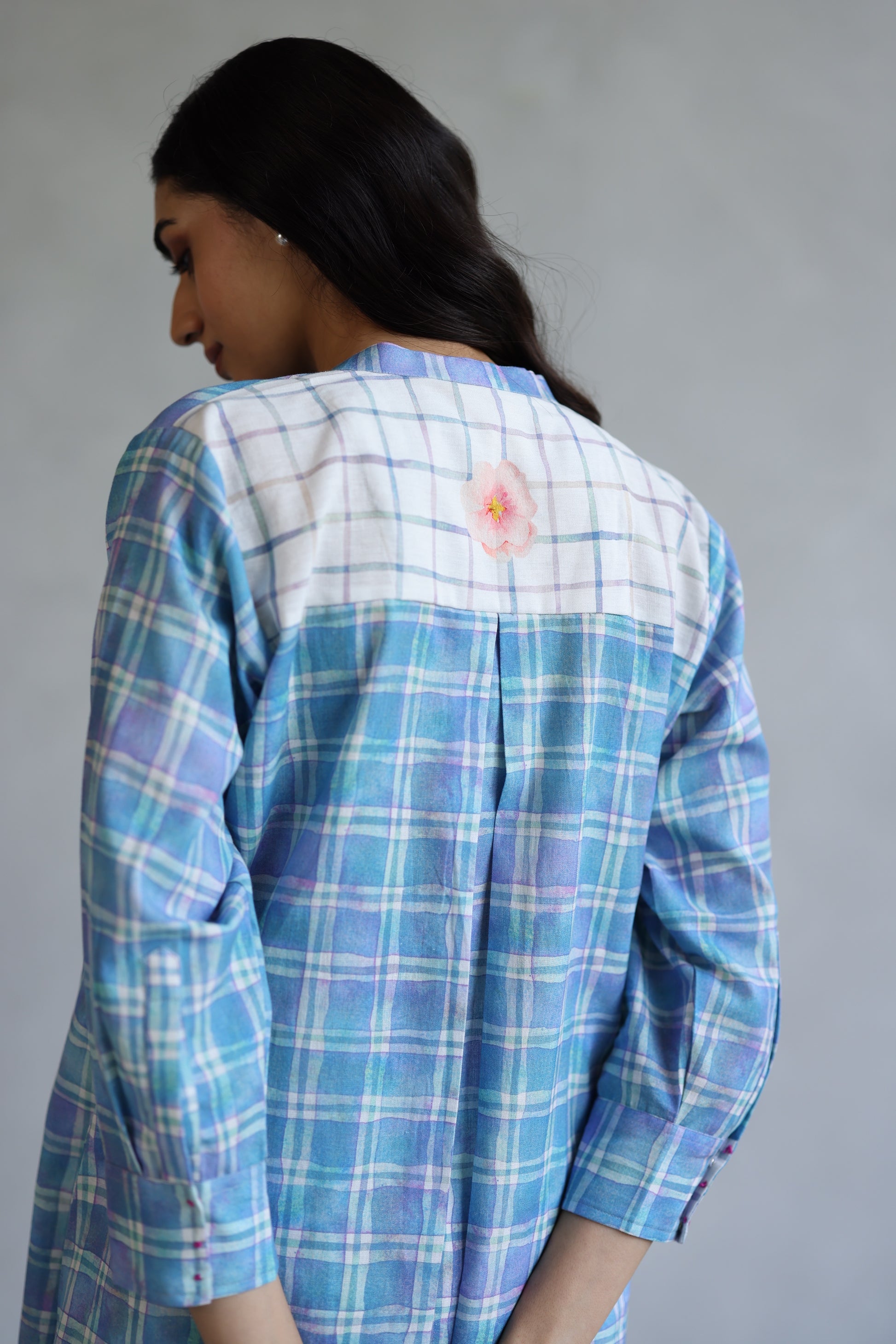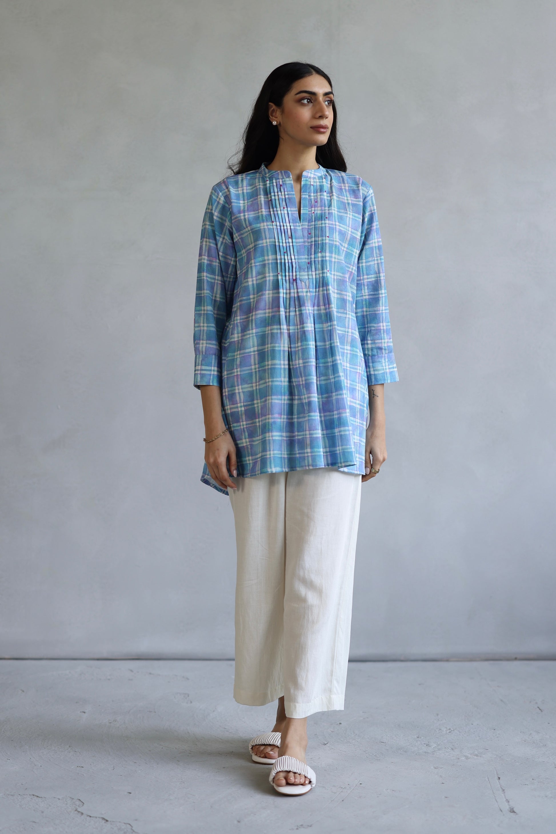 A contemporary take on classic checks, this short-length linen kurta features a blue check print, beautifully accented with delicate pink threadwork dots along the neckline and chest. The structured yet breathable silhouette ensures effortless charm, while the crisp white pants complete the look with understated elegance. A perfect blend of modern design and timeless comfort.