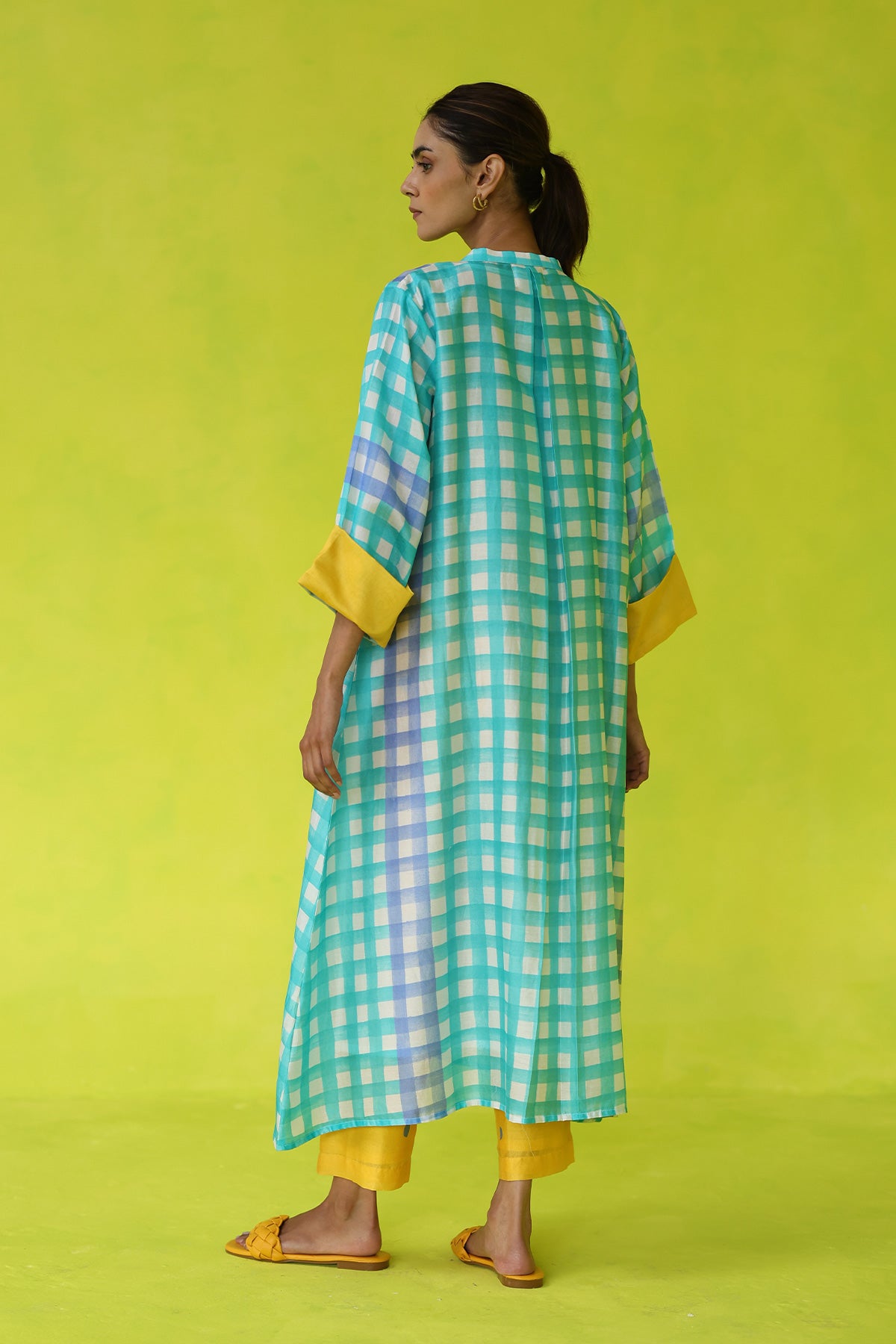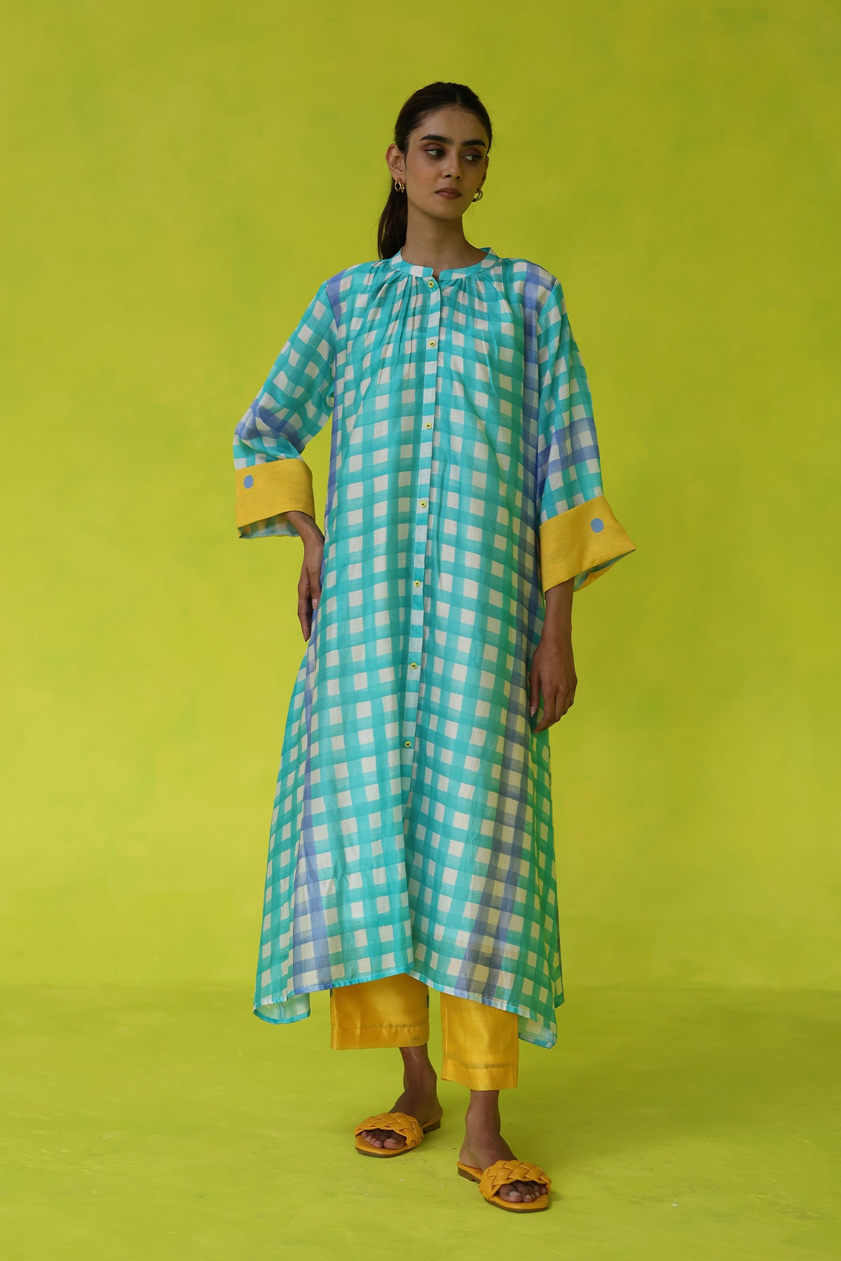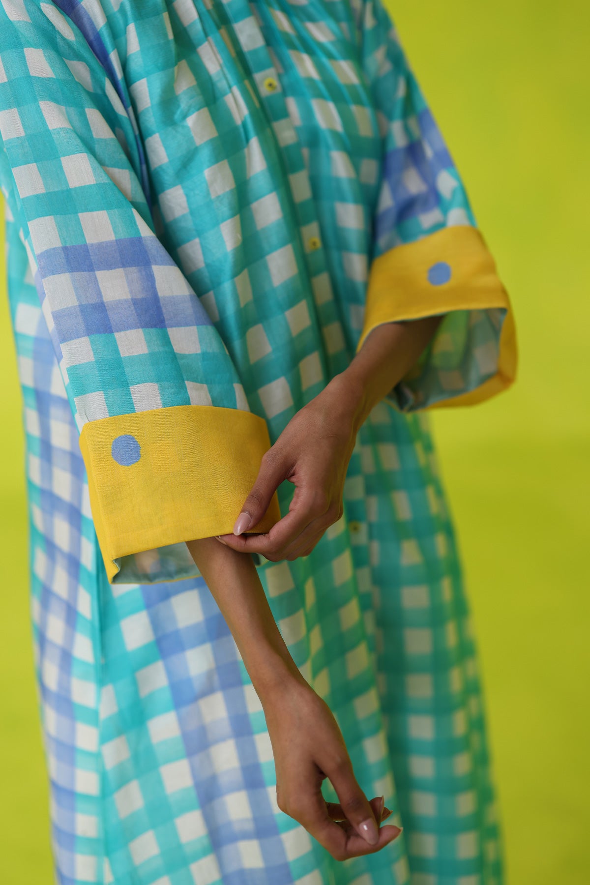 Inspired by coastal elegance, the monaco co-ord brings together watercolor aqua checks with delicate yellow pops and dainty polka dots for a look that’s both fresh and sophisticated. The kurta’s breezy silhouette offers an effortless flow, while the yellow pants bring subtle playfulness with their own polka dot accents. Whether styled as a formal co-ord for work events or worn solo as a chic dress, this set is versatile, vibrant, and ready for both professional settings and evening outings.