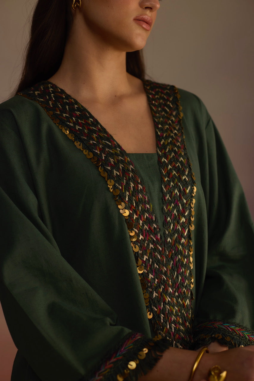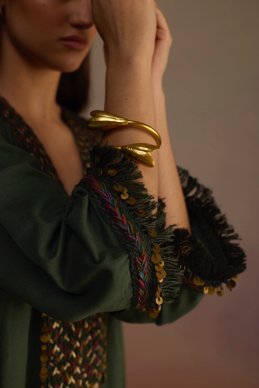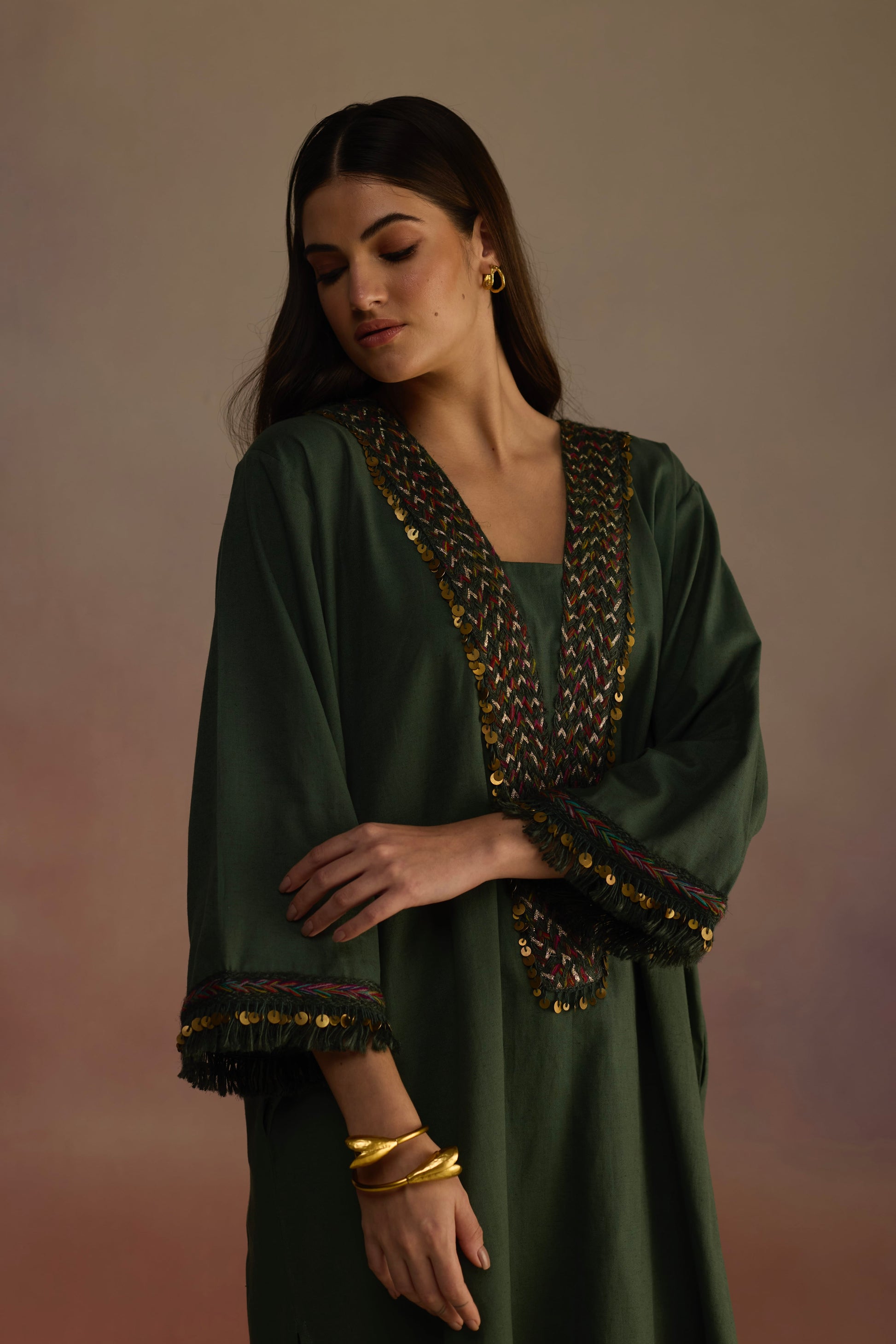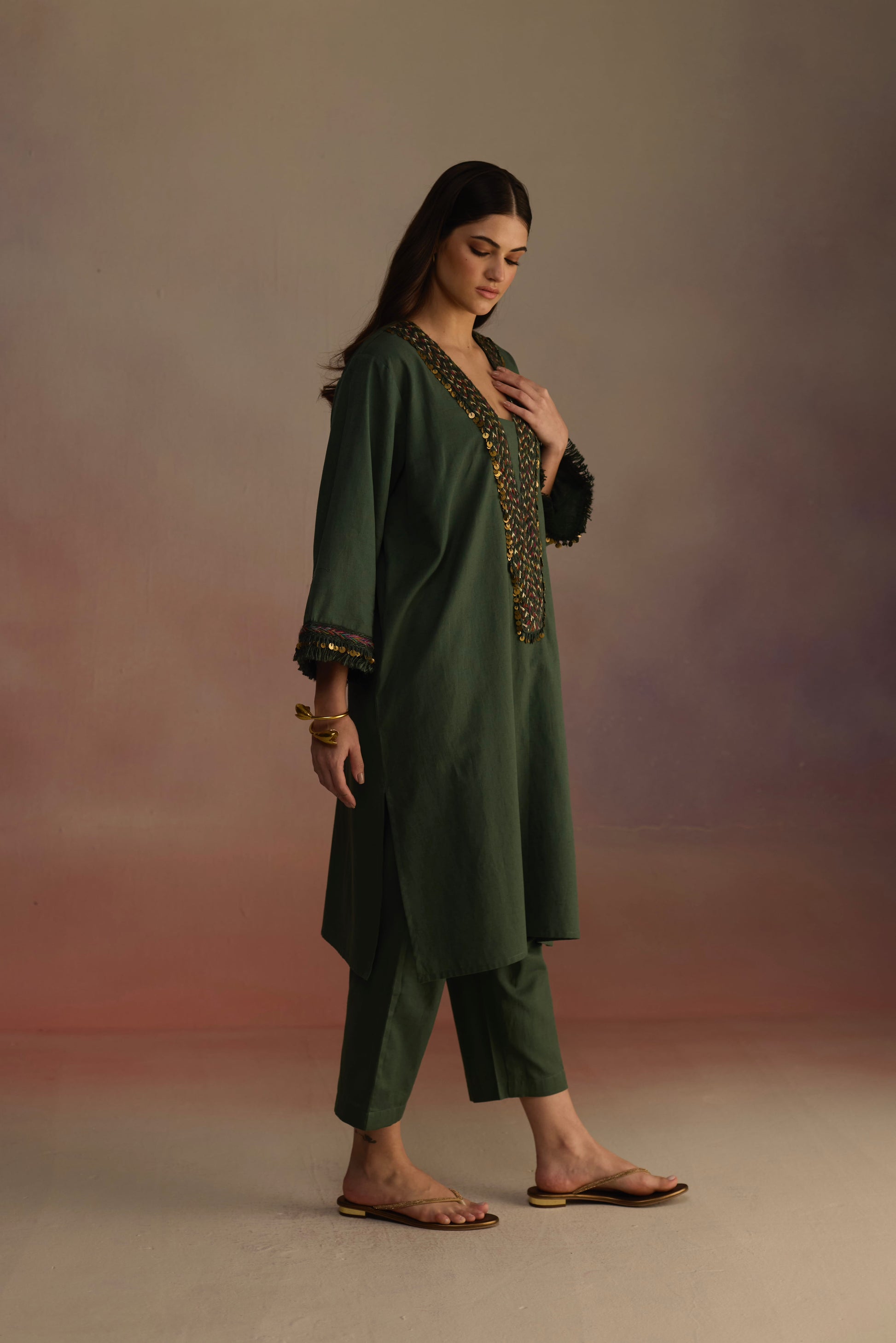 The Neroli kurta set, adorned with glitter and jute braids along with gold trimmings makes for a stand-out choice for the festivities.