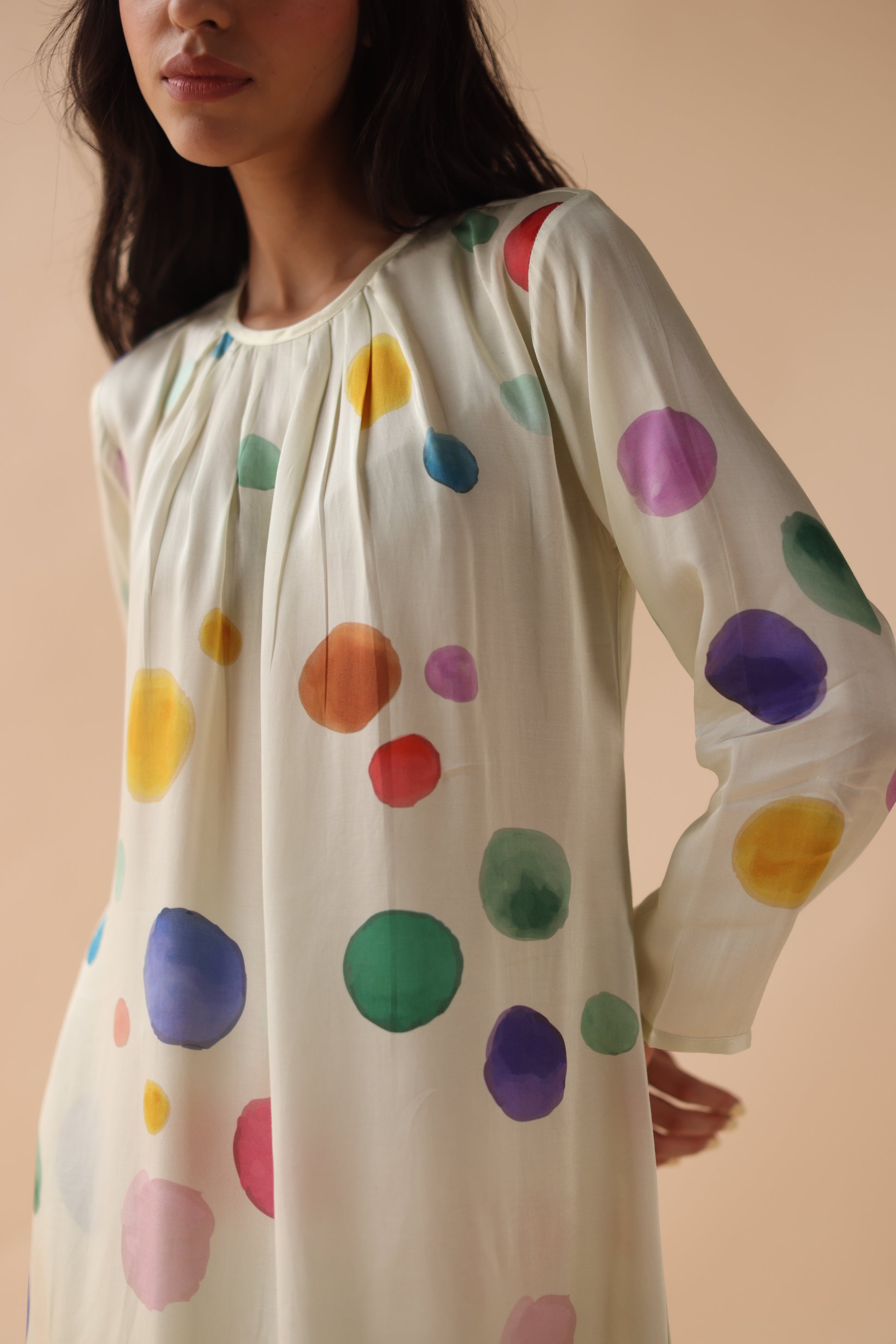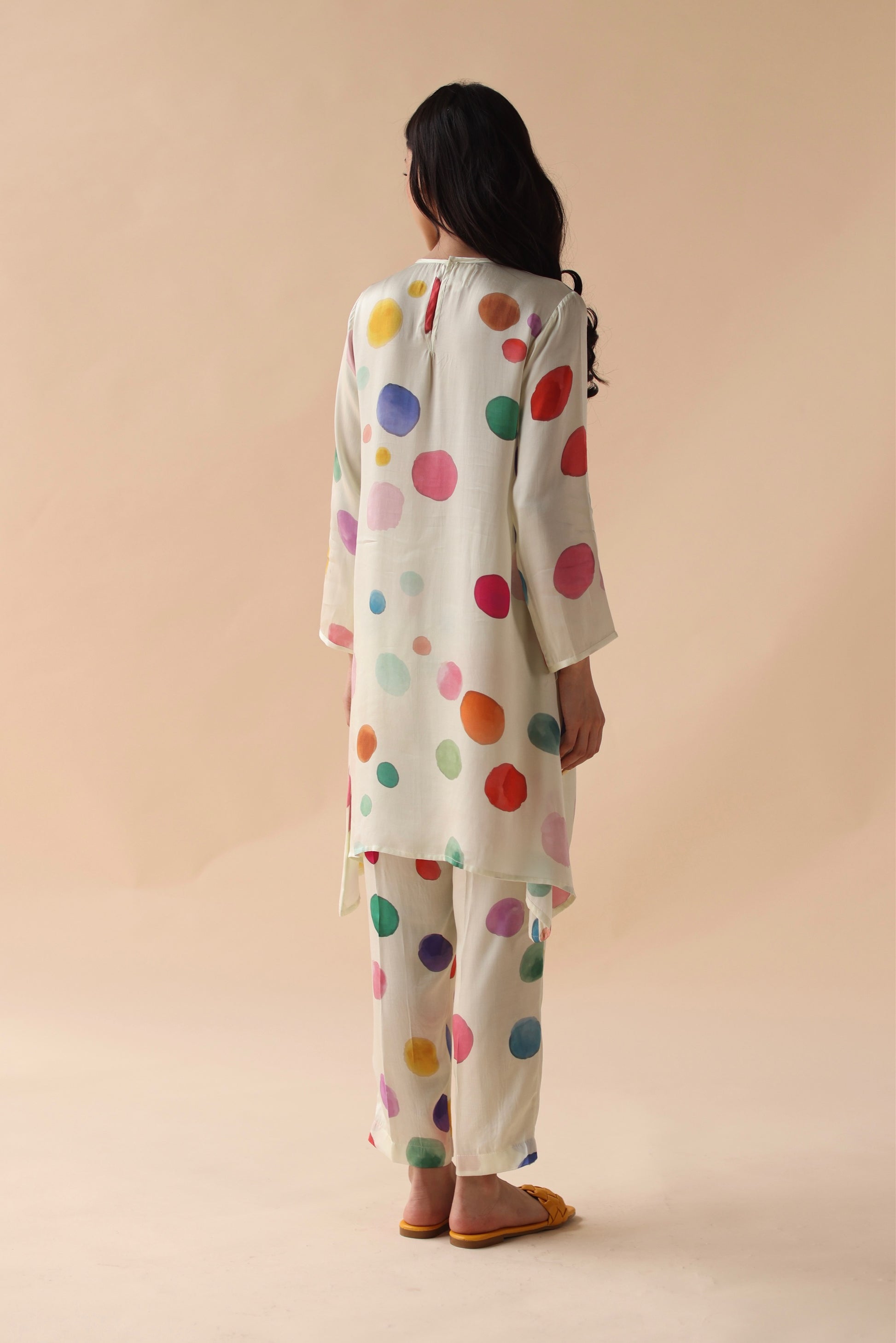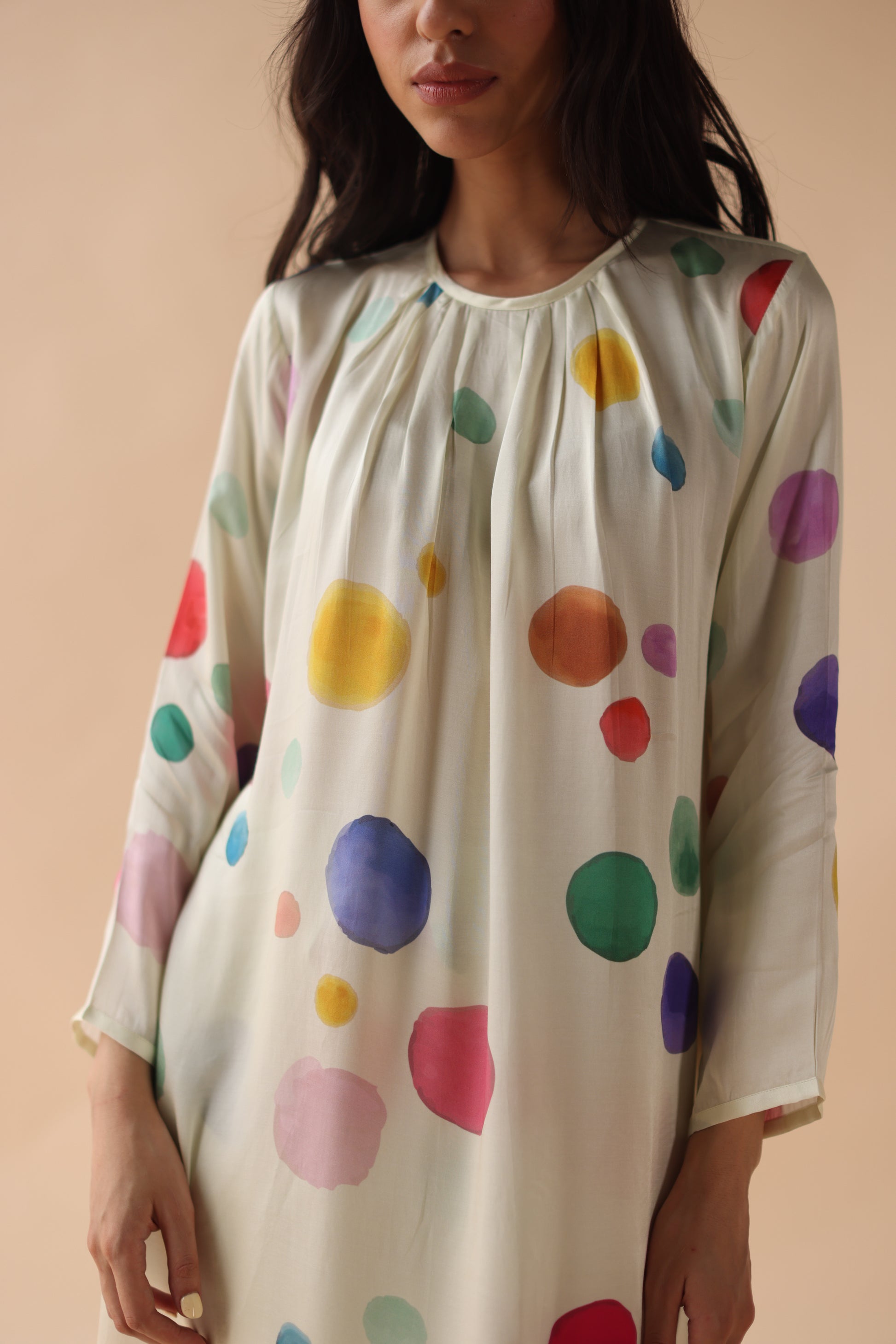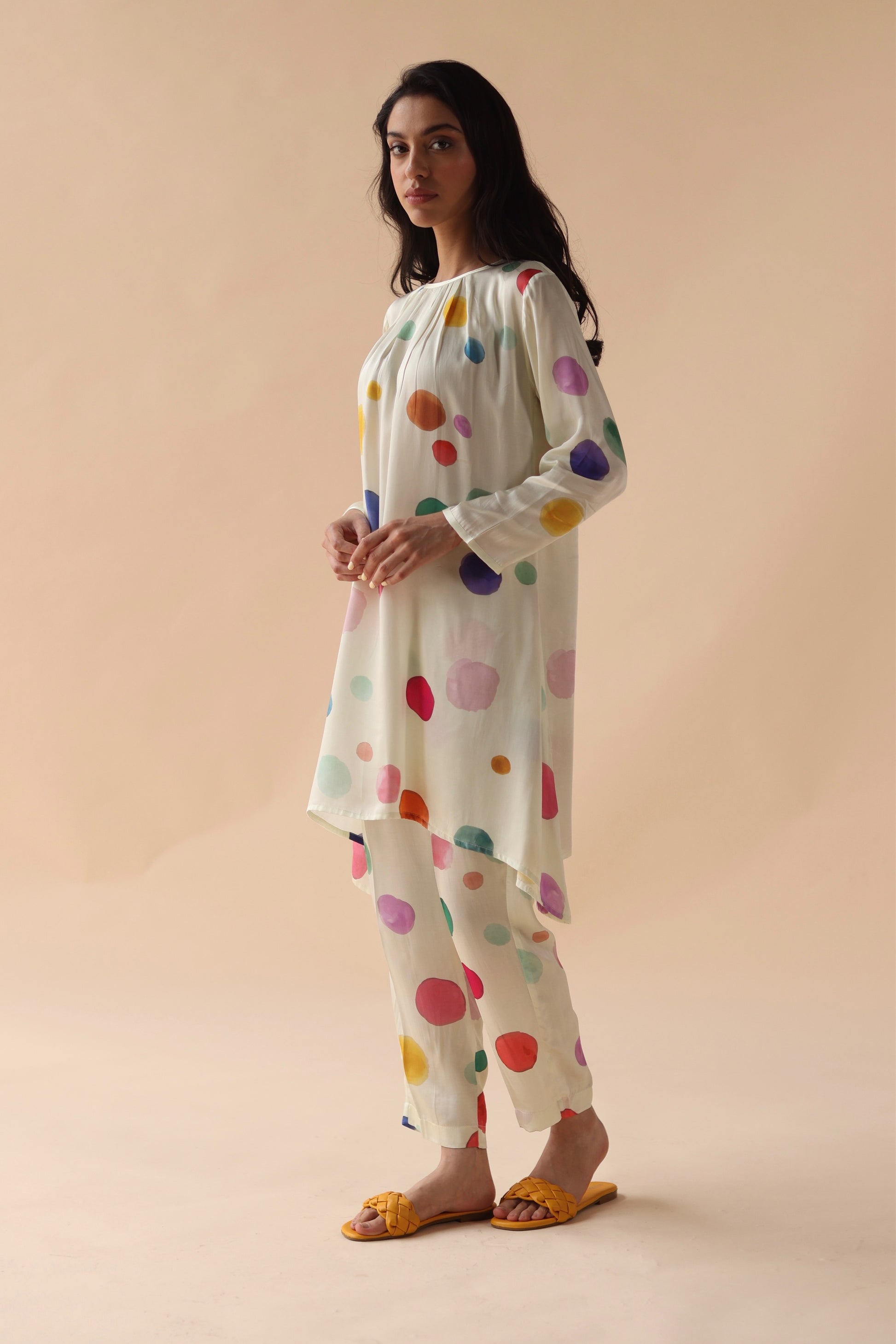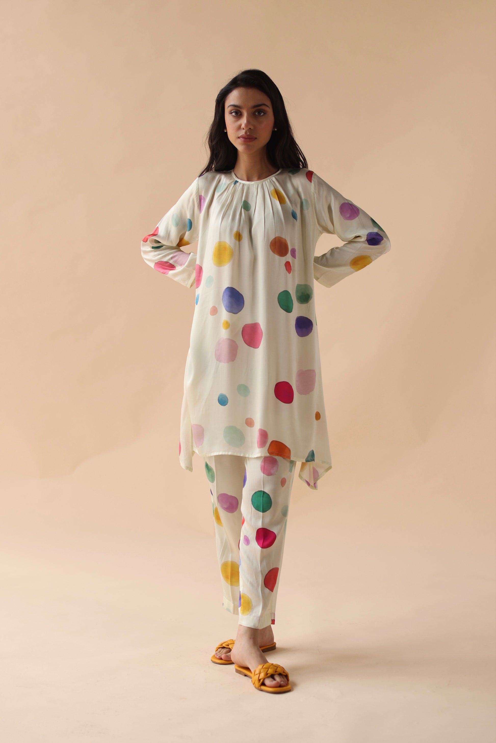 The noã©me co-ord set has a polka dot watercolour print made on the finest satin silk fabric. An a-line tunic with gatherings in the round neckline complemented with comfort fit straight pants makes for the perfect sunny day outfit.