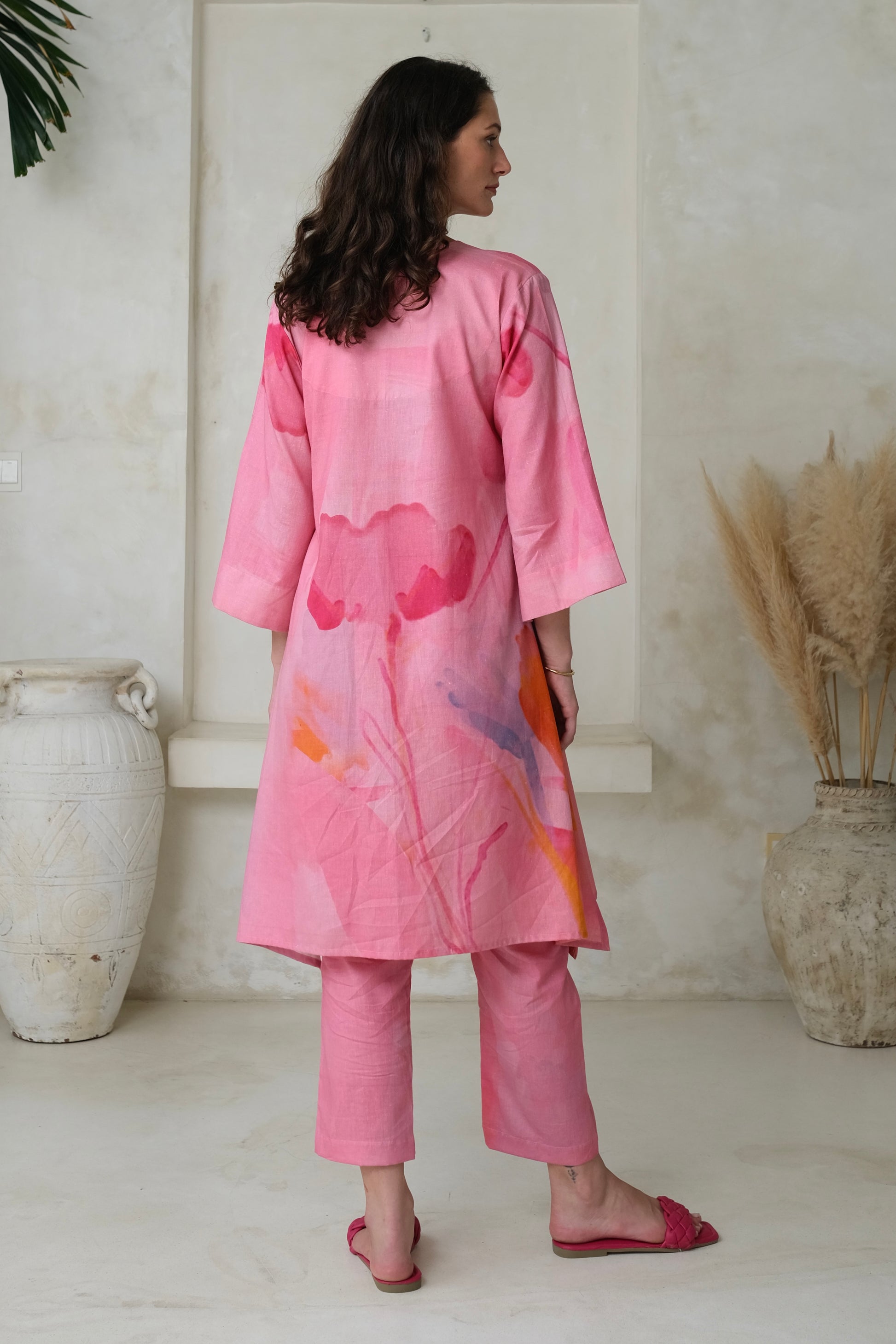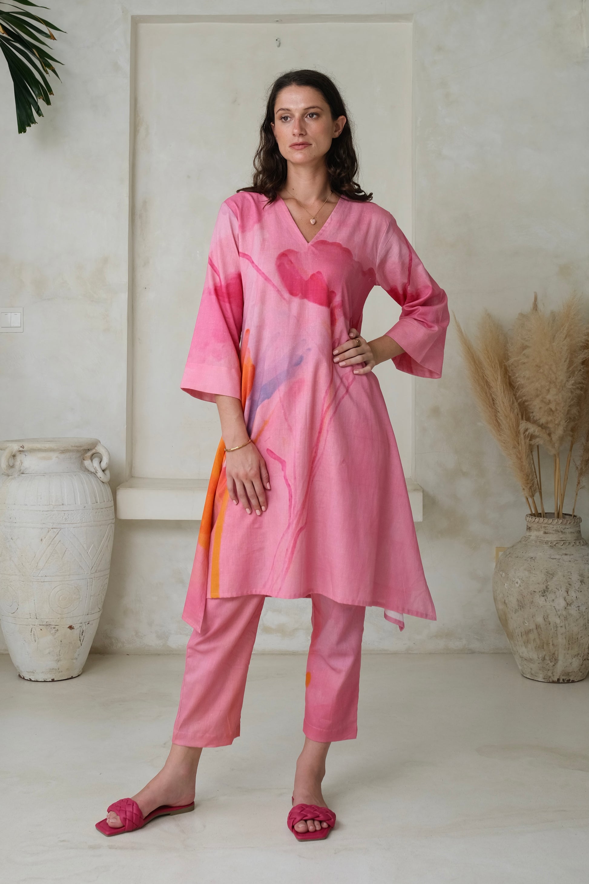 The nova kurta set is a linen dream with a v-neckline and abstract watercolor flowers in vibrant pink and orange hues. Paired with chic pink pants, it’s the perfect blend of lounge and comfort!