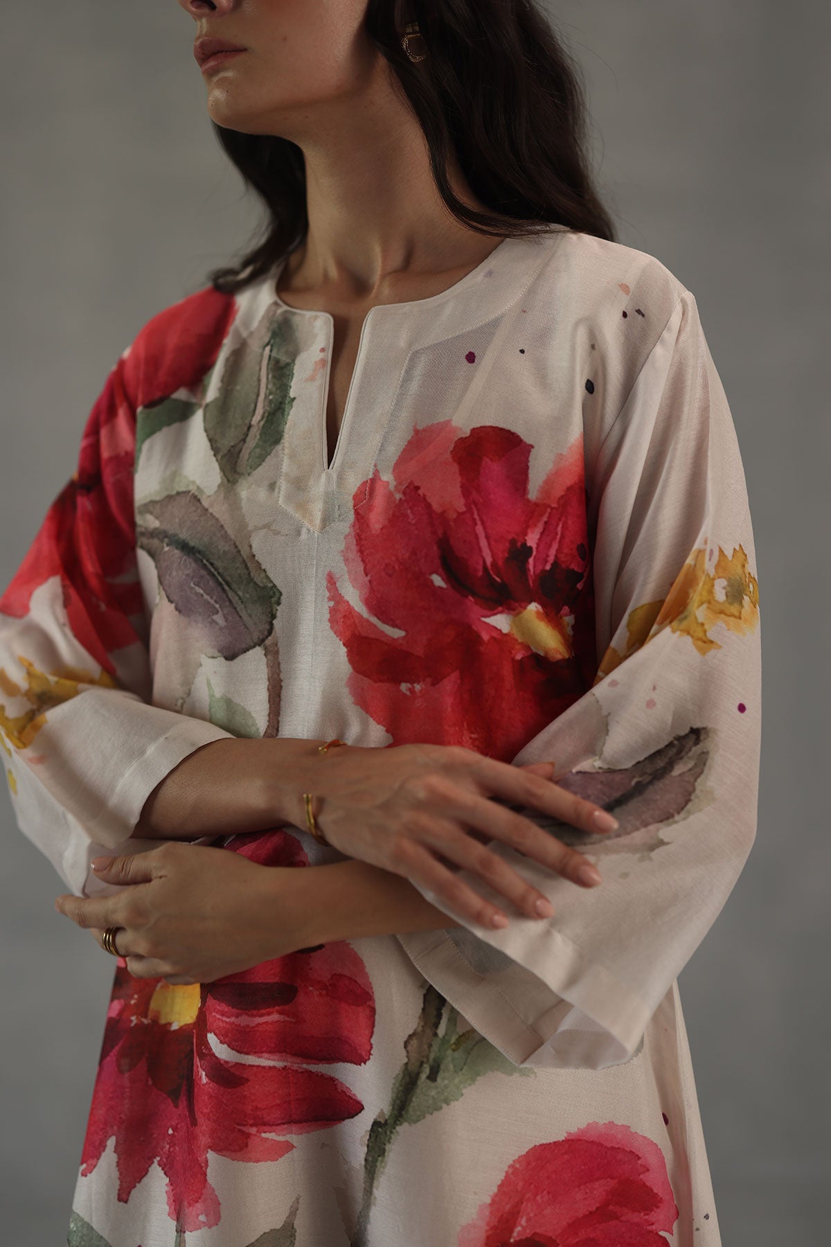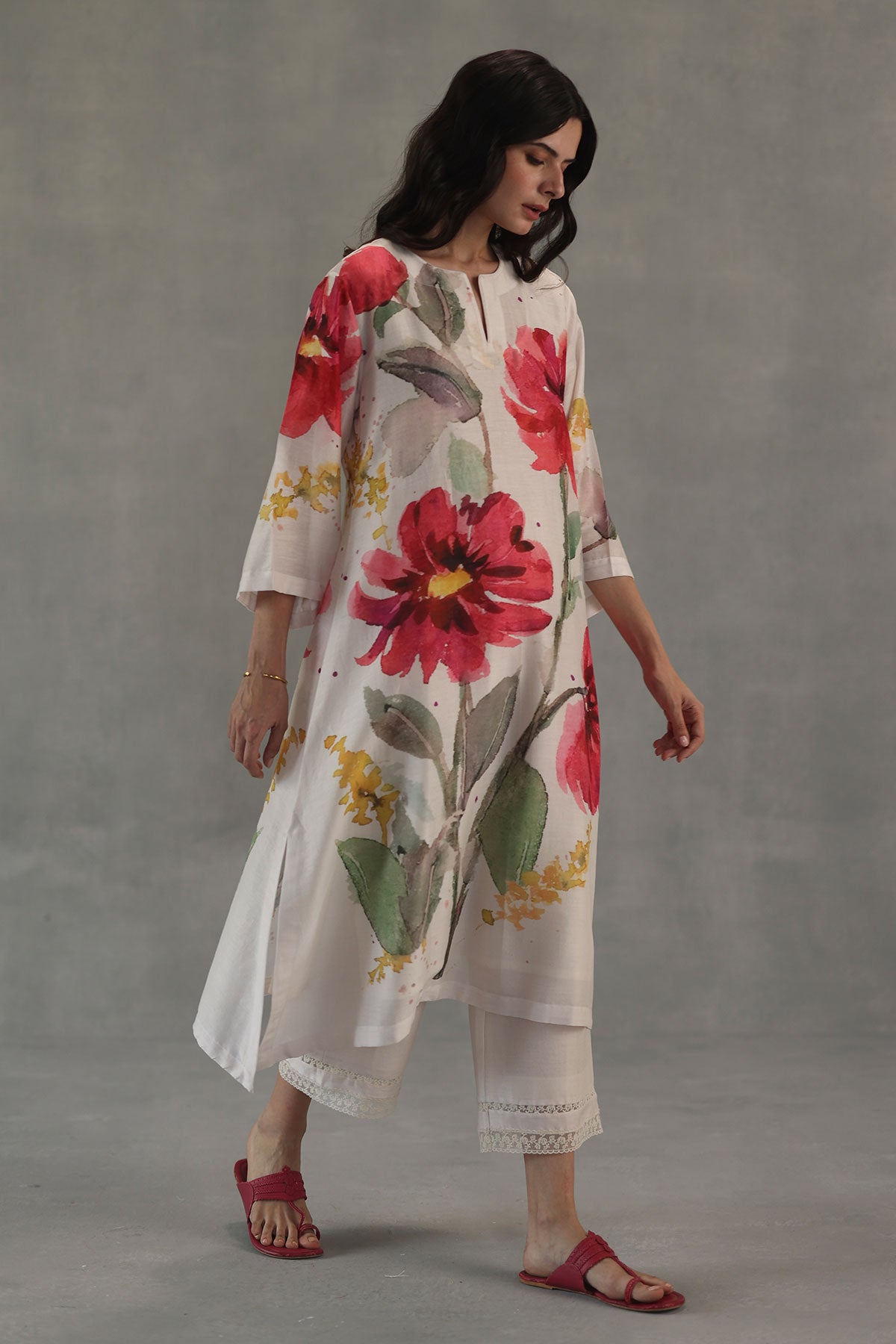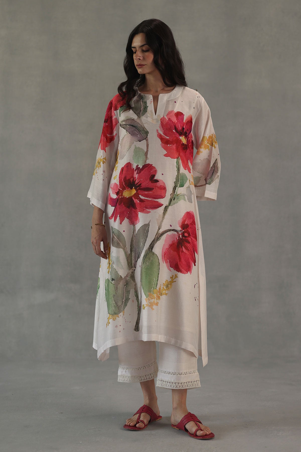 A vibrant expression of artistry, the olivia kurta set is crafted in soft chanderi and brought to life with bold watercolor florals in striking shades of red. The fluid brushstrokes create a painterly charm across the kurta, while the tapered pants, finished with delicate gossamer lace trims, add a touch of finesse. An effortless blend of color and elegance, this set makes a statement without trying too hard.