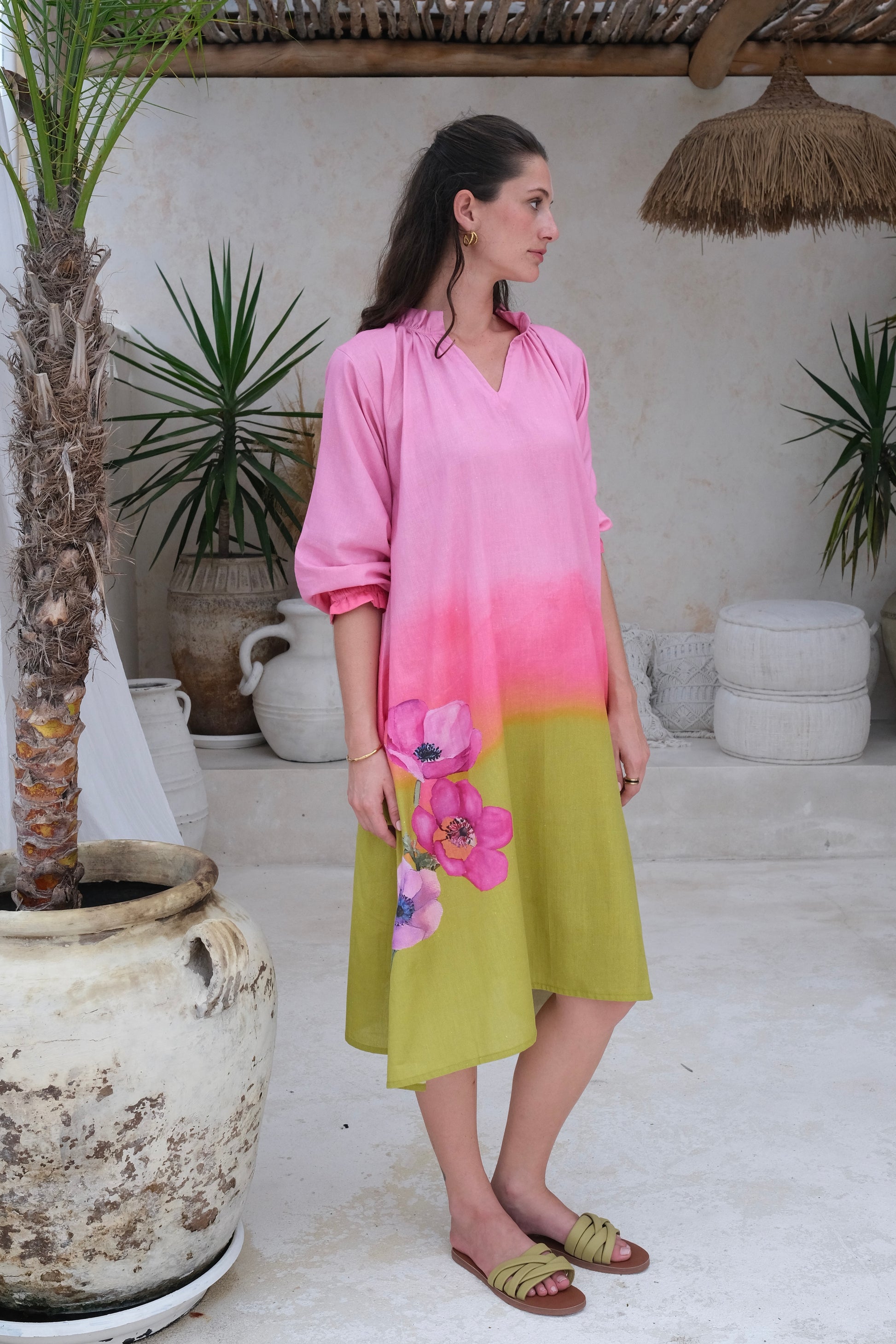 The orion dress features an open front panel, pleated cuffs and neck, and flows from soft pink to fluorescent pink to lime in ombre notes. A bunch of hand sketched flowers on the sweep adds to the look.