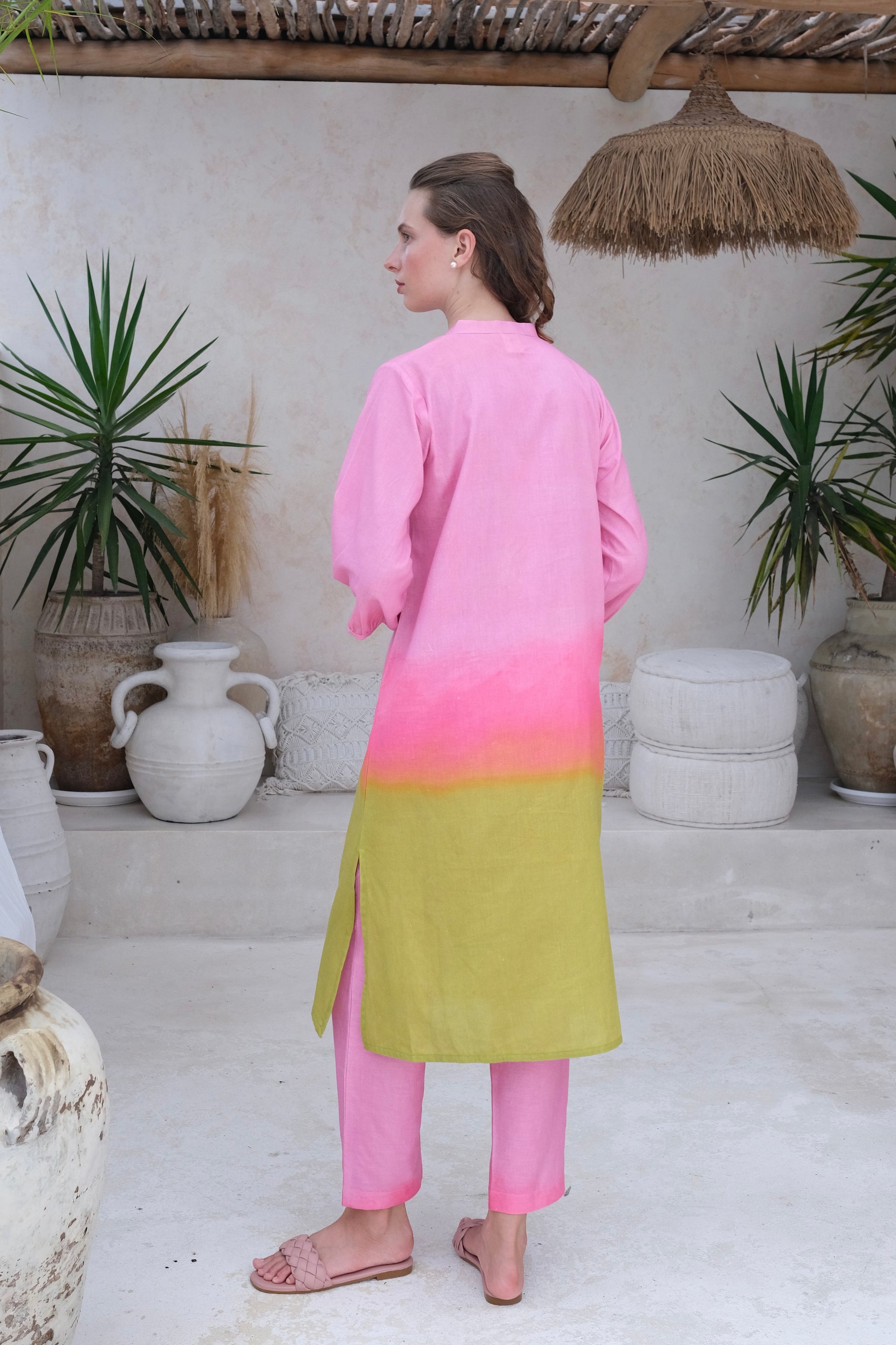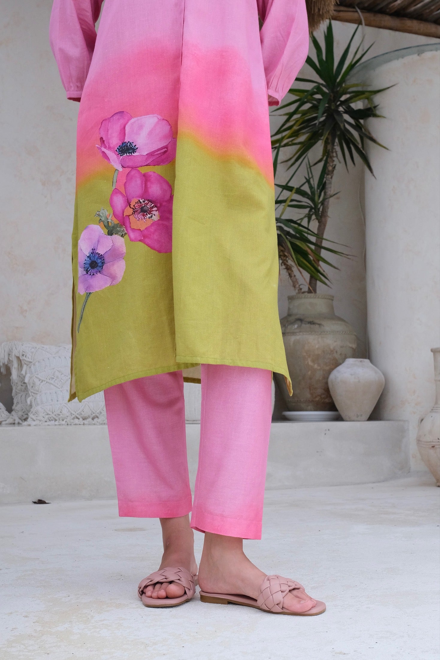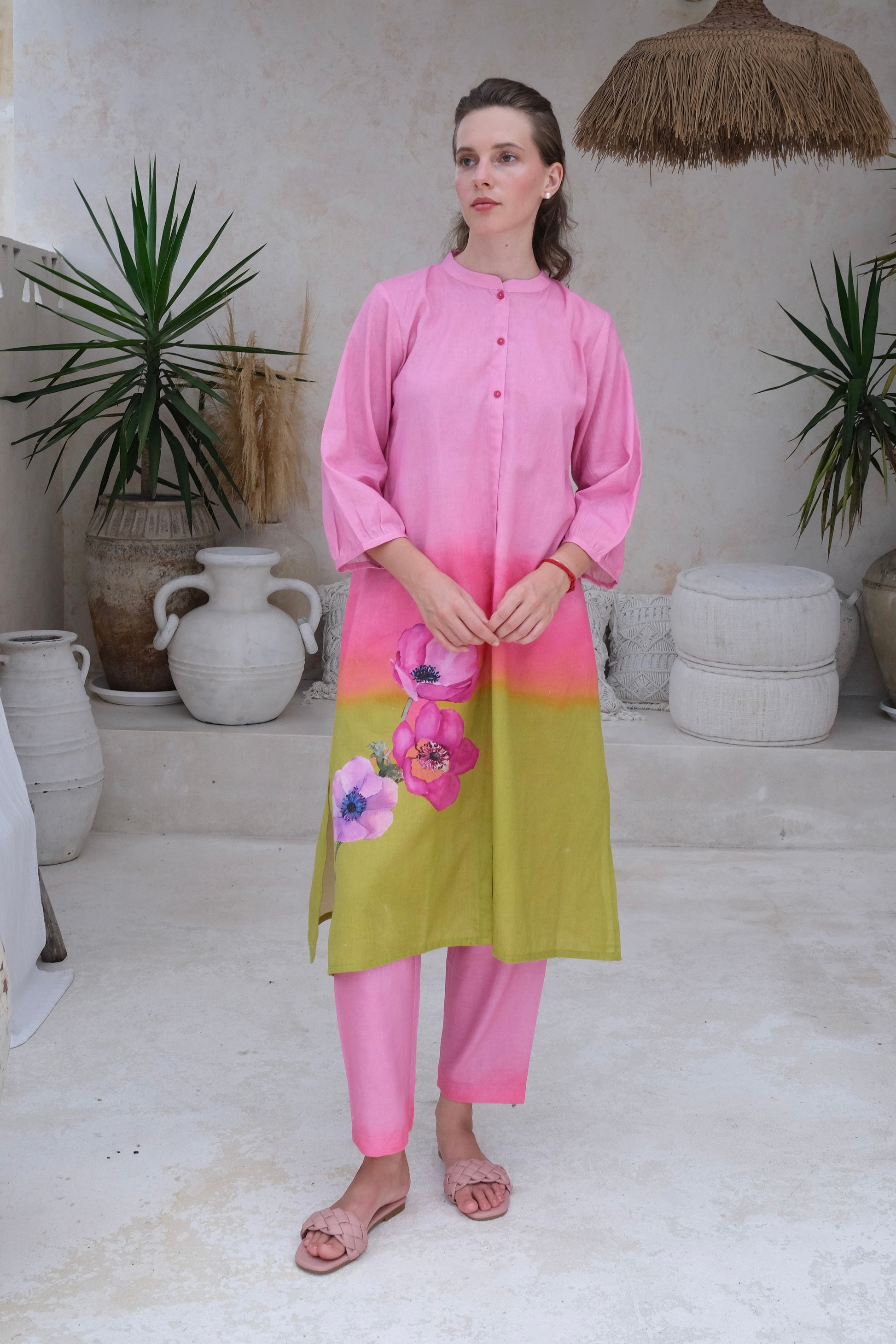 The linen set features a front panel open neck, pleated cuffs, and flows from soft pink to fluorescent pink to lime in ombre notes. A bunch of hand sketched flowers on the sweep along with straight pants add to the look.