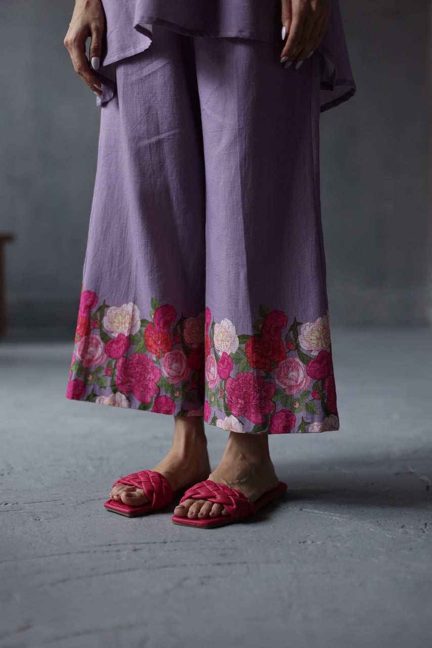 Peony pants with a relaxed, wide-legged fit and watercolour vine at the hemline is designed to effortlessly complete your day-to-night look when paired with our tops and tunics.