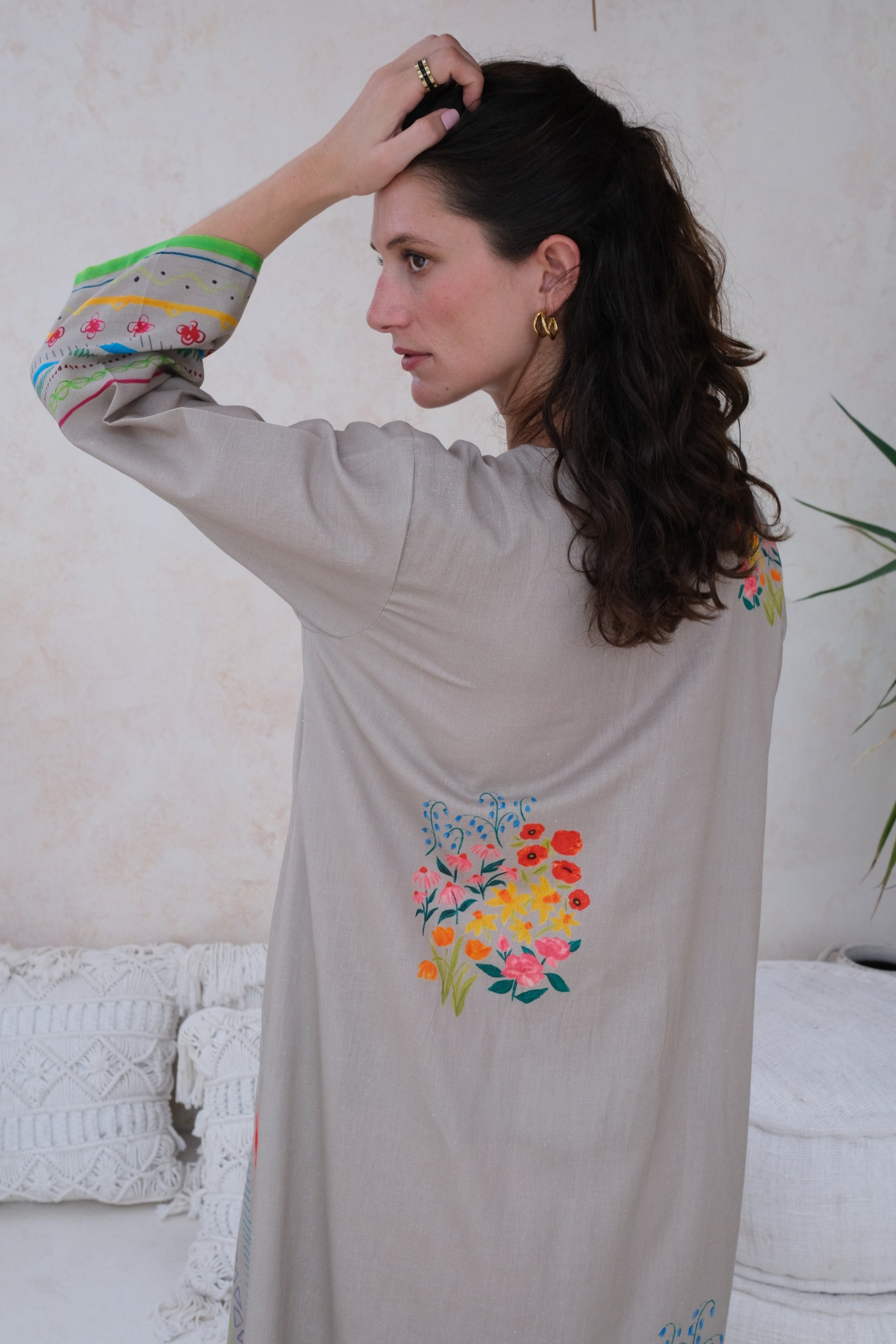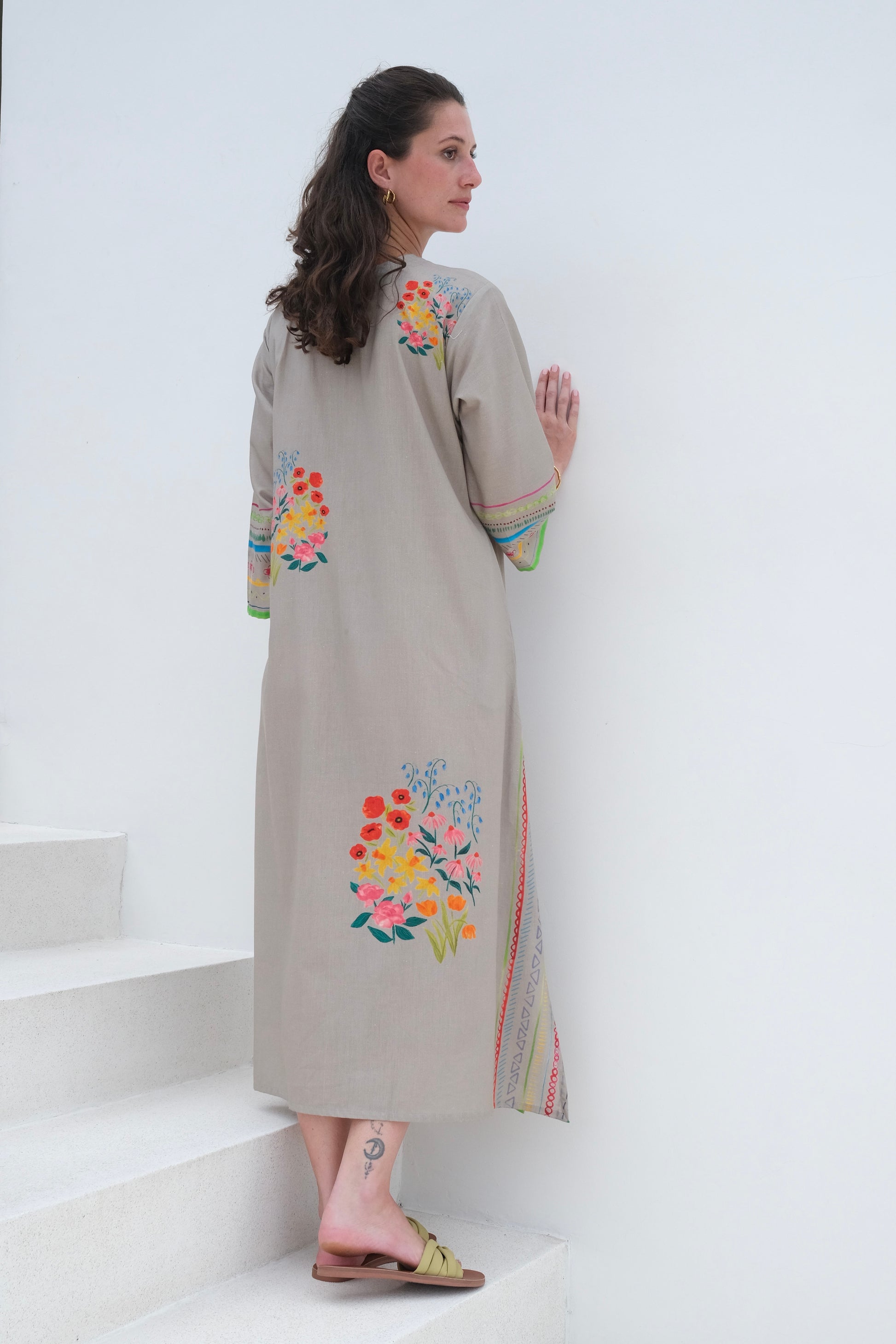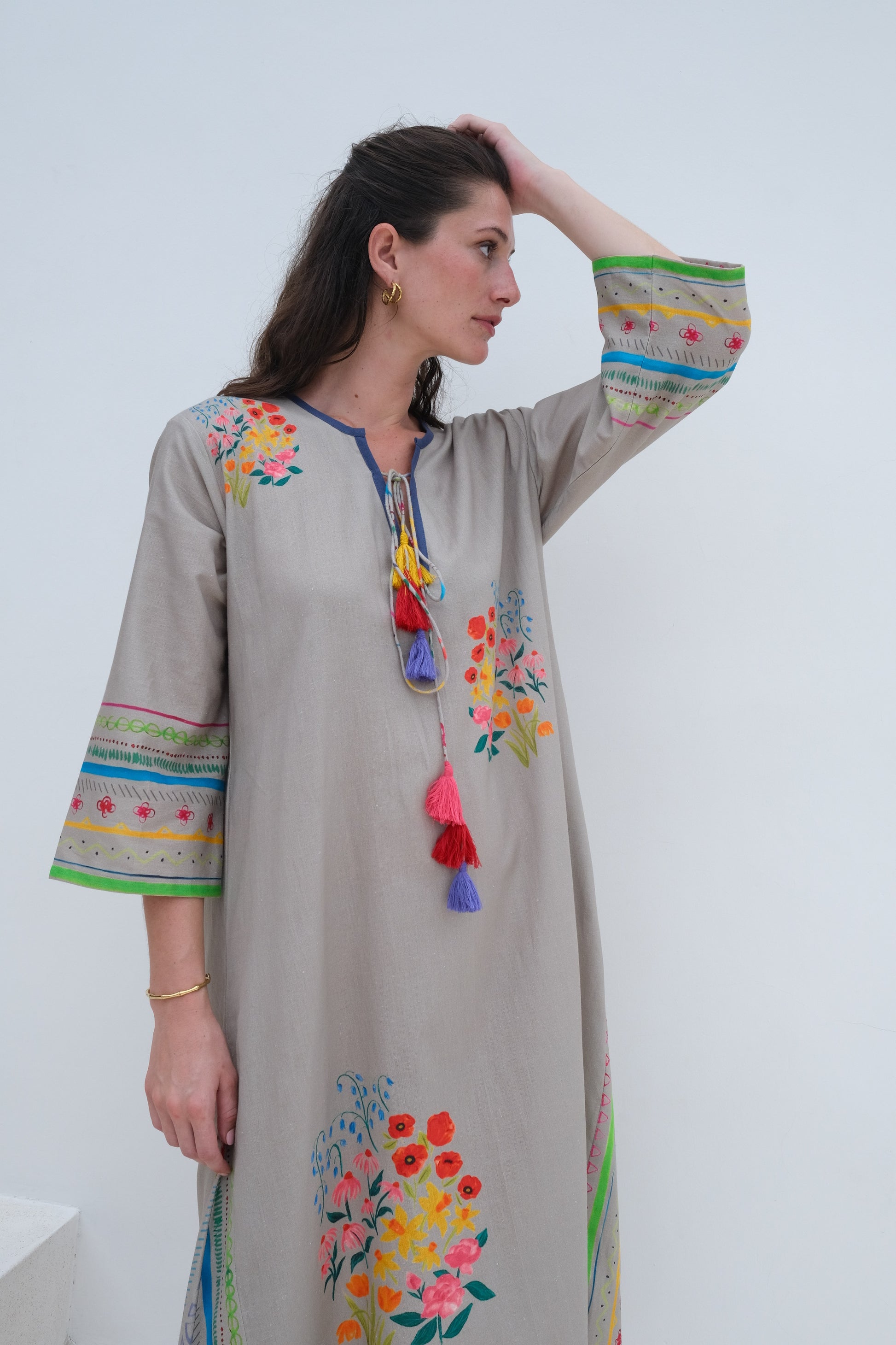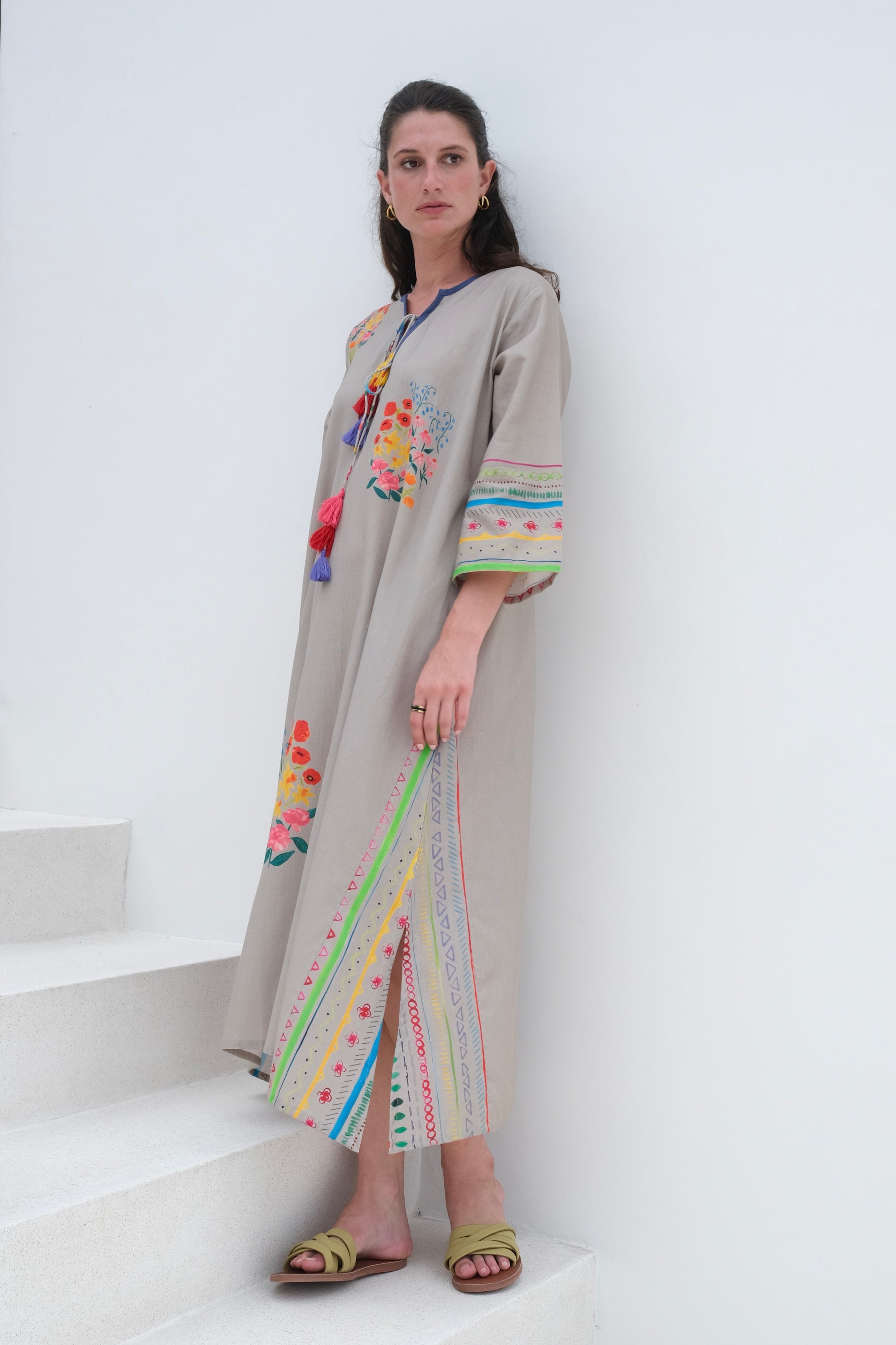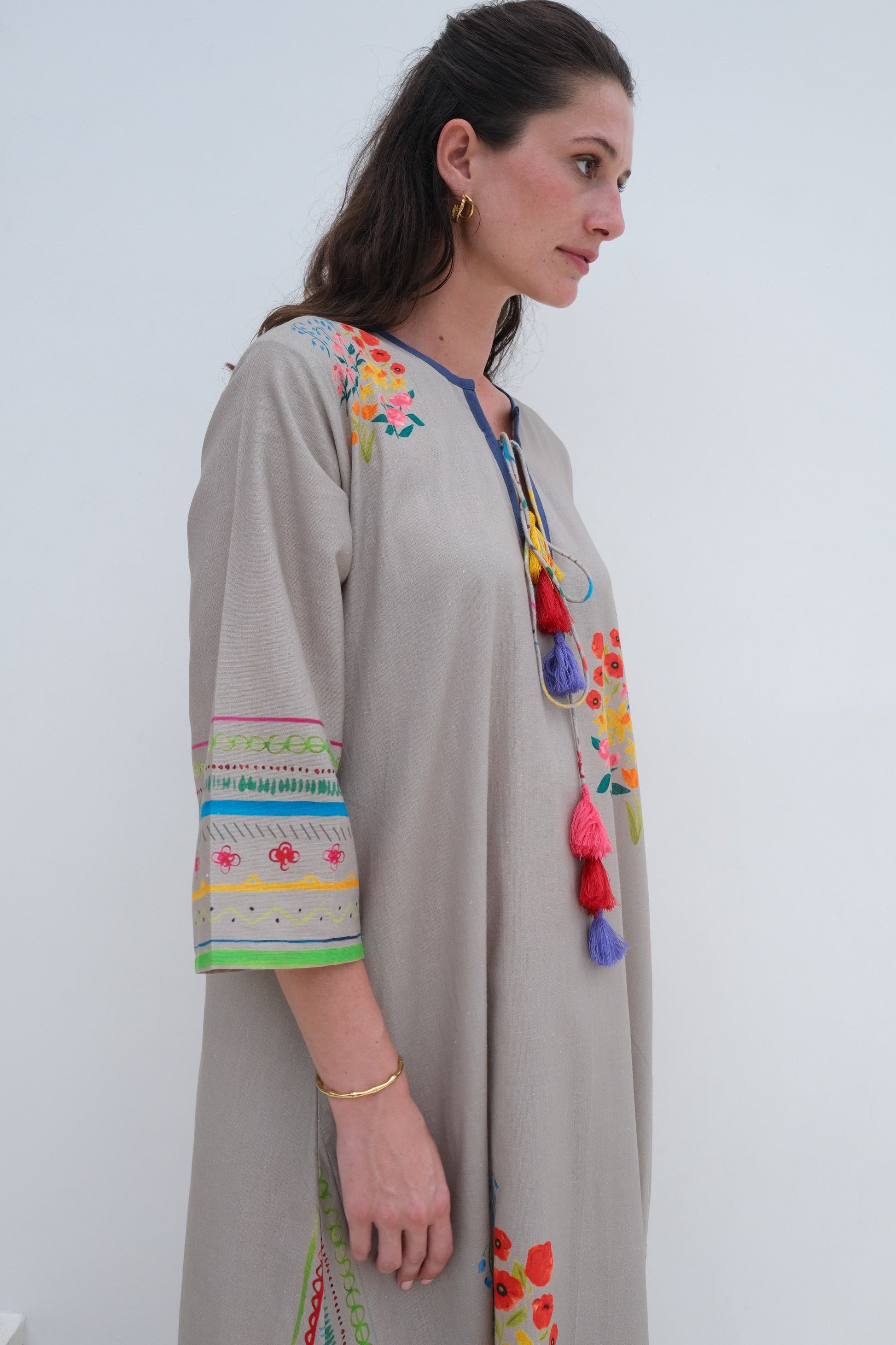 The positano dress, designed in a kaftan style with a bohemian print showcasing vivid colors, boasts side slits, a v-neck collar, and whimsical, colorful drawstrings. Ideal for beach gatherings or any festivities.