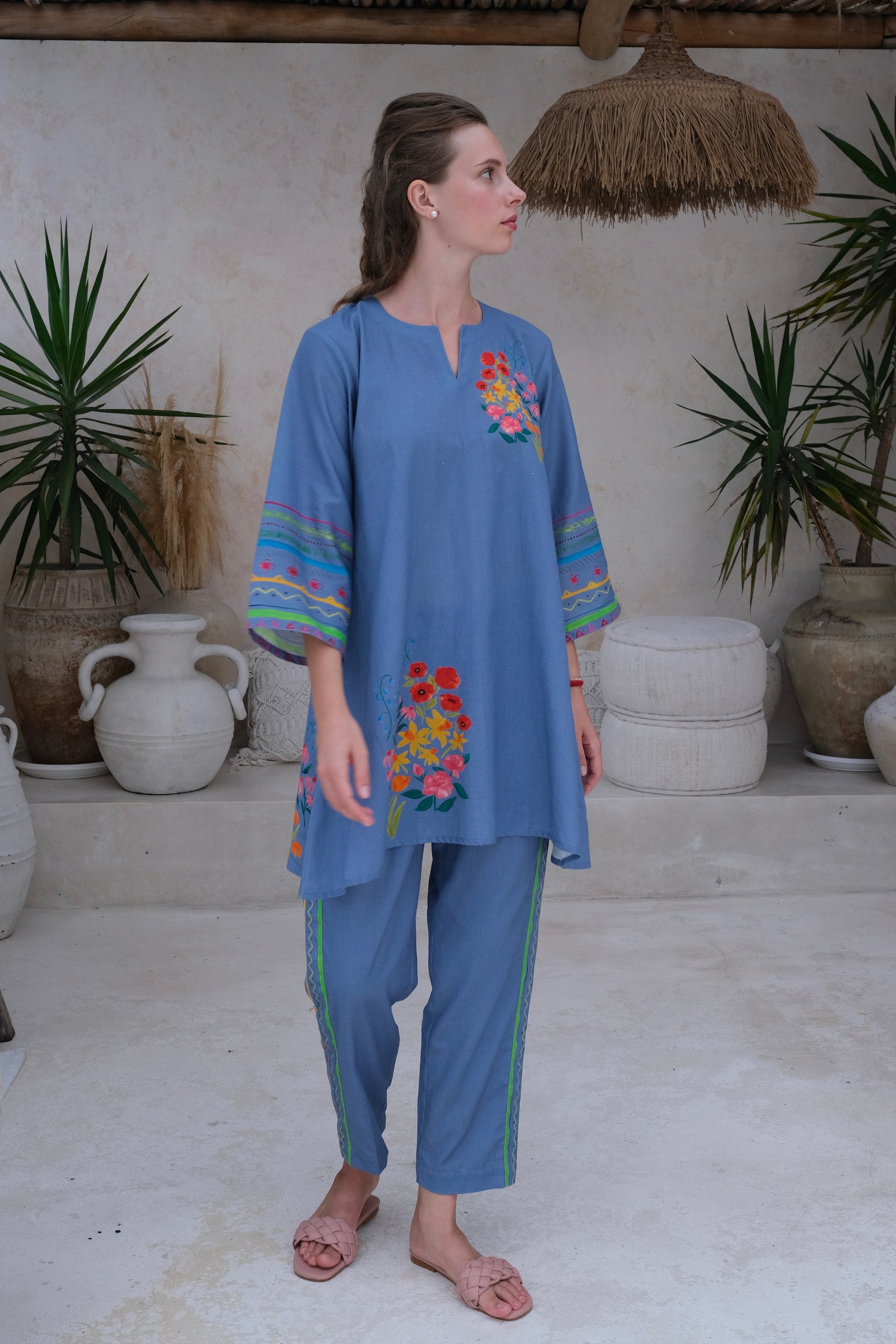 The breezy positano pants feature a vibrant bohemian watercolor print along the sides, perfect to pair with the positano tunic for a playful and chic look.