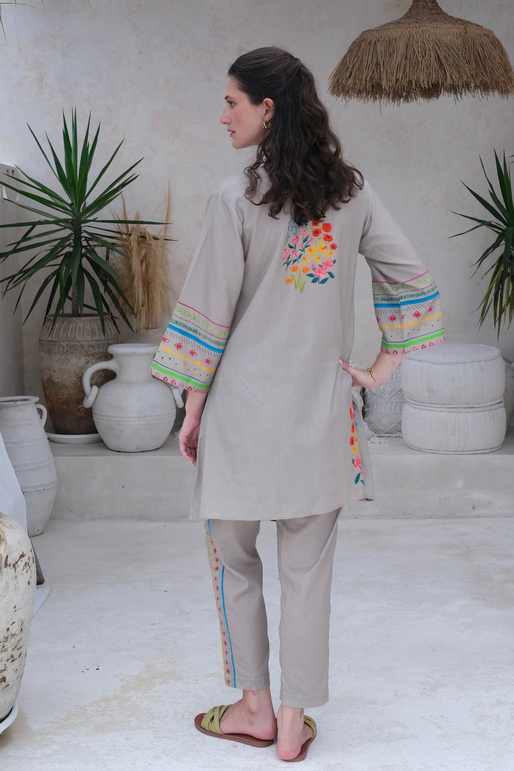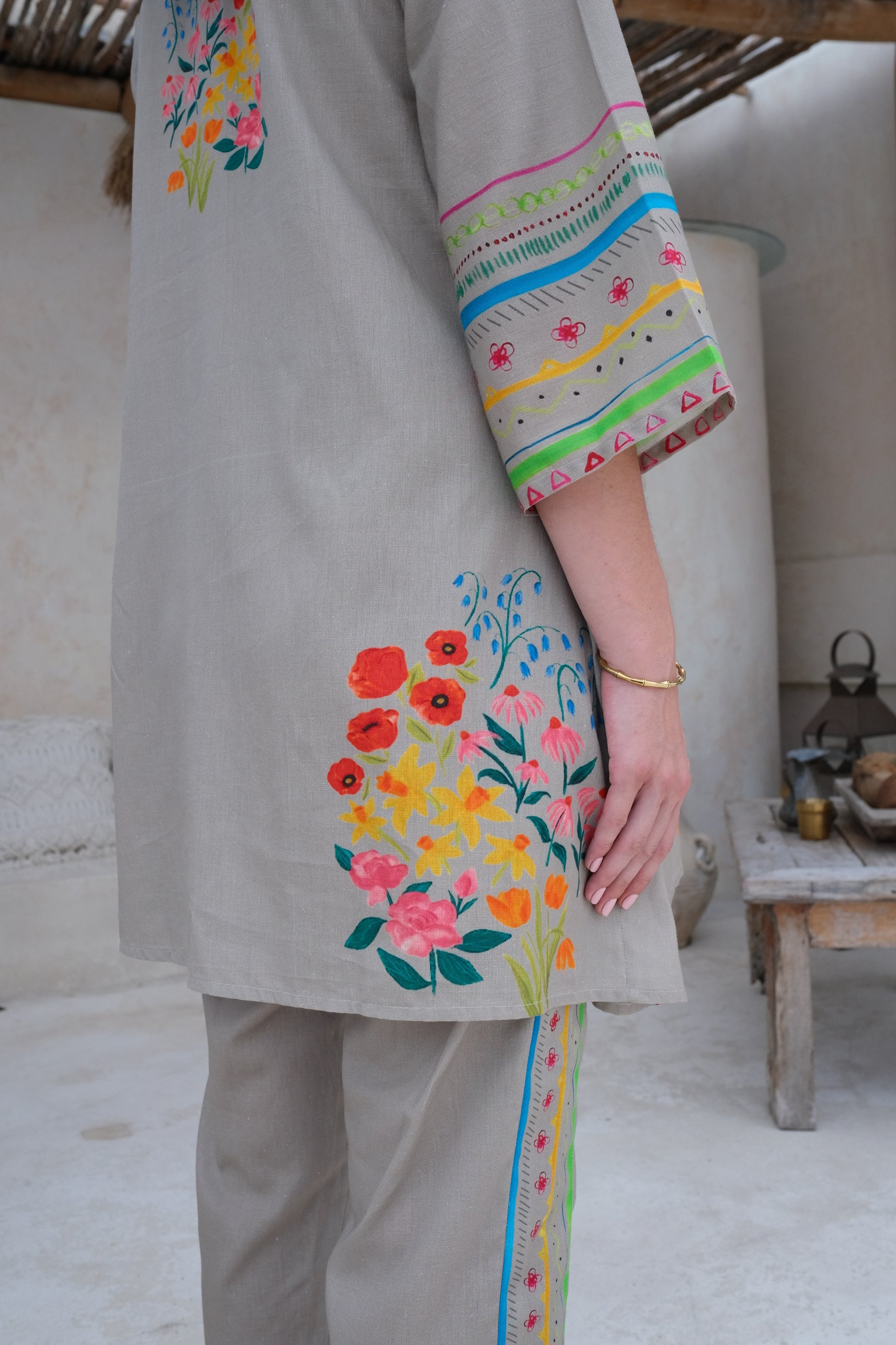The positano tunic features a slit neckline adorned with watercolor florals that cascade down the tunic, while the sleeves boast a colorful bohemian print. Paired with the positano pants, the duo makes for a breezy co-ord.