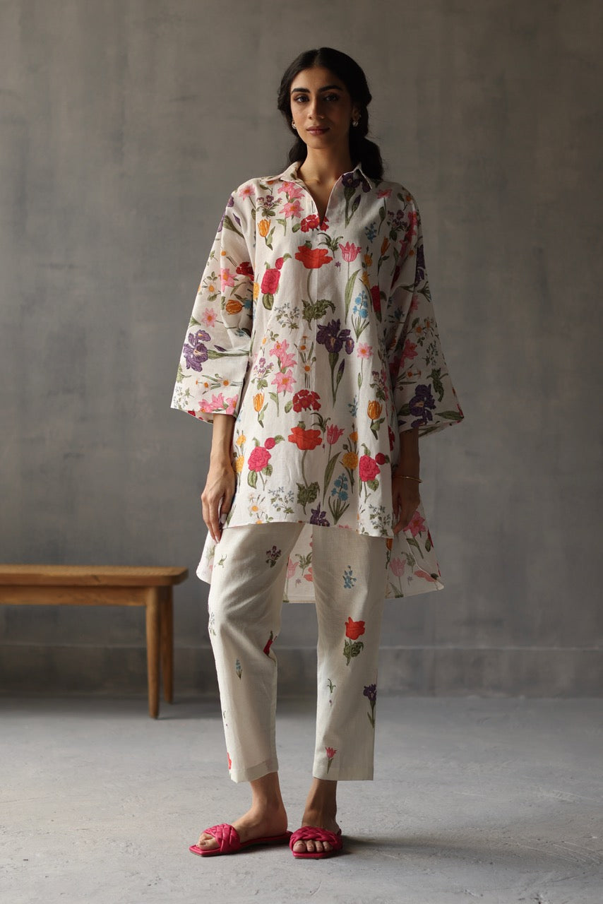 The primrose kaftan merges the timeless kaftan style, relaxed and flowing, adorned with hand-drawn floral prints on comfortable linen for a blend of sophistication and comfort. It pairs beautifully with our primrose pants.