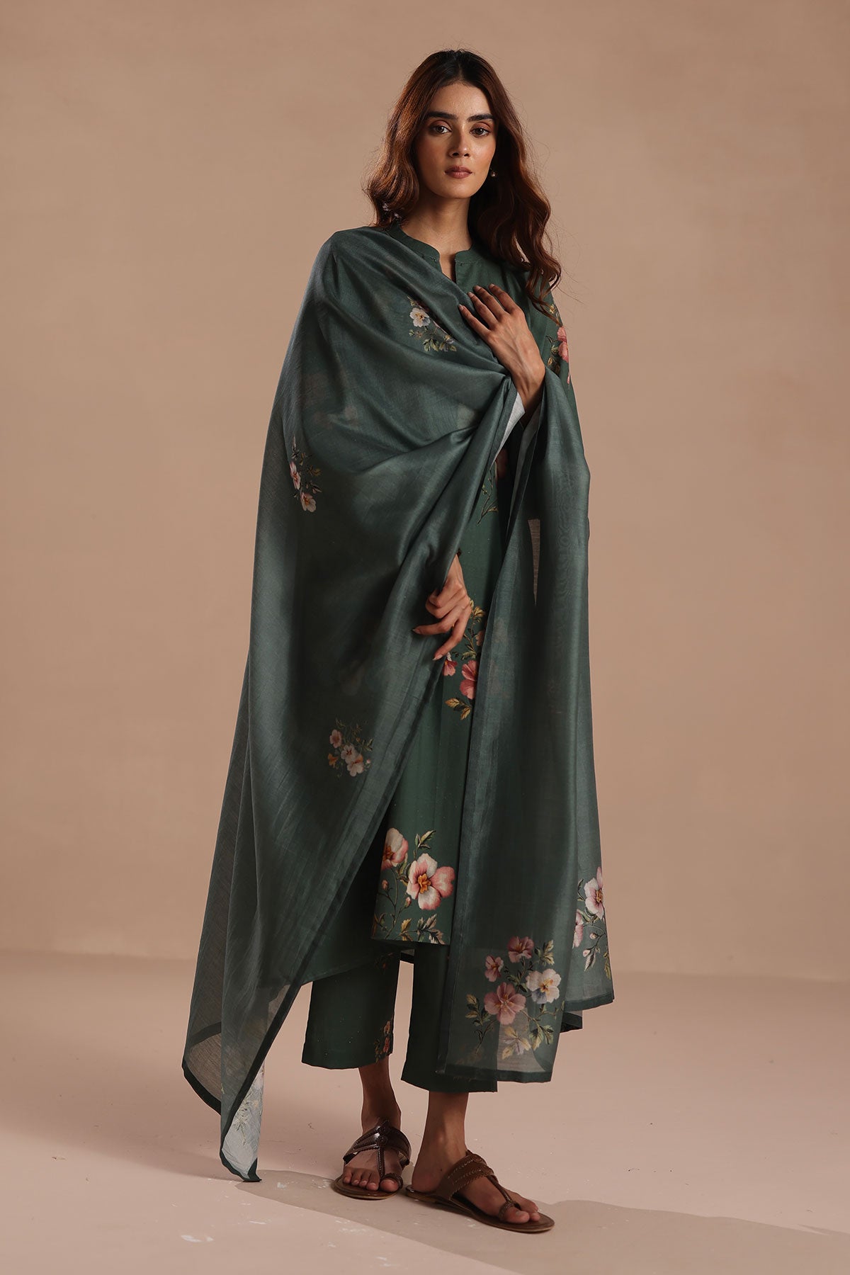 A green stole that complements with V-neckline, solid pants, and a printed dupatta. Effortless and versatile for everyday elegance.