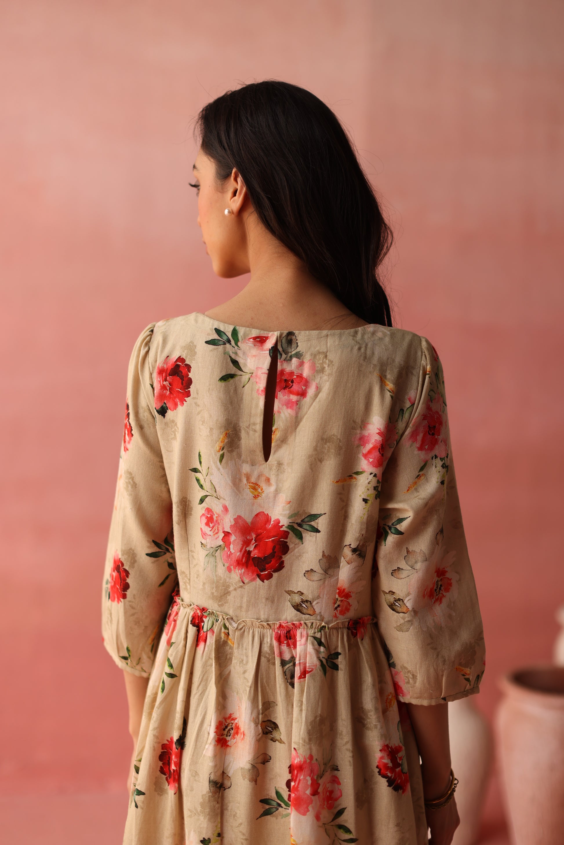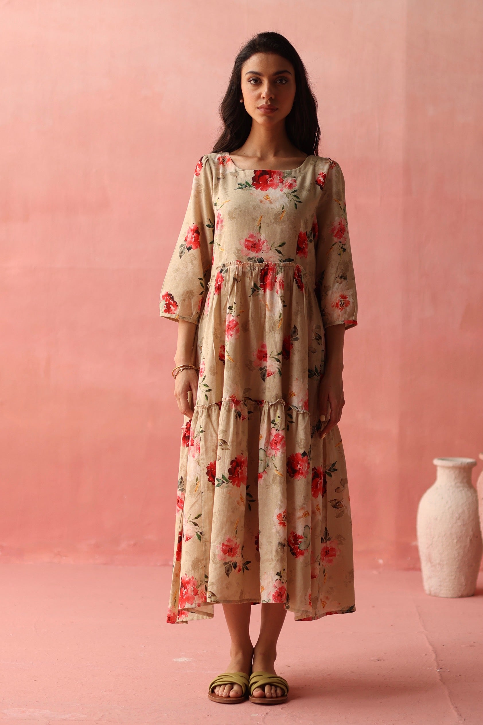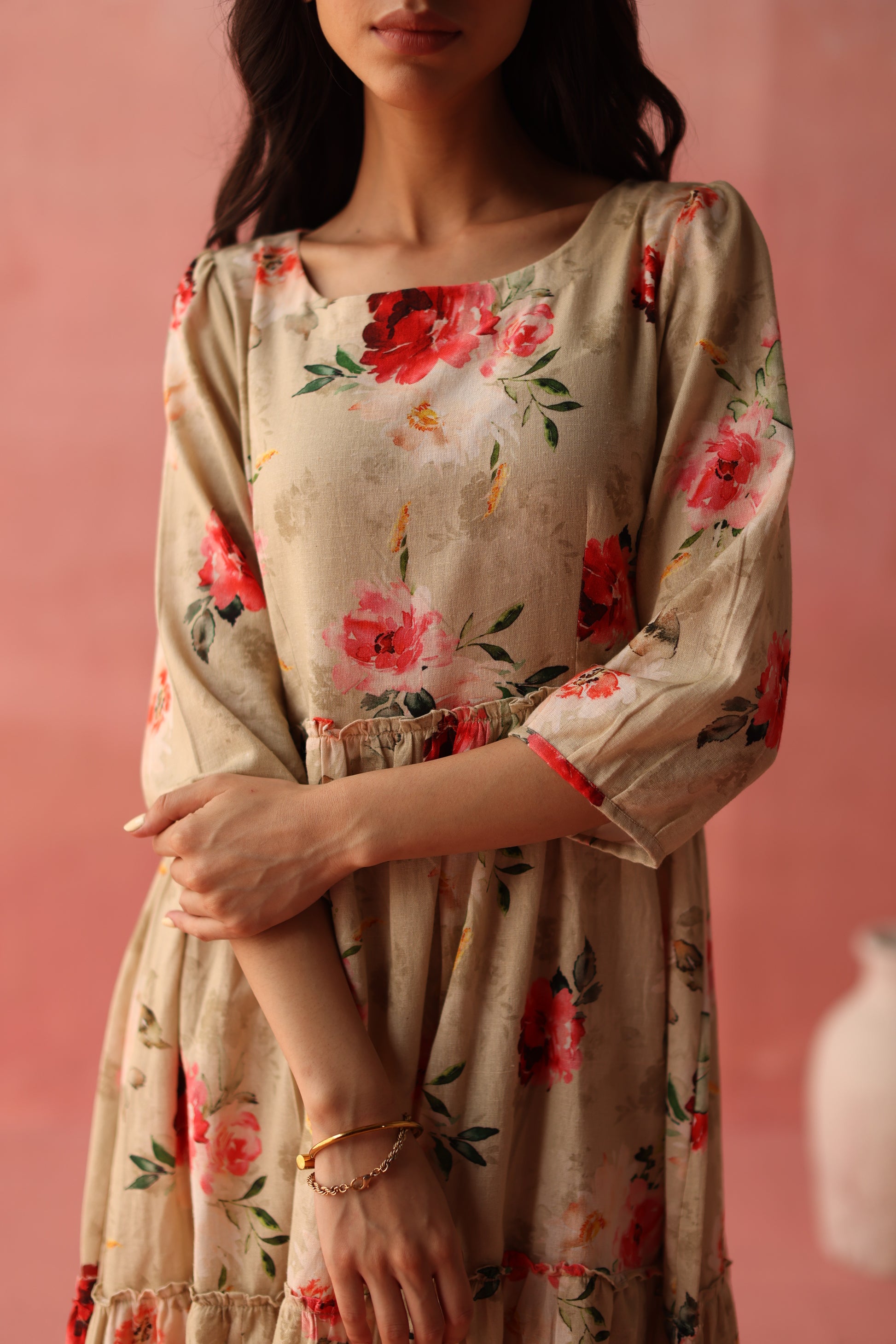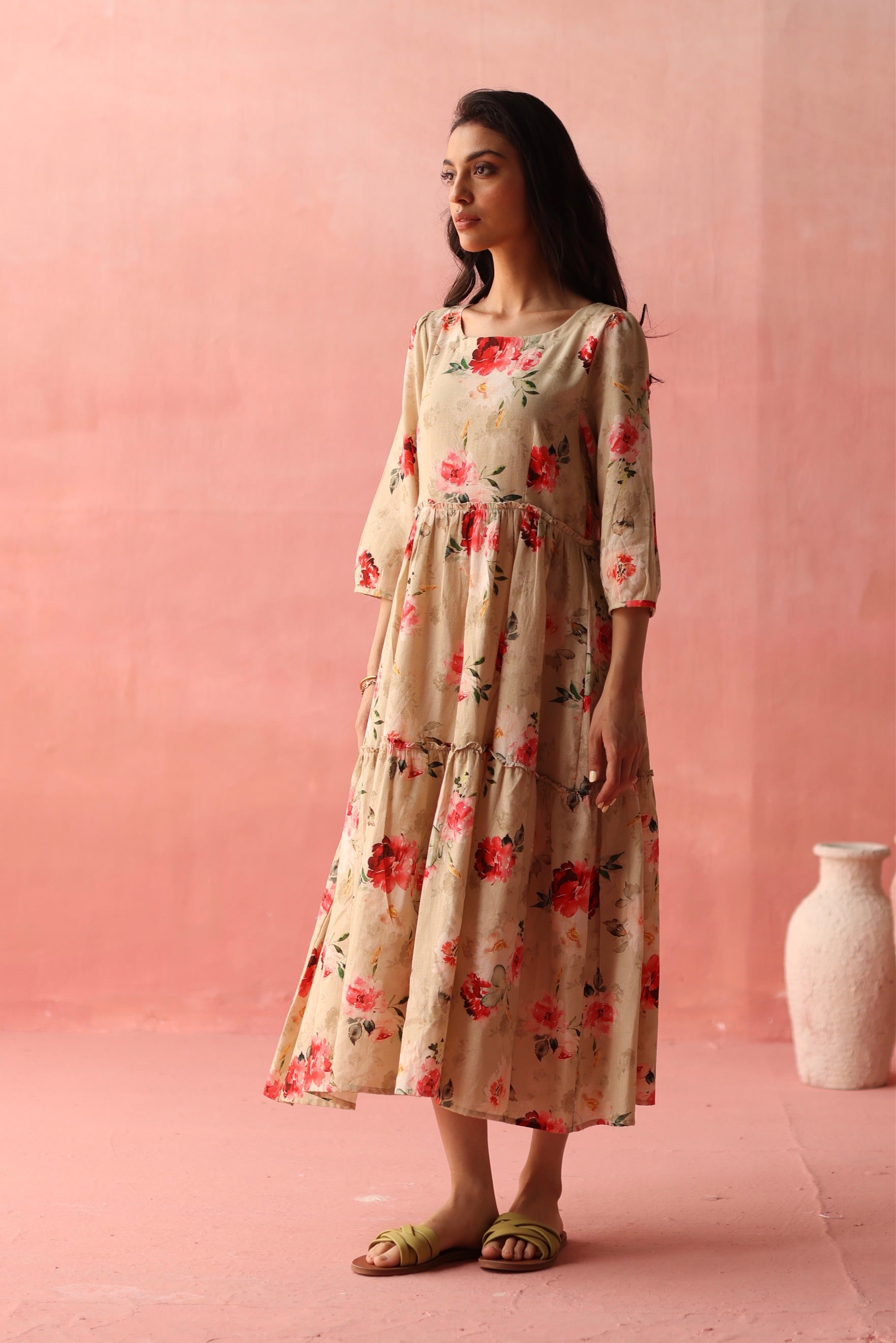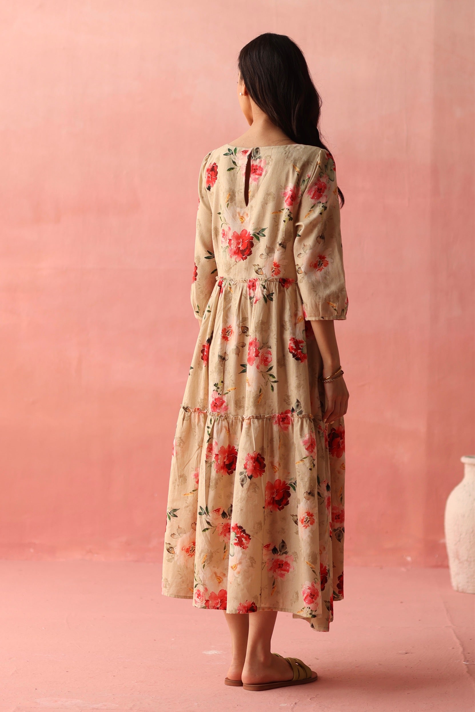 The romaine dress is made with fine linen fabric to give you the utmost comfort and is adorned with a floral print featuring various types of flowers and foliage. The dress is a charming and feminine garment that falls to a mid-length and is designed with multiple tiers or layers that create a beautiful cascading effect, adding volume and movement to the dress.