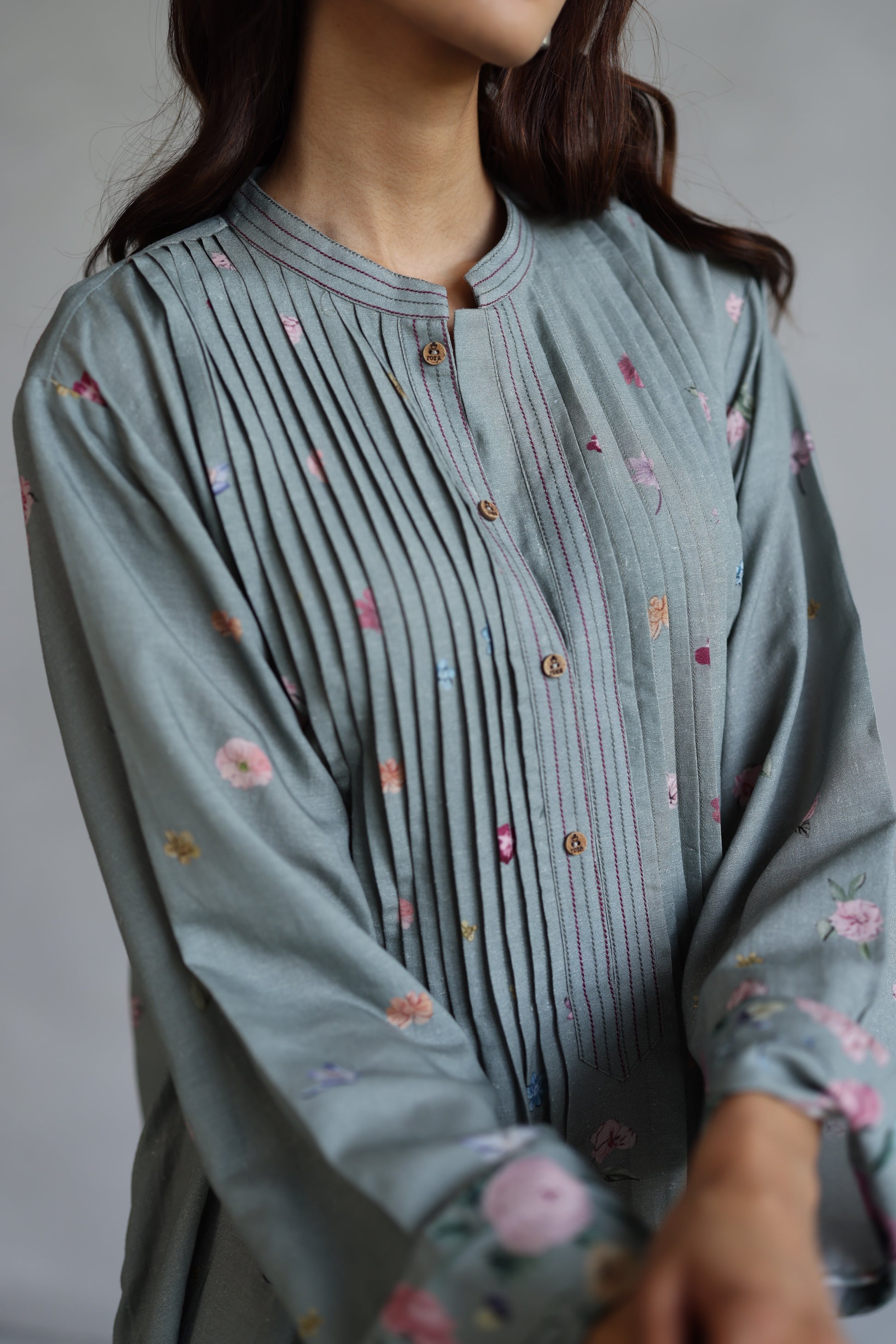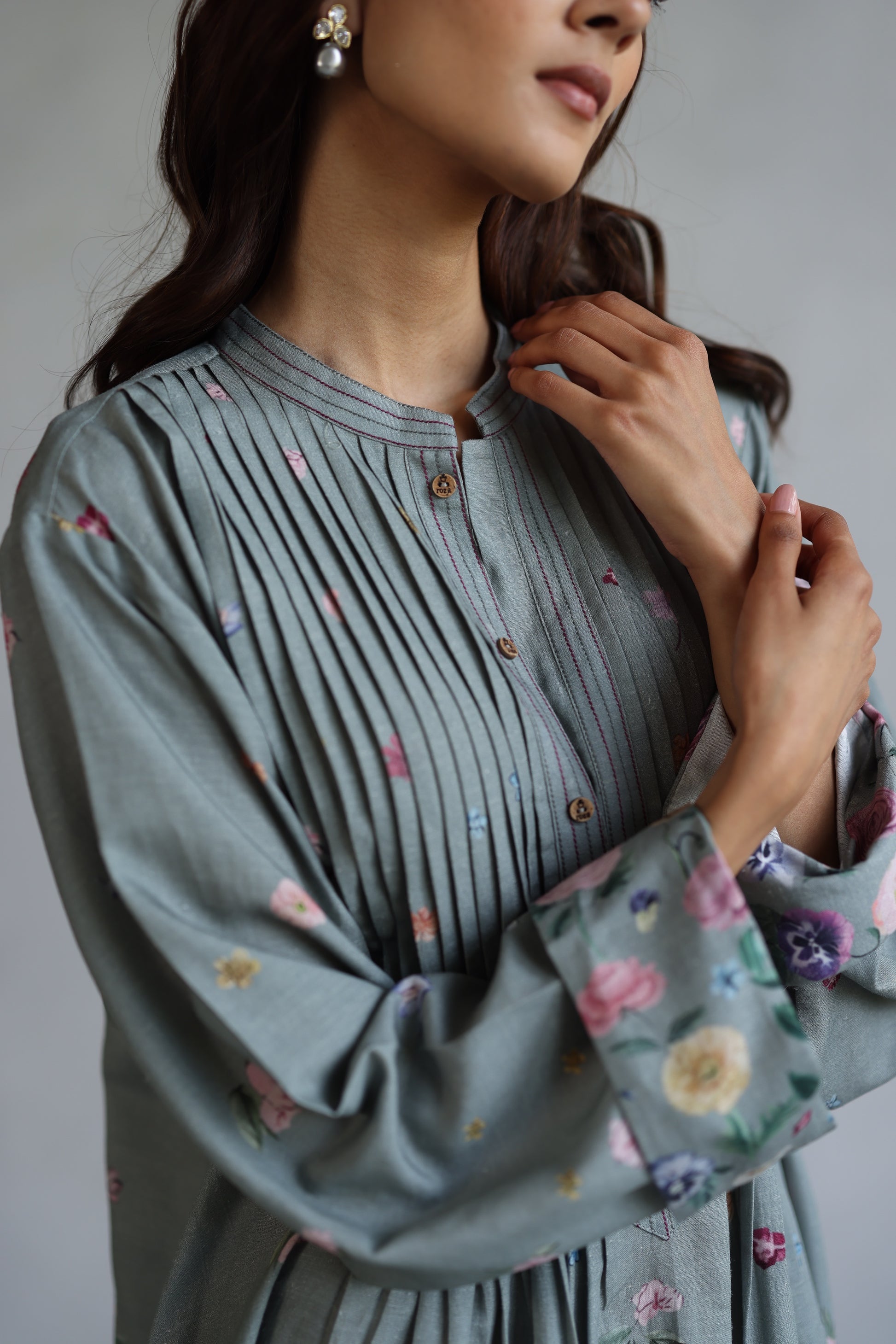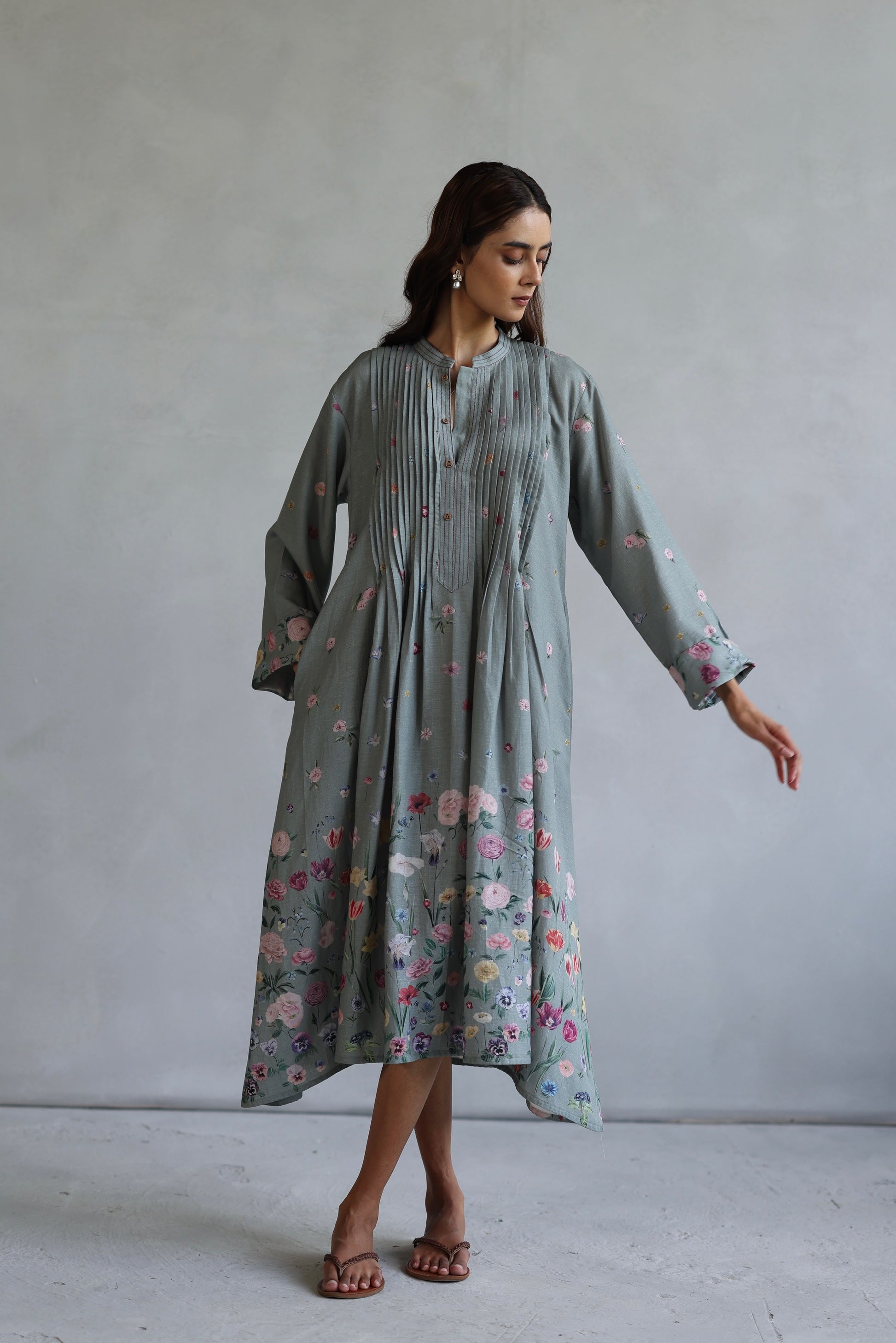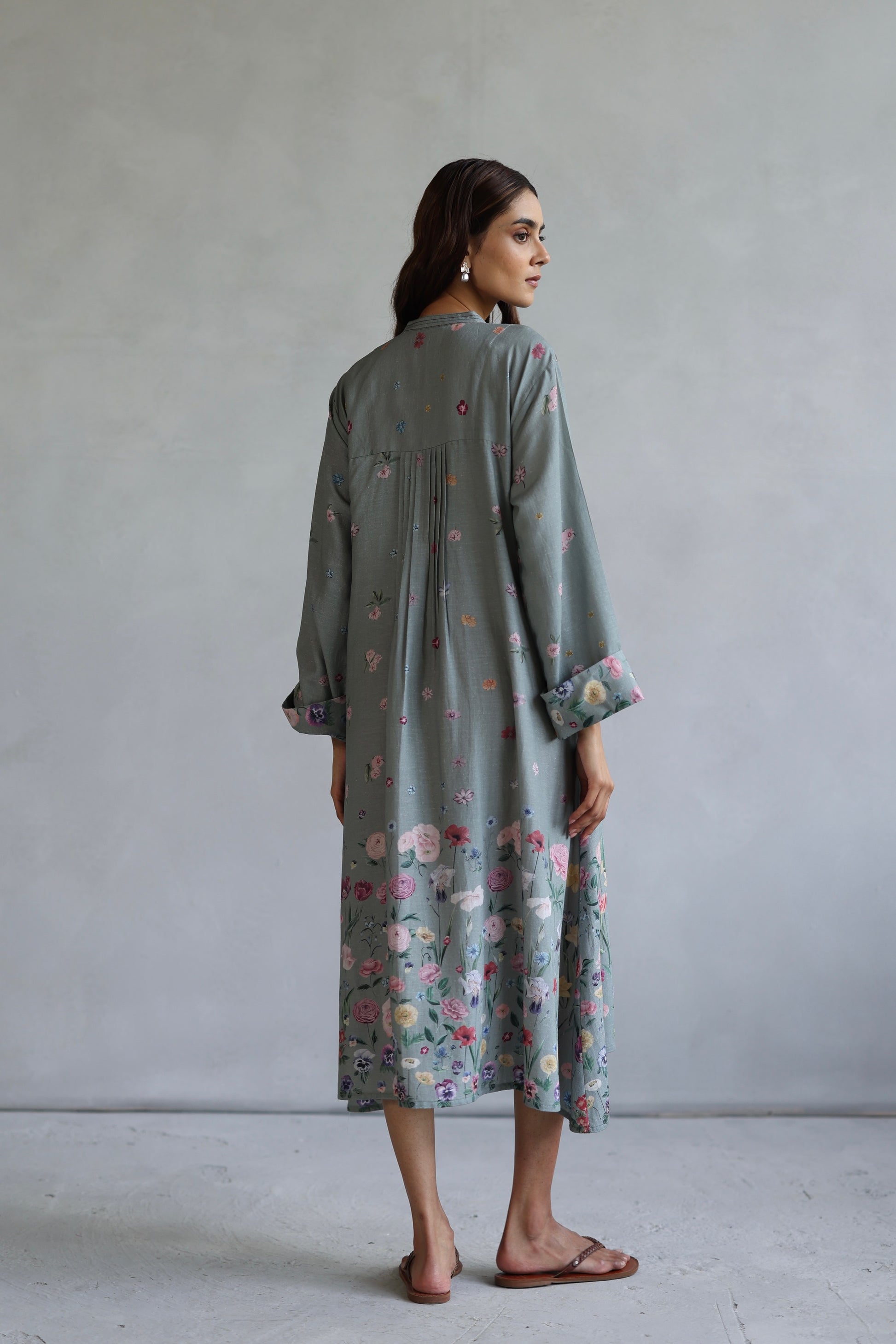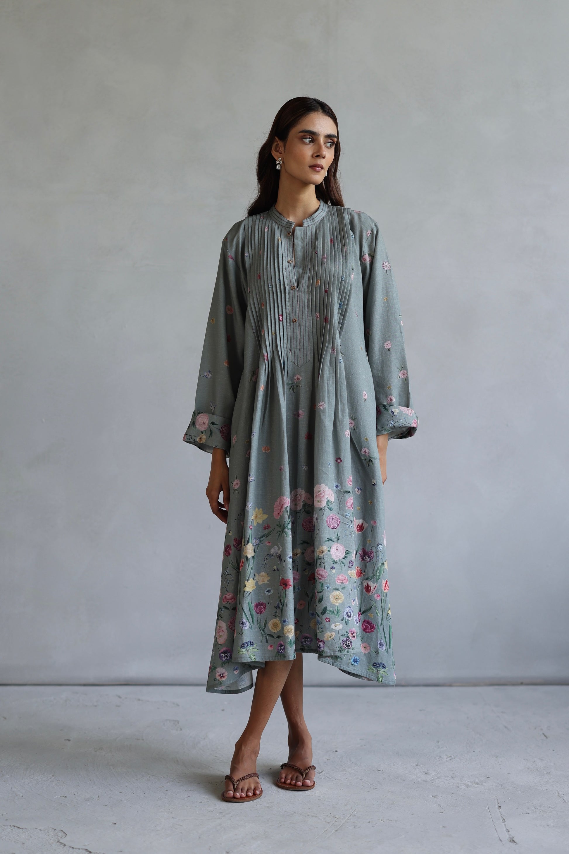 Graceful and airy, this breathable linen dress in a dusky pink hue is adorned with delicate florals, with a heavier bloom along the sweep. The yoke has pleates and contrast stitches making it a wardrobe staple this summer.