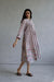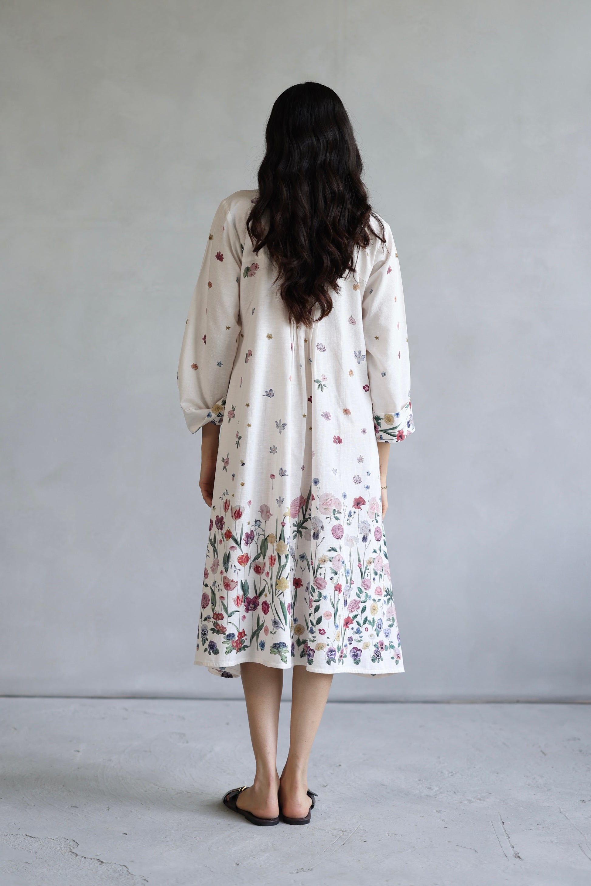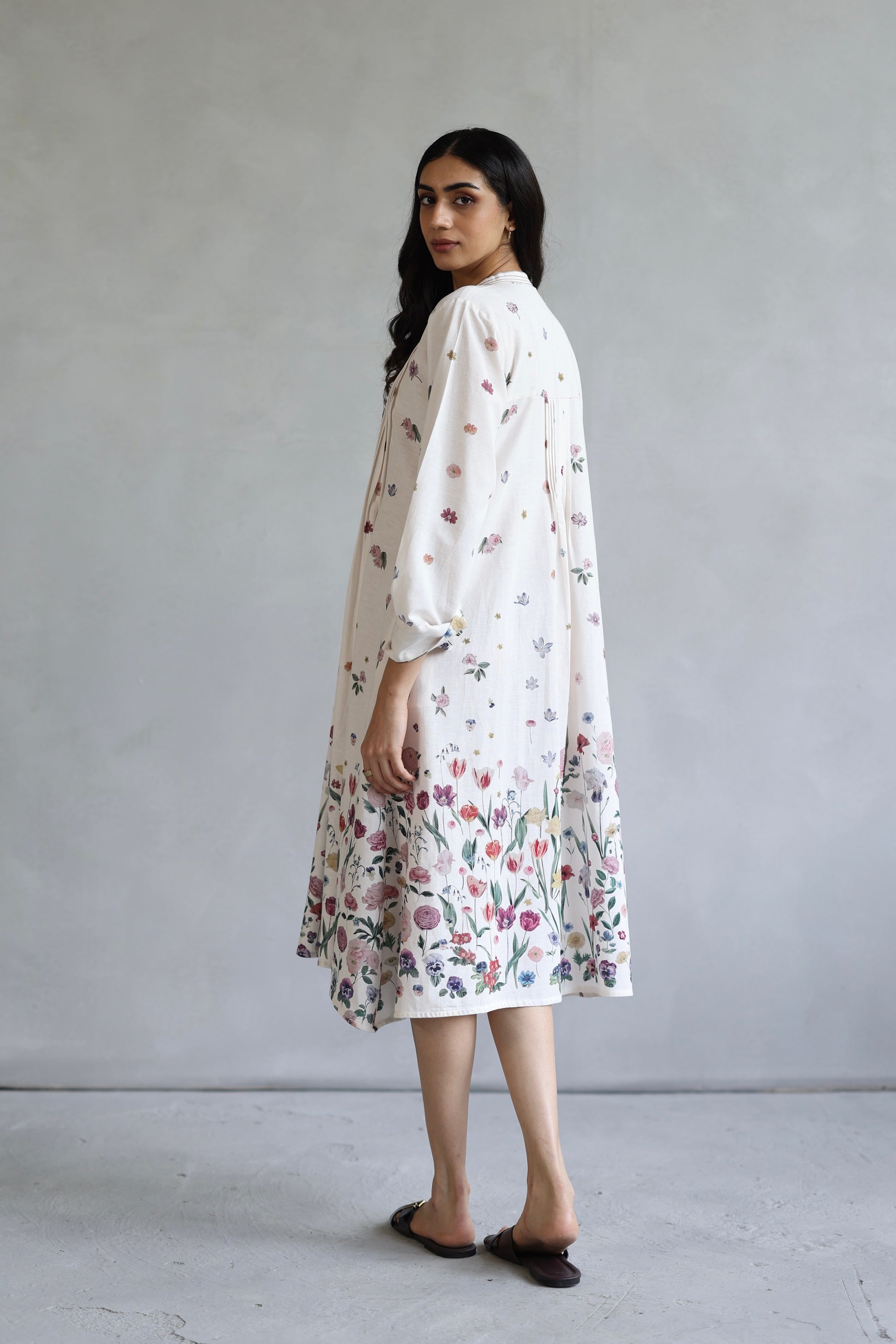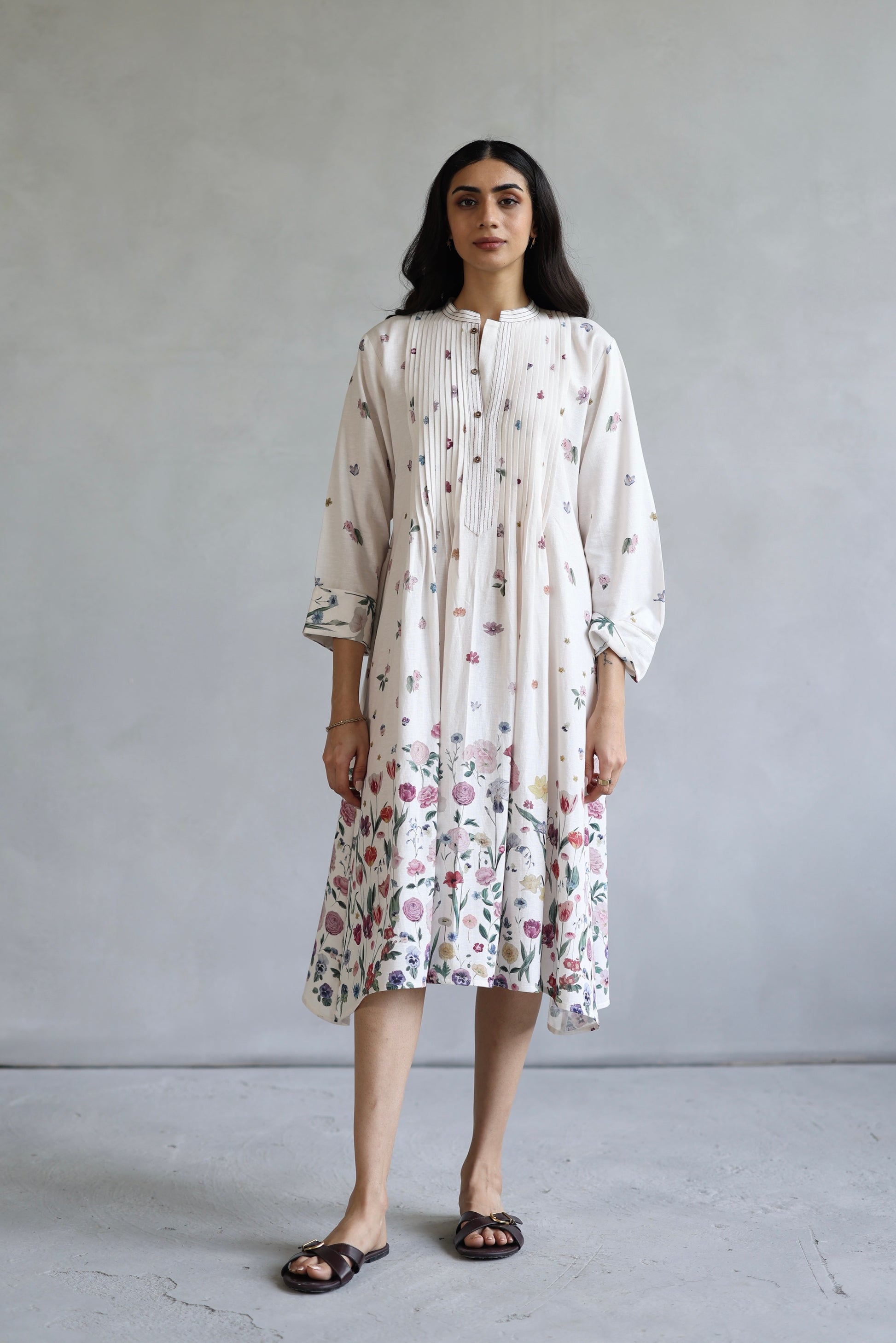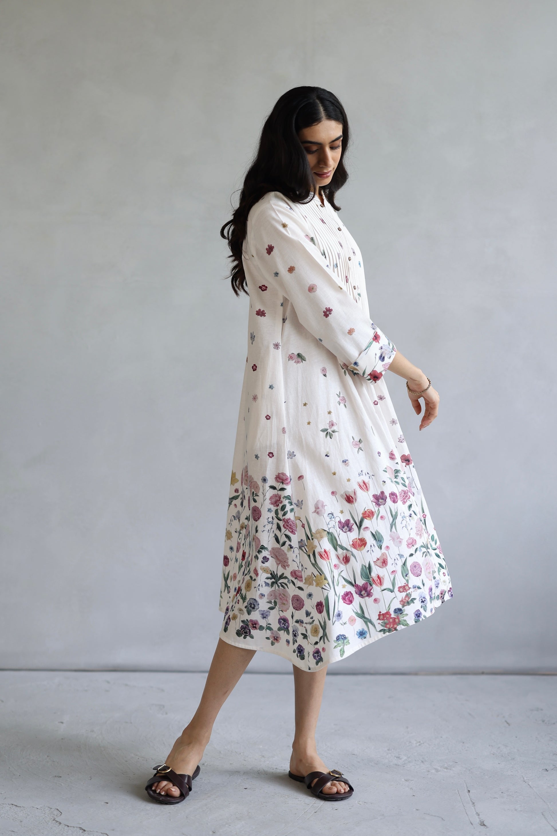 Graceful and airy, this breathable linen dress in a dusky pink hue is adorned with delicate florals, with a heavier bloom along the sweep. The yoke has pleates and contrast stitches making it a wardrobe staple this summer.