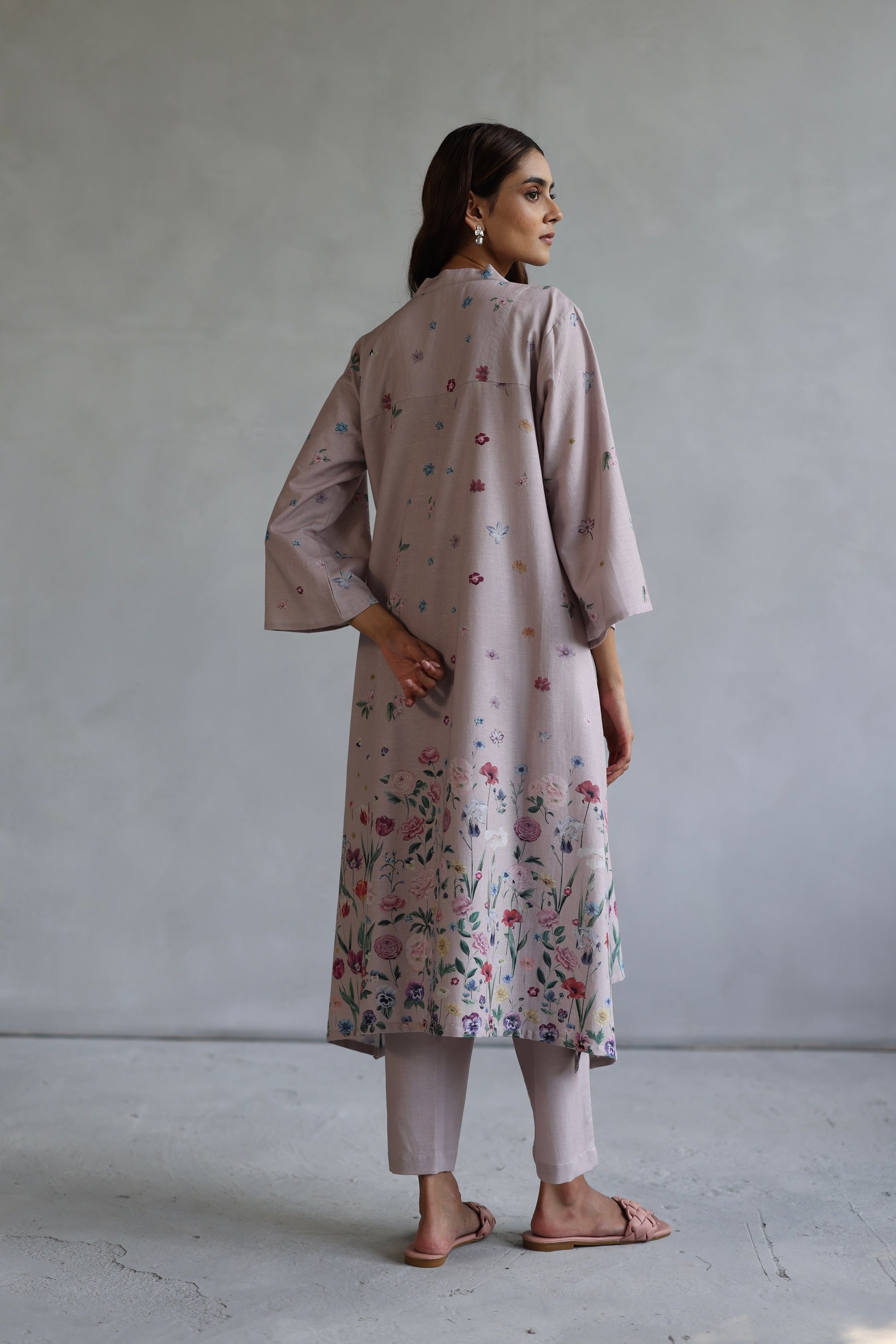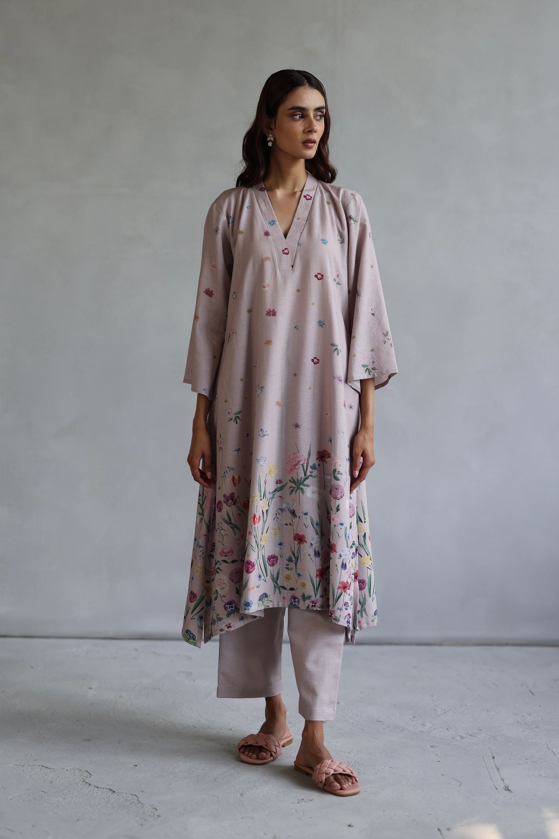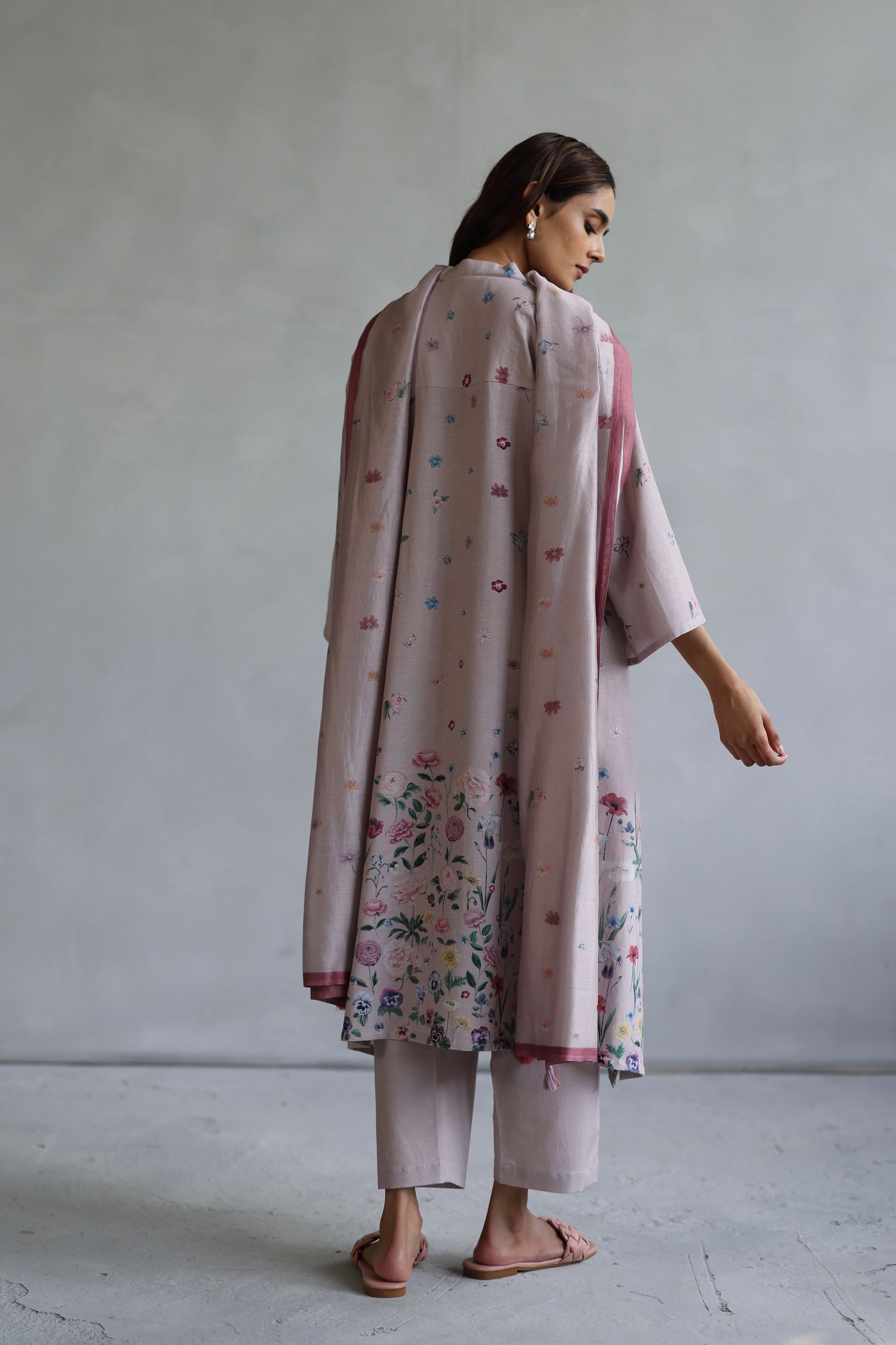 Crafted in breathable linen, the rosaline kurta set is adorned with delicate florals, with a fuller bloom along the sweep for a graceful touch. The effortlessly elegant silhouette is paired with straight pants, making it a perfect blend of comfort and sophistication. Can be paired with the rosaline stole for a full look.
