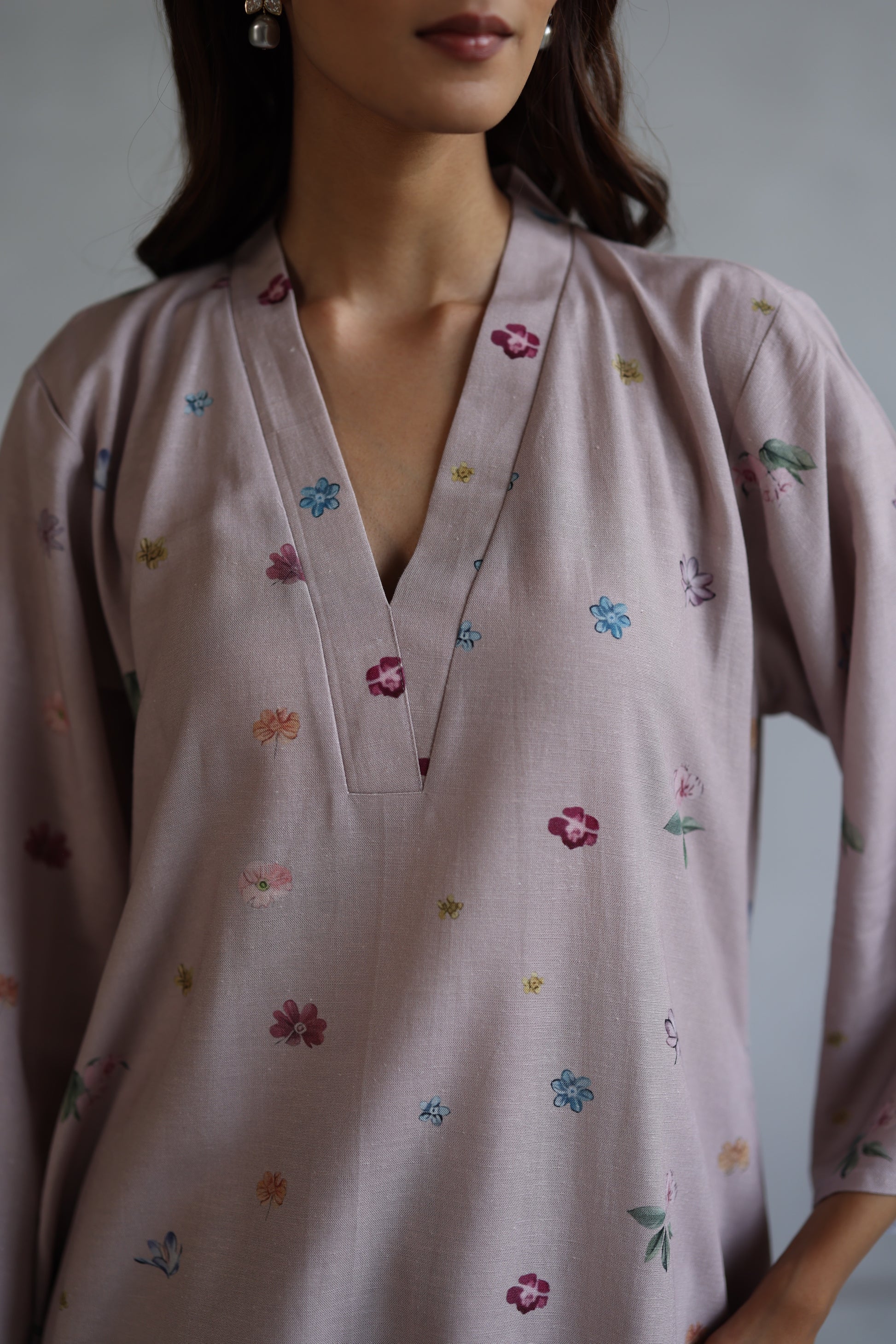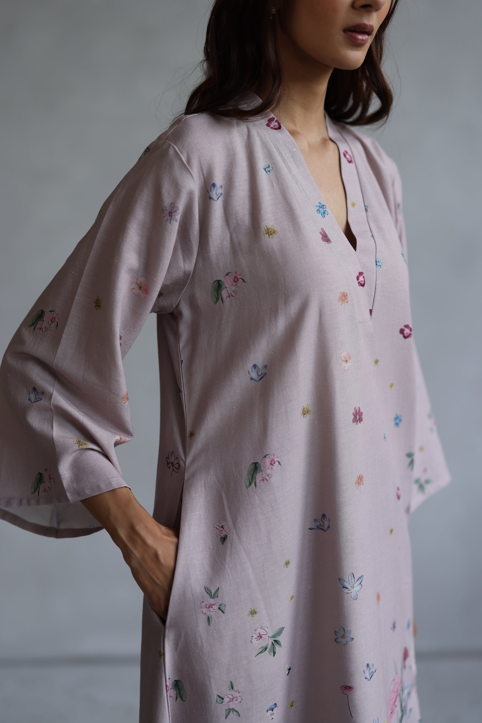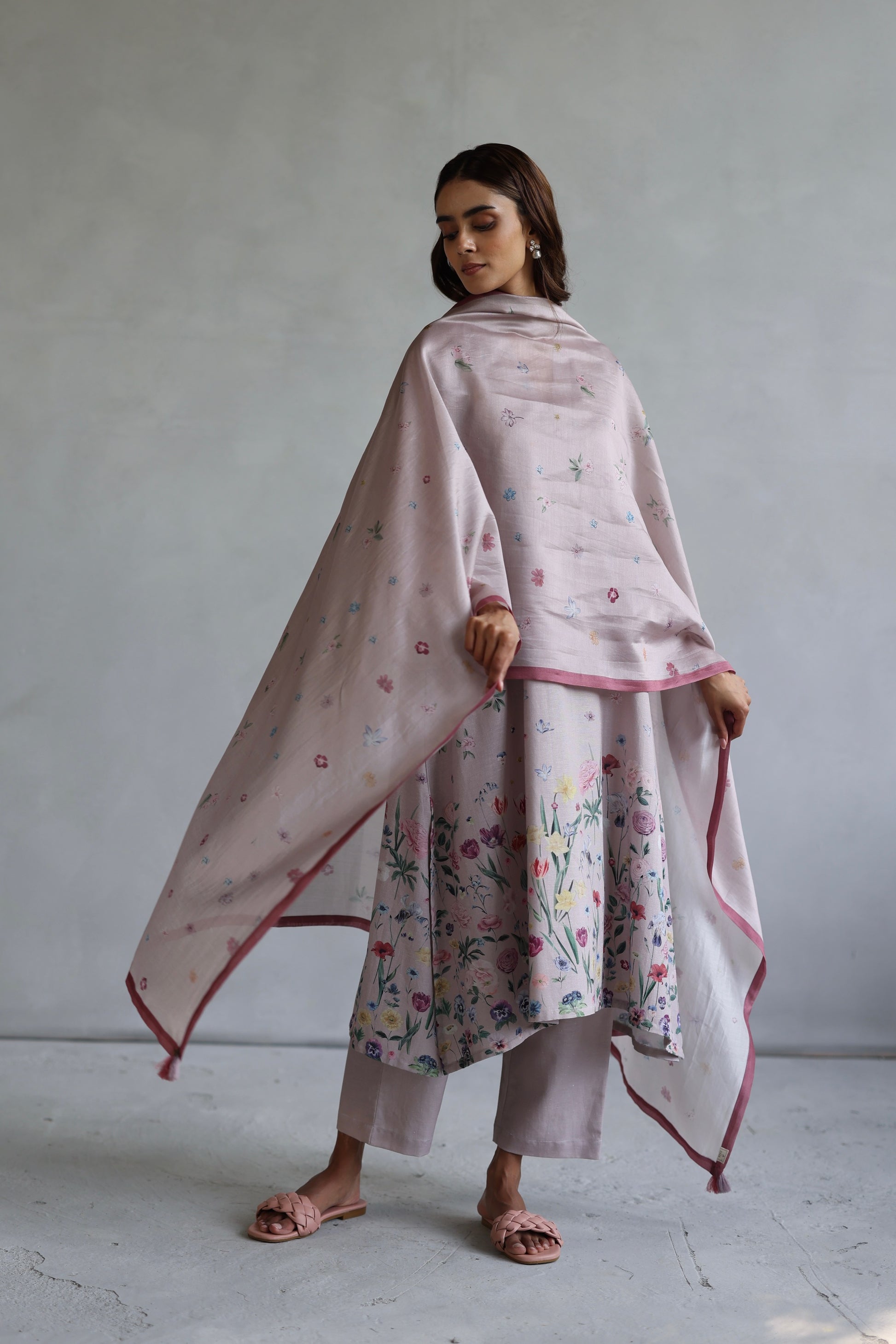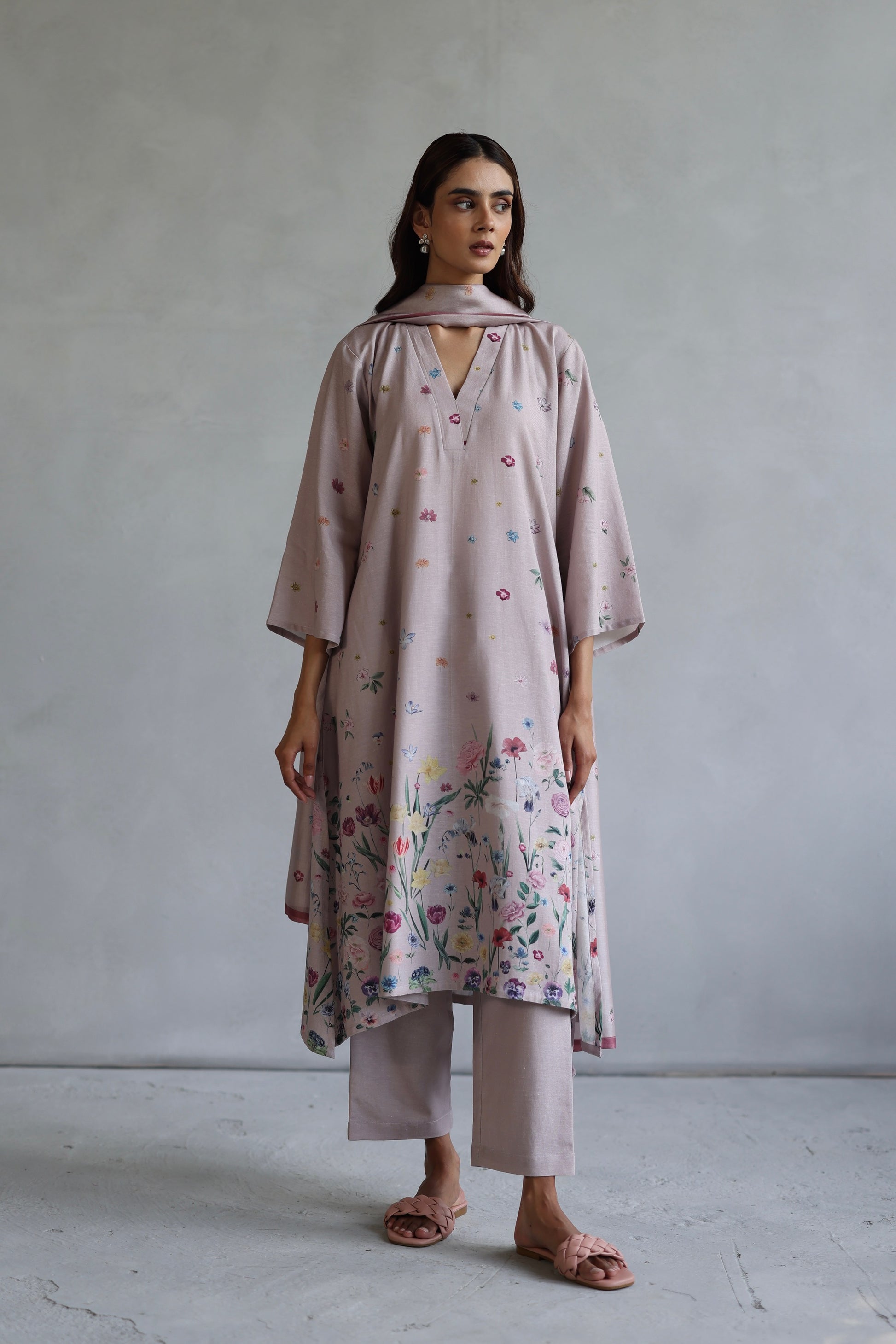 Crafted in breathable linen, the rosaline kurta set is adorned with delicate florals, with a fuller bloom along the sweep for a graceful touch. The effortlessly elegant silhouette is paired with straight pants, making it a perfect blend of comfort and sophistication. Can be paired with the rosaline stole for a full look.
