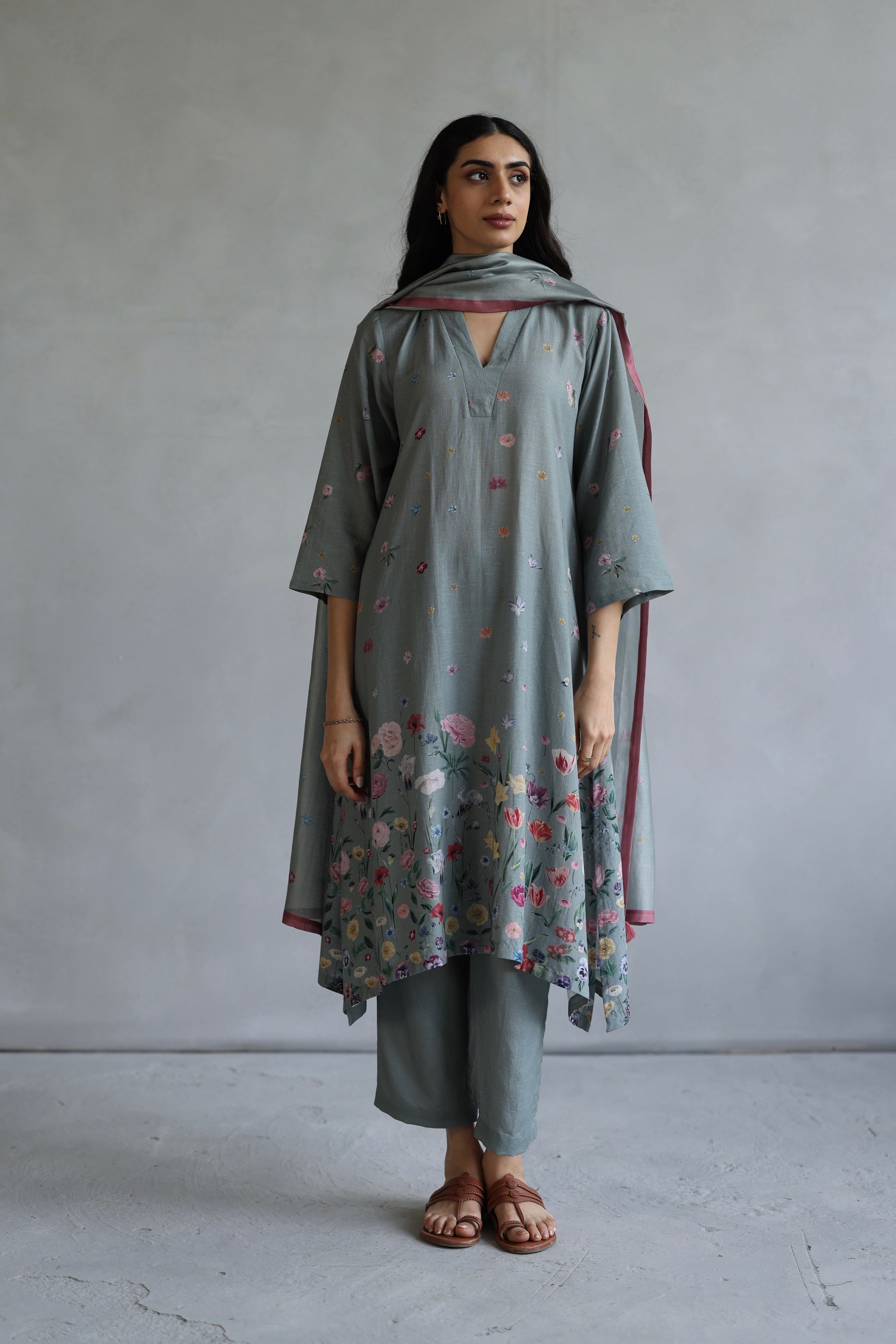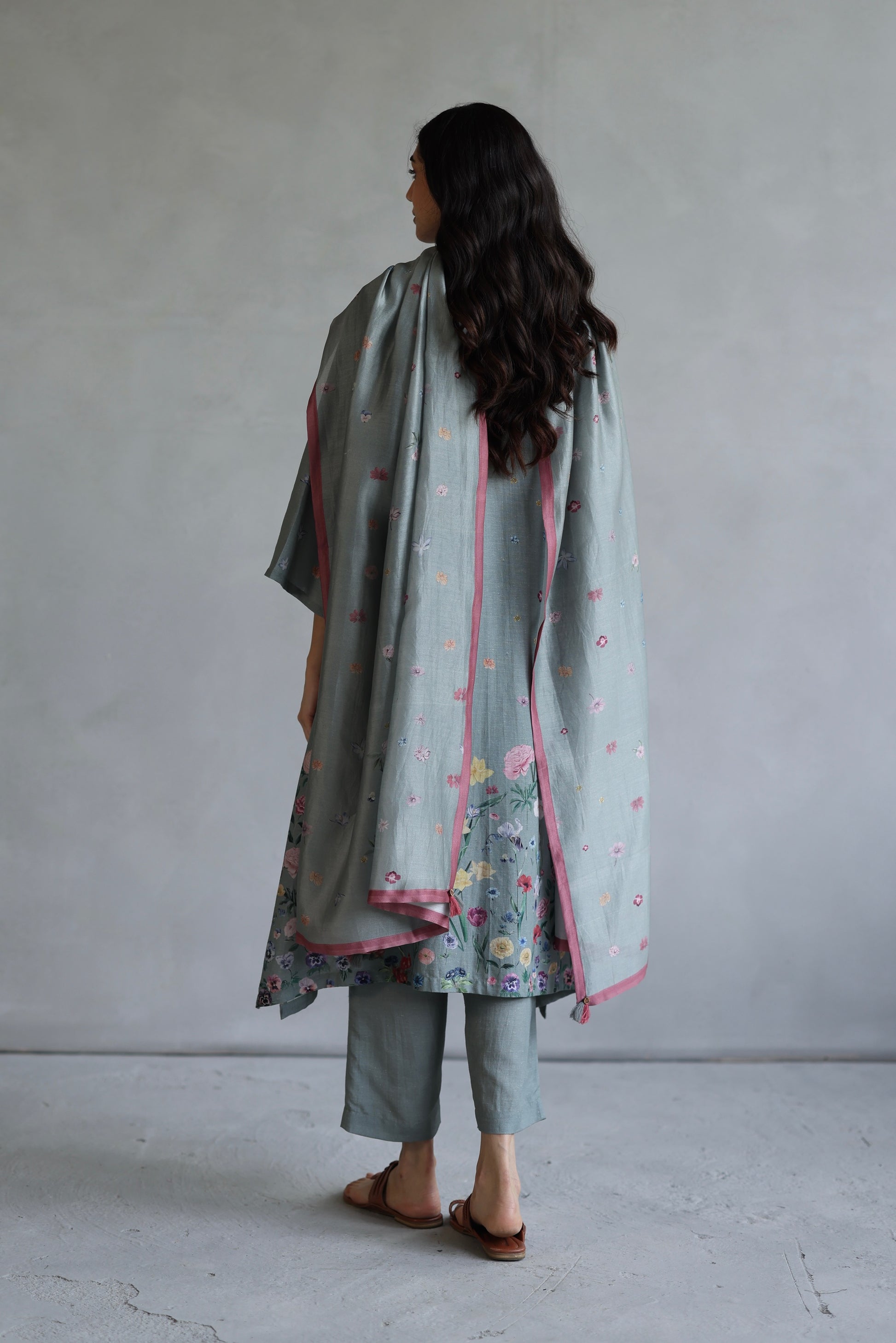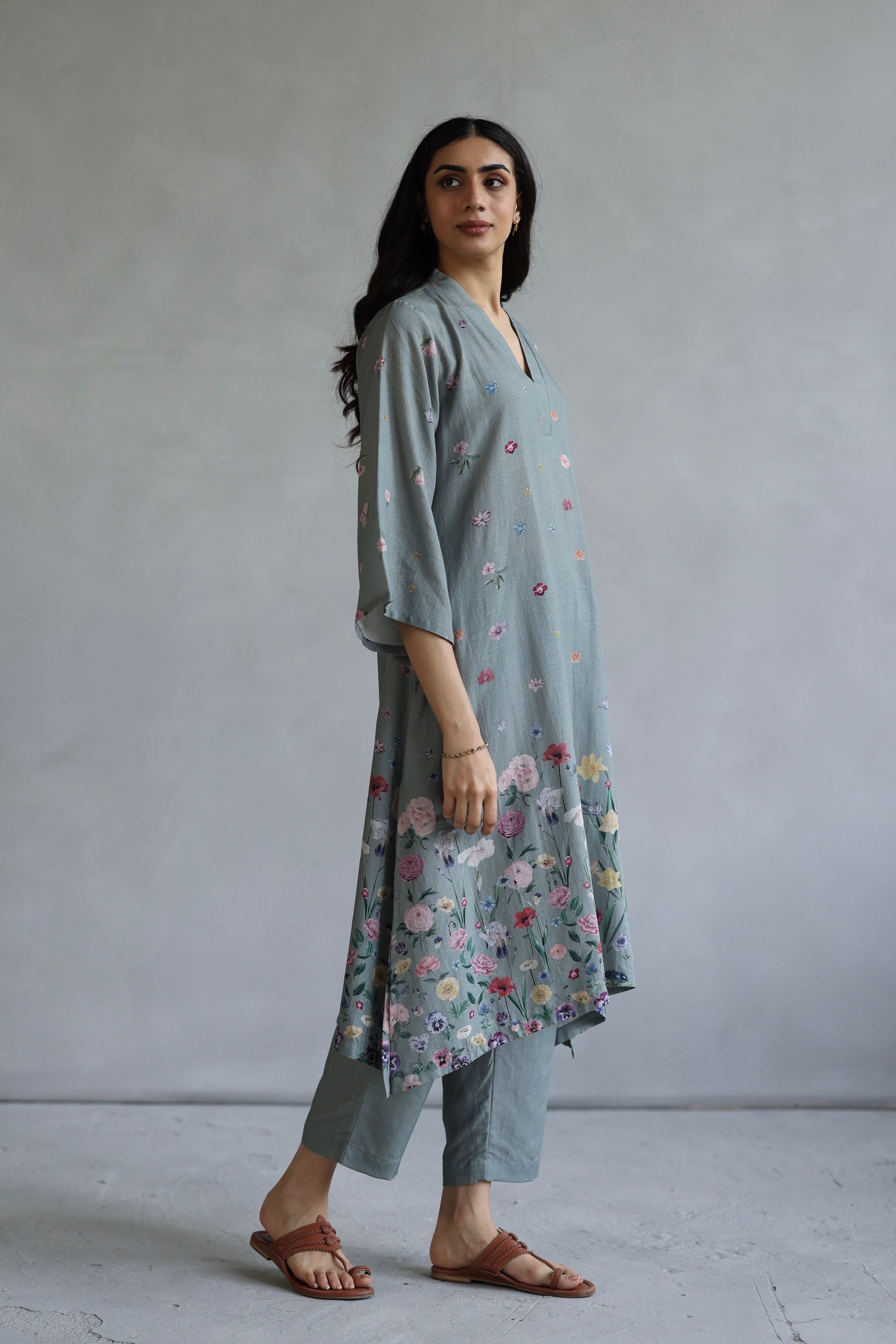 Crafted in breathable linen, the rosaline kurta set is adorned with delicate florals, with a fuller bloom along the sweep for a graceful touch. The effortlessly elegant silhouette is paired with straight pants, making it a perfect blend of comfort and sophistication. Can be paired with the rosaline stole for a full look.