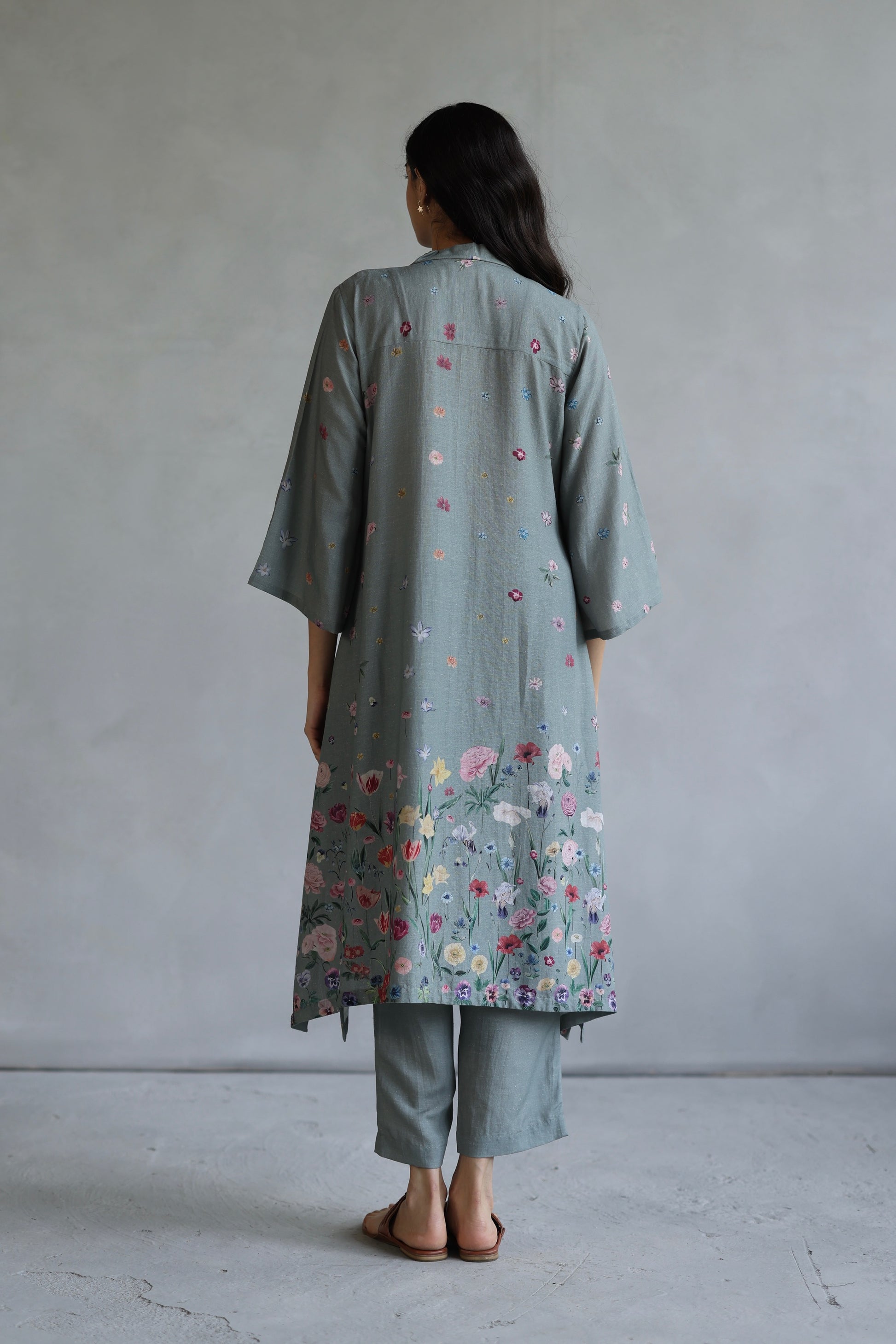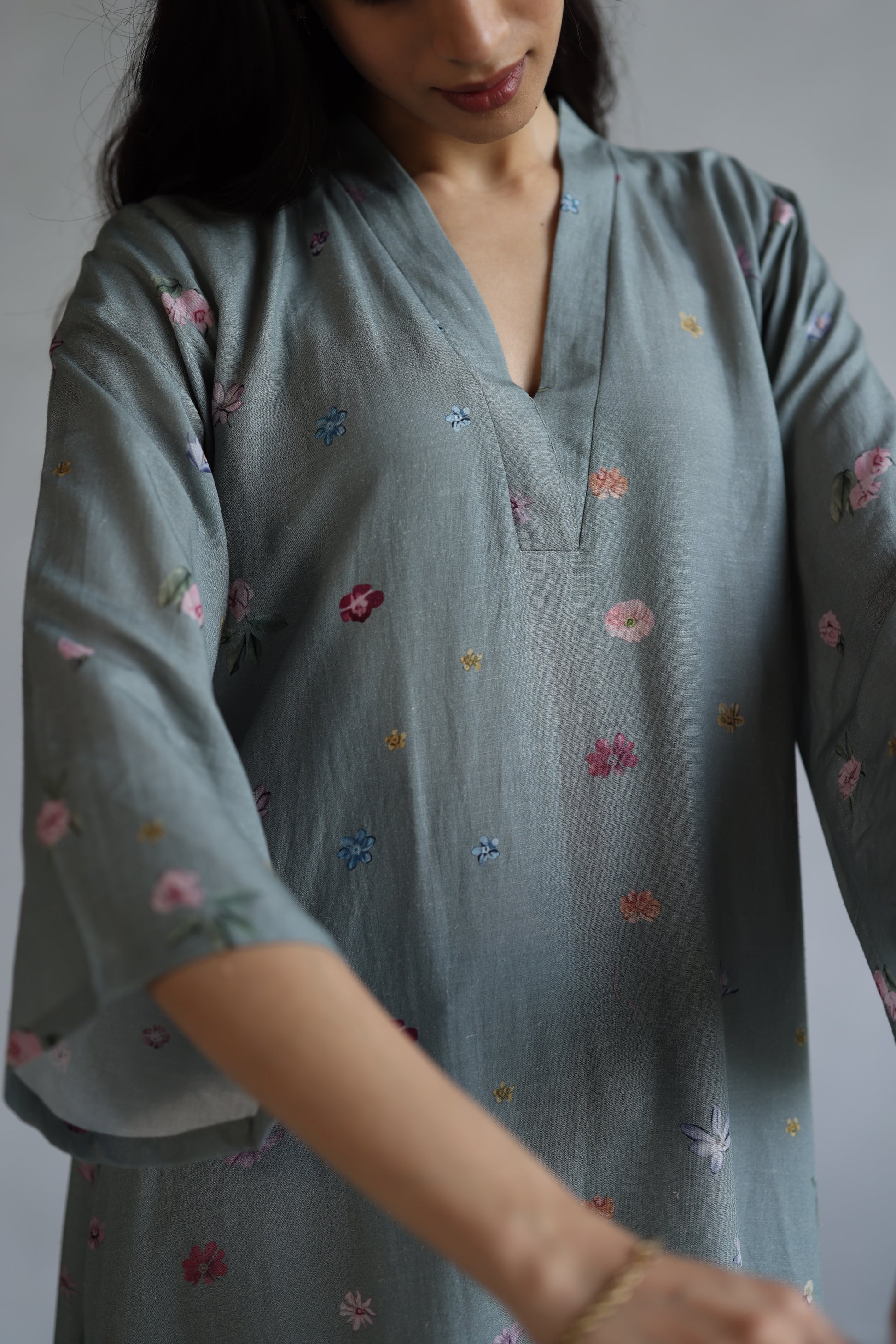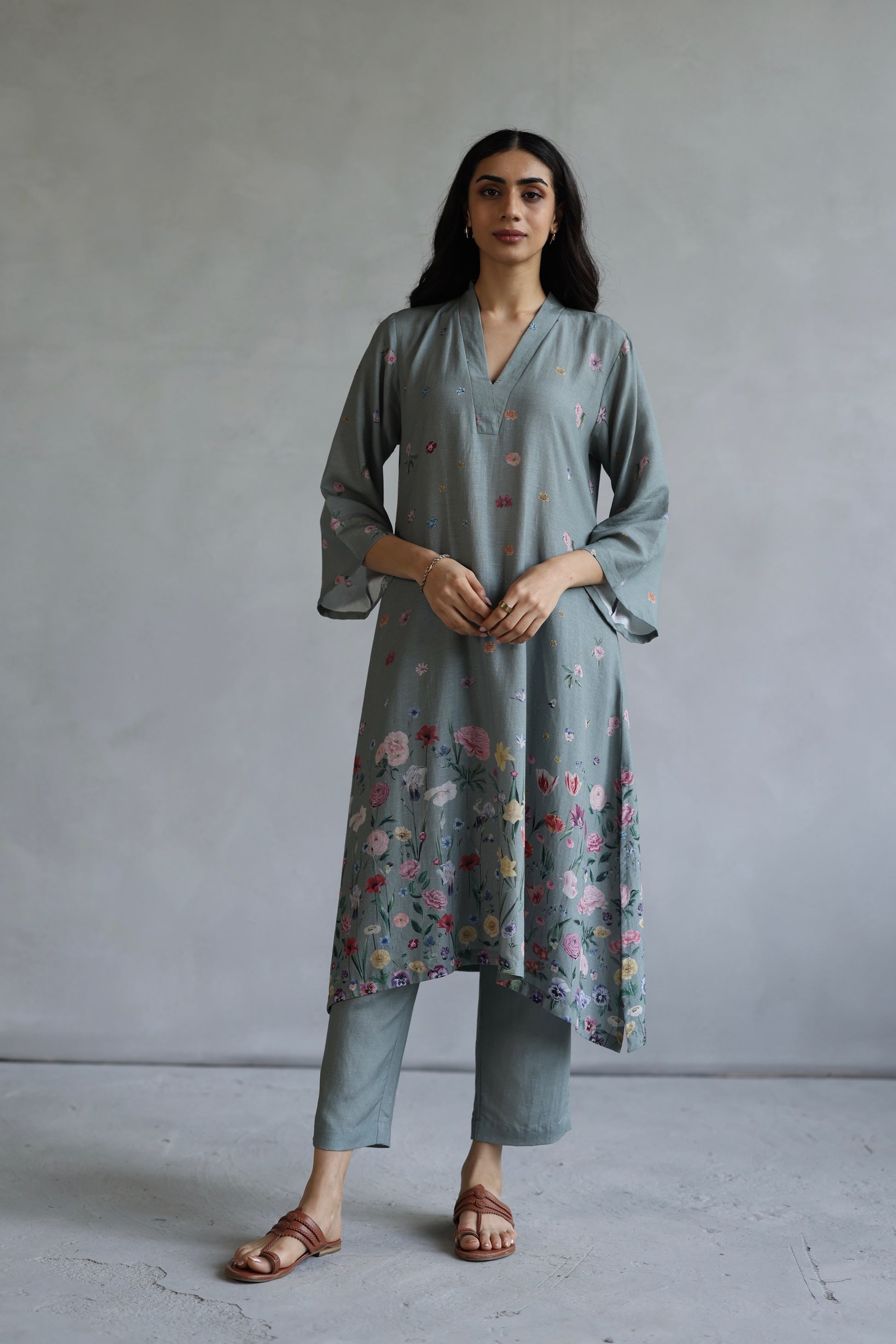 Crafted in breathable linen, the rosaline kurta set is adorned with delicate florals, with a fuller bloom along the sweep for a graceful touch. The effortlessly elegant silhouette is paired with straight pants, making it a perfect blend of comfort and sophistication. Can be paired with the rosaline stole for a full look.