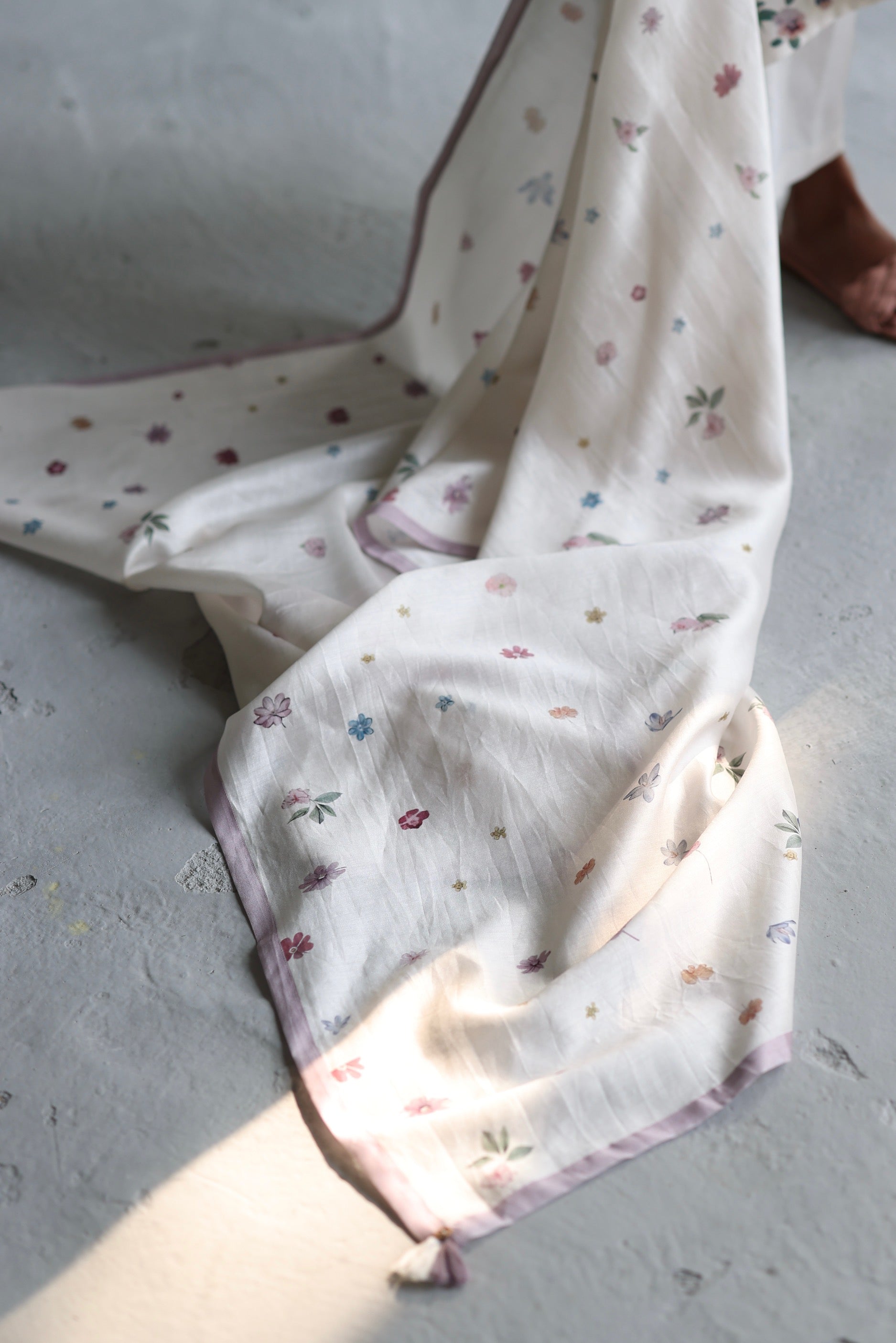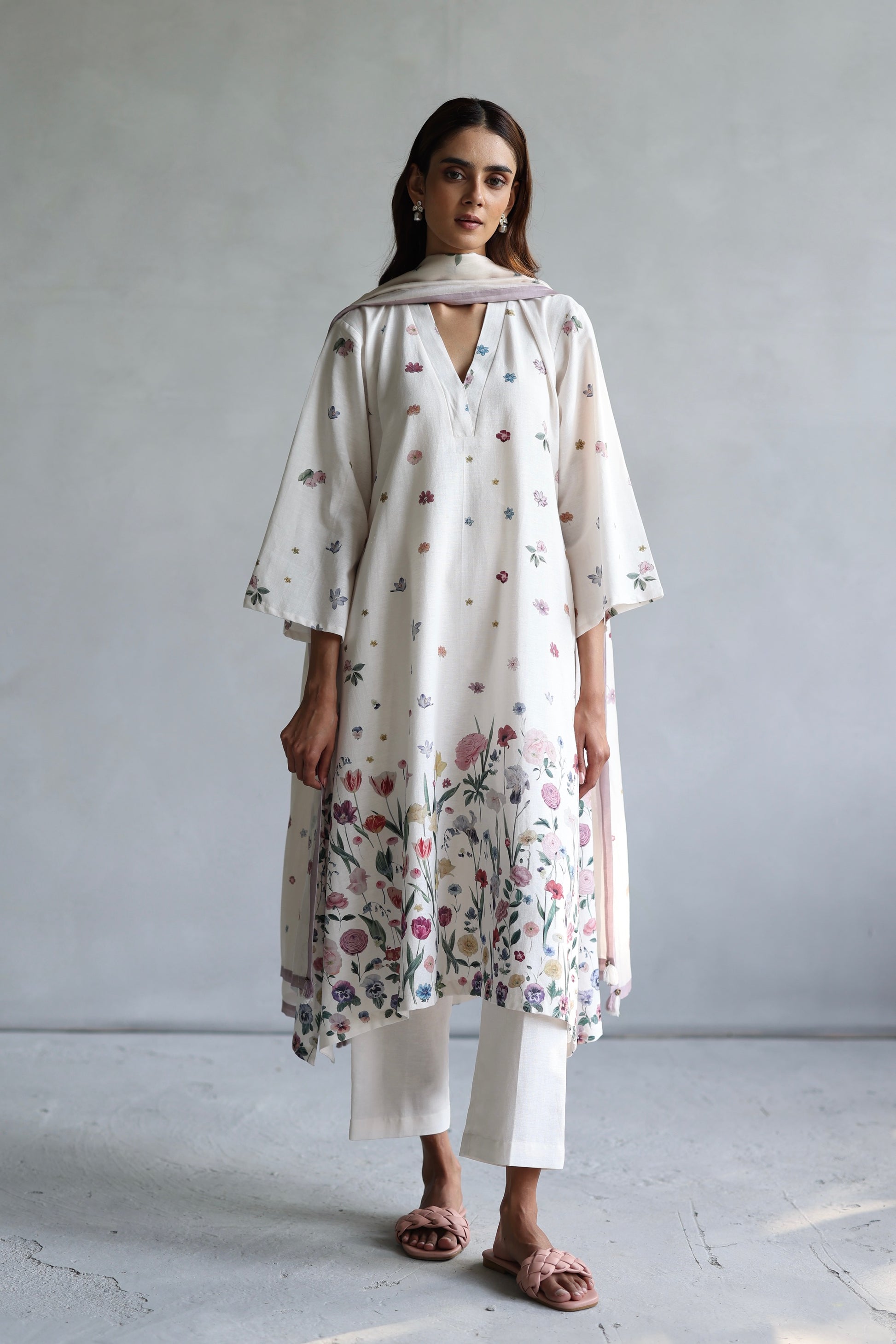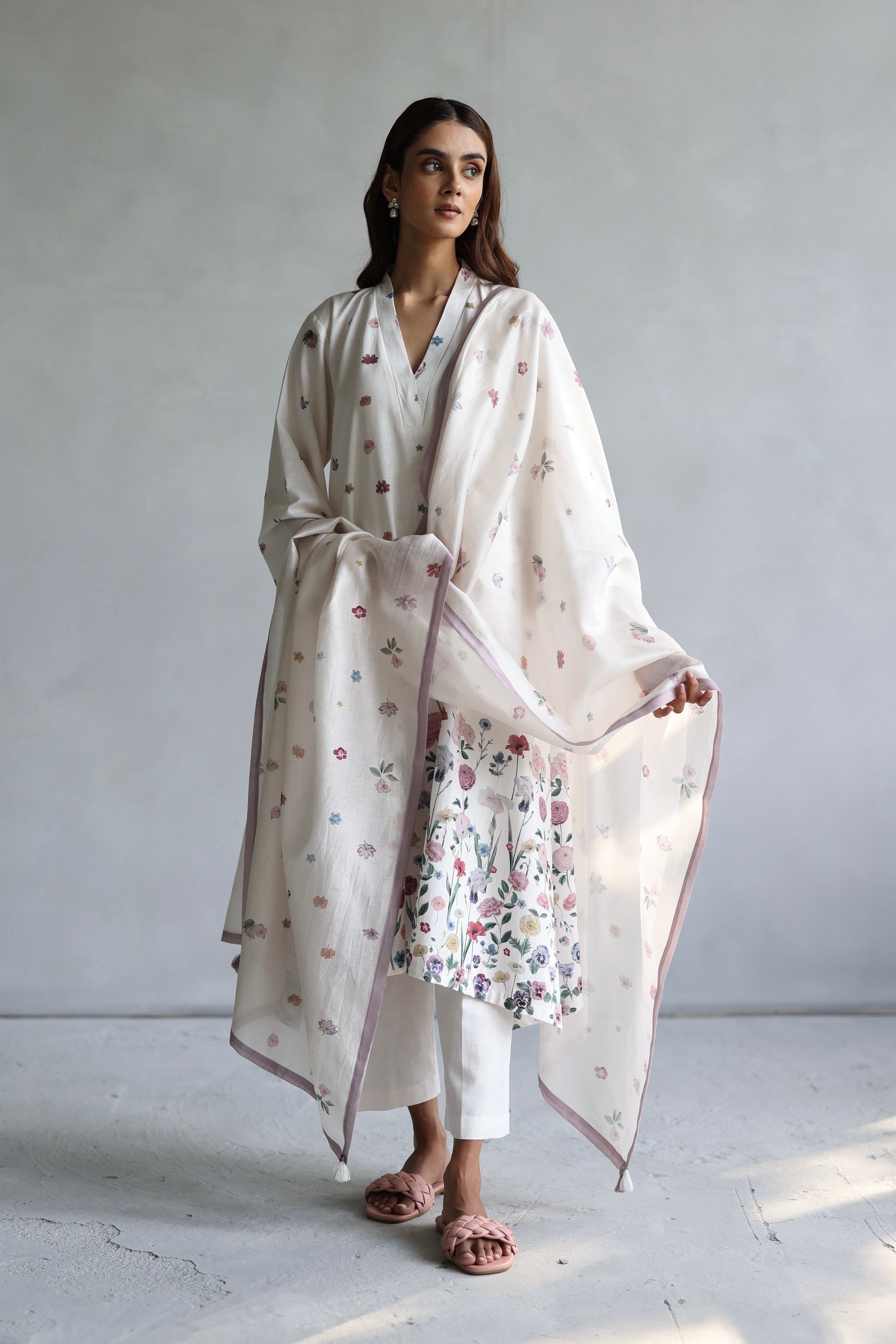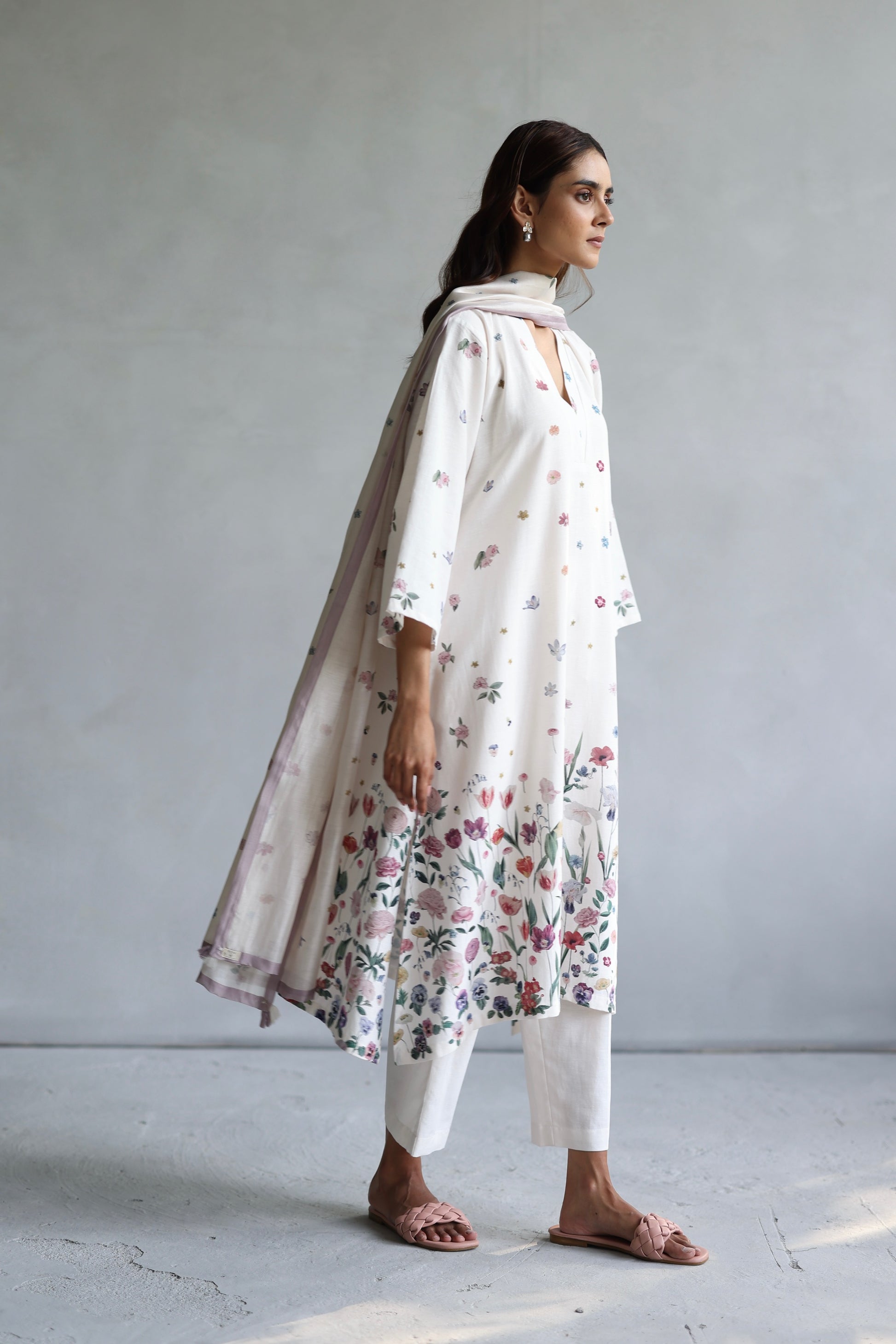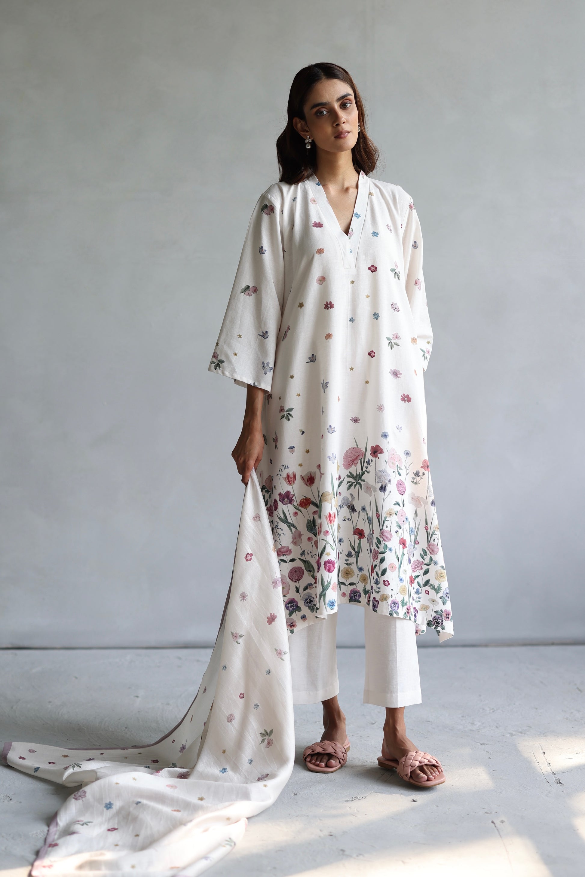 Crafted in breathable linen, the rosaline kurta set is adorned with delicate florals, with a fuller bloom along the sweep for a graceful touch. The effortlessly elegant silhouette is paired with straight pants, making it a perfect blend of comfort and sophistication. Can be paired with the rosaline stole for a full look.