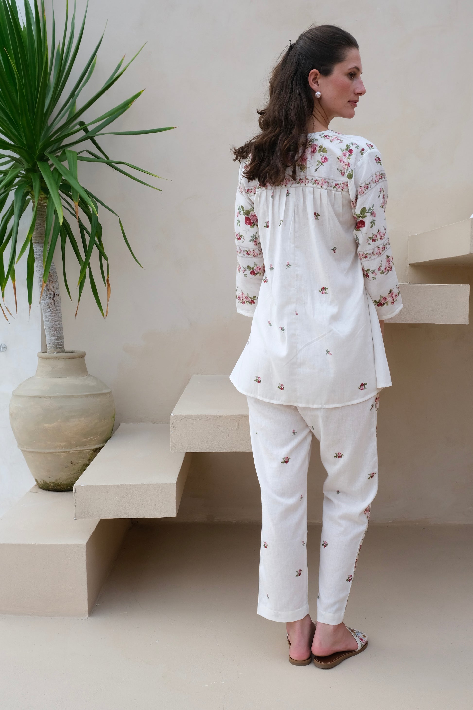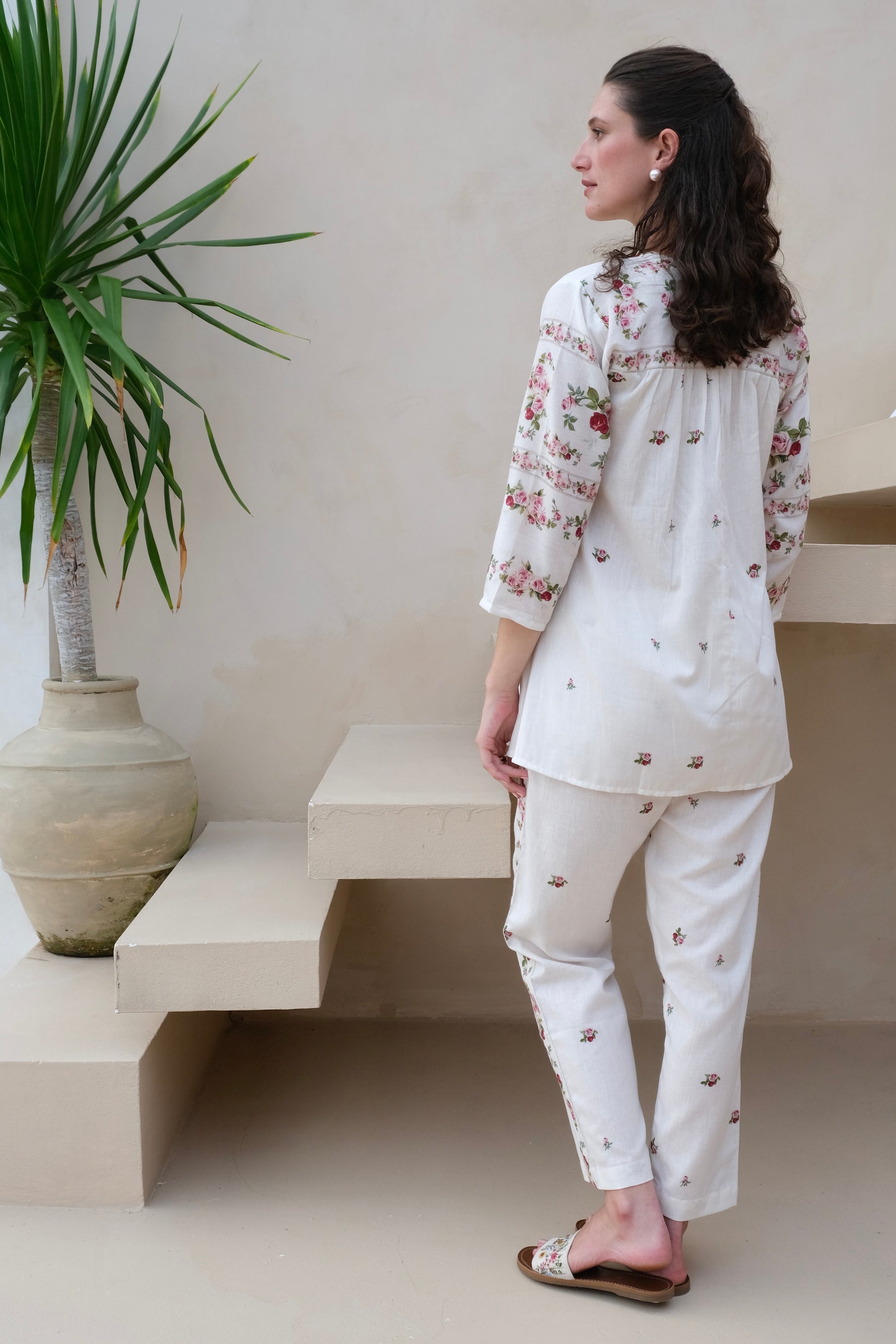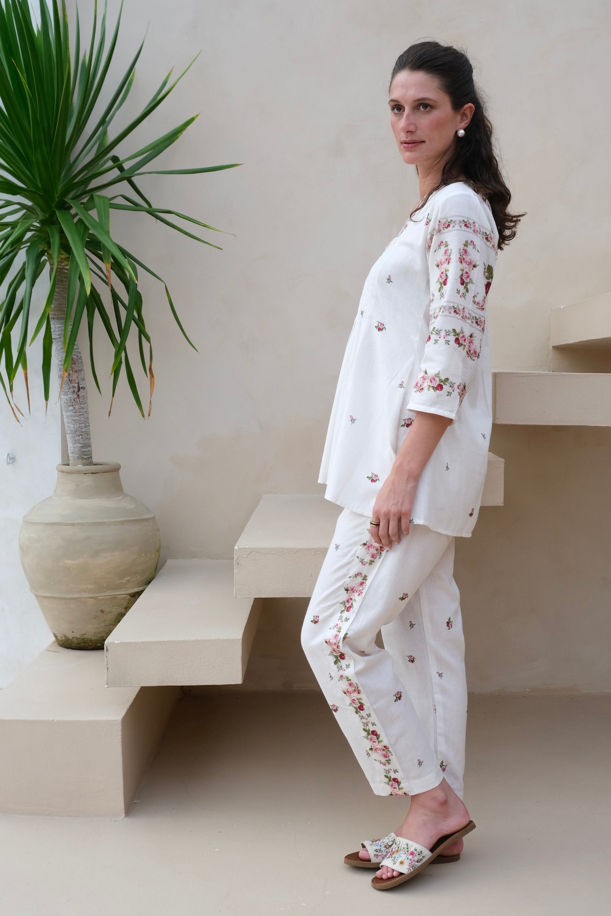 The chic and comfortable rose noir pants, with vintage rose print along the sides and all over the pants, perfectly complement our range of linen tops and tunics.