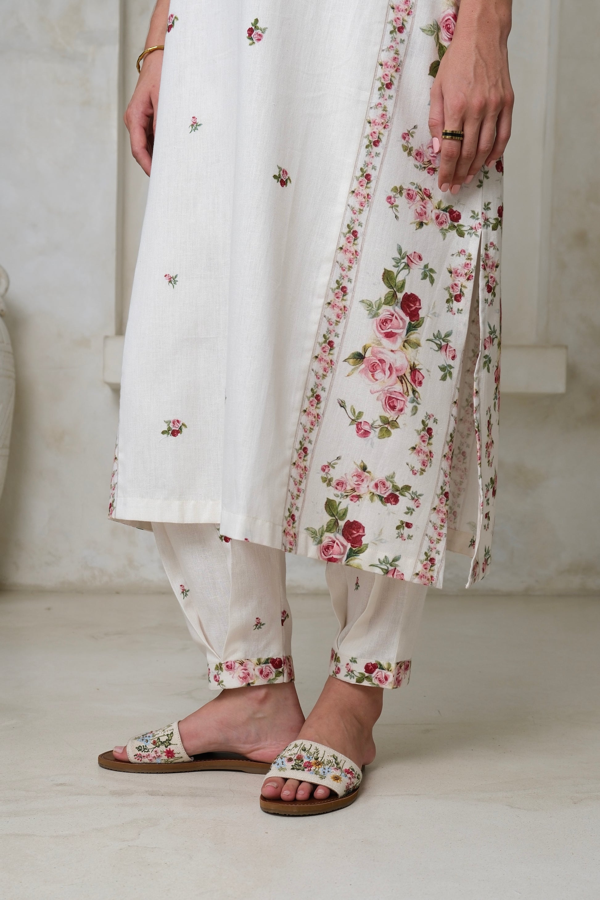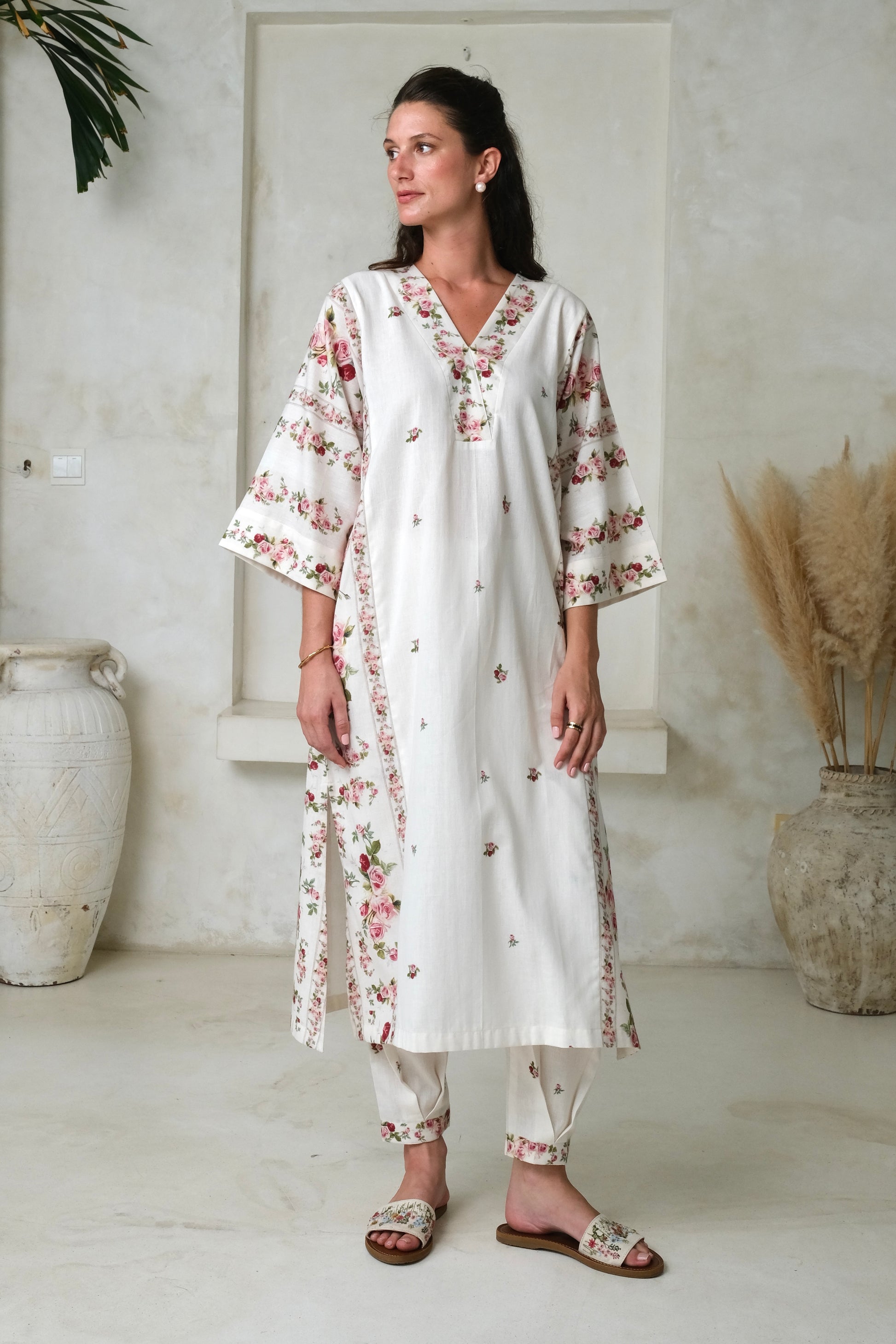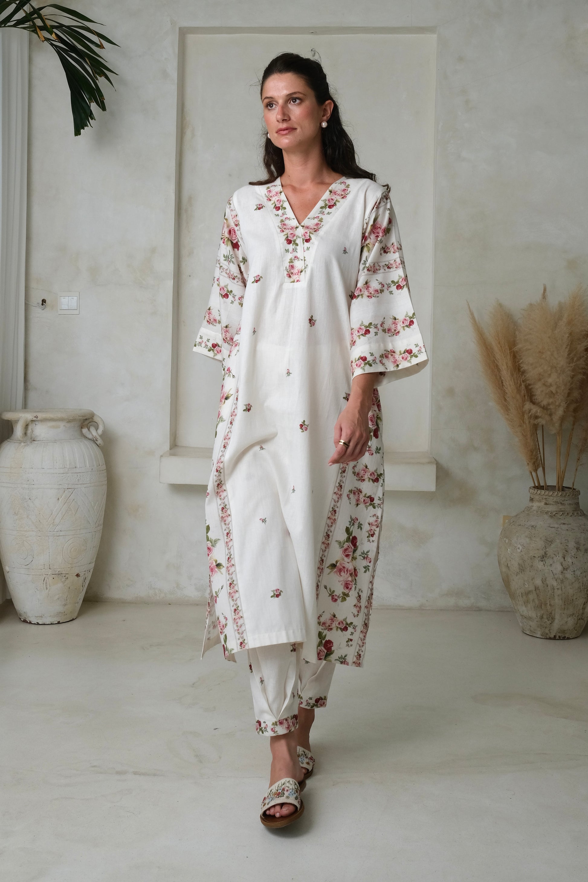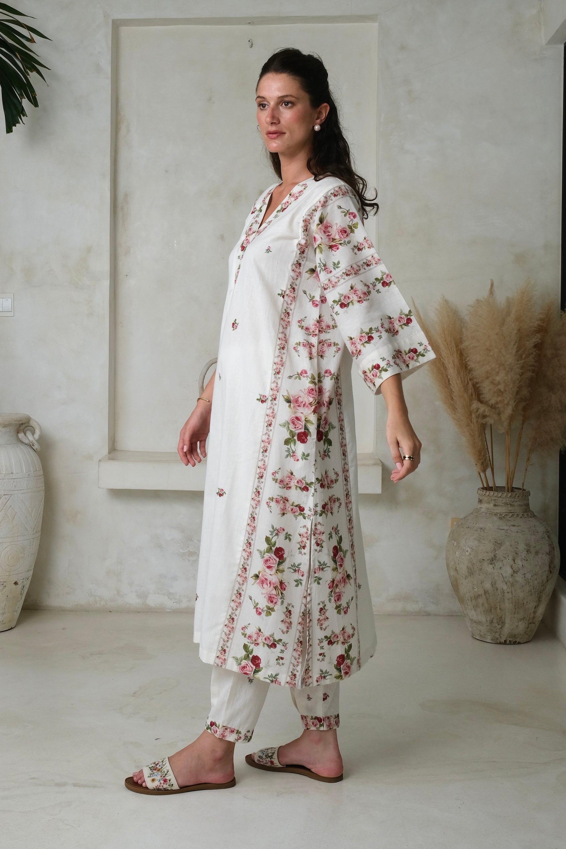The rose noir phiran set: a cozy and flattering set adorned with vintage rose prints, reminiscent of a beautiful european rose drawn across the kurta and sleeves as a sublime painting with tiny rose all over. Paired perfectly with pleated pants in a matching print.
