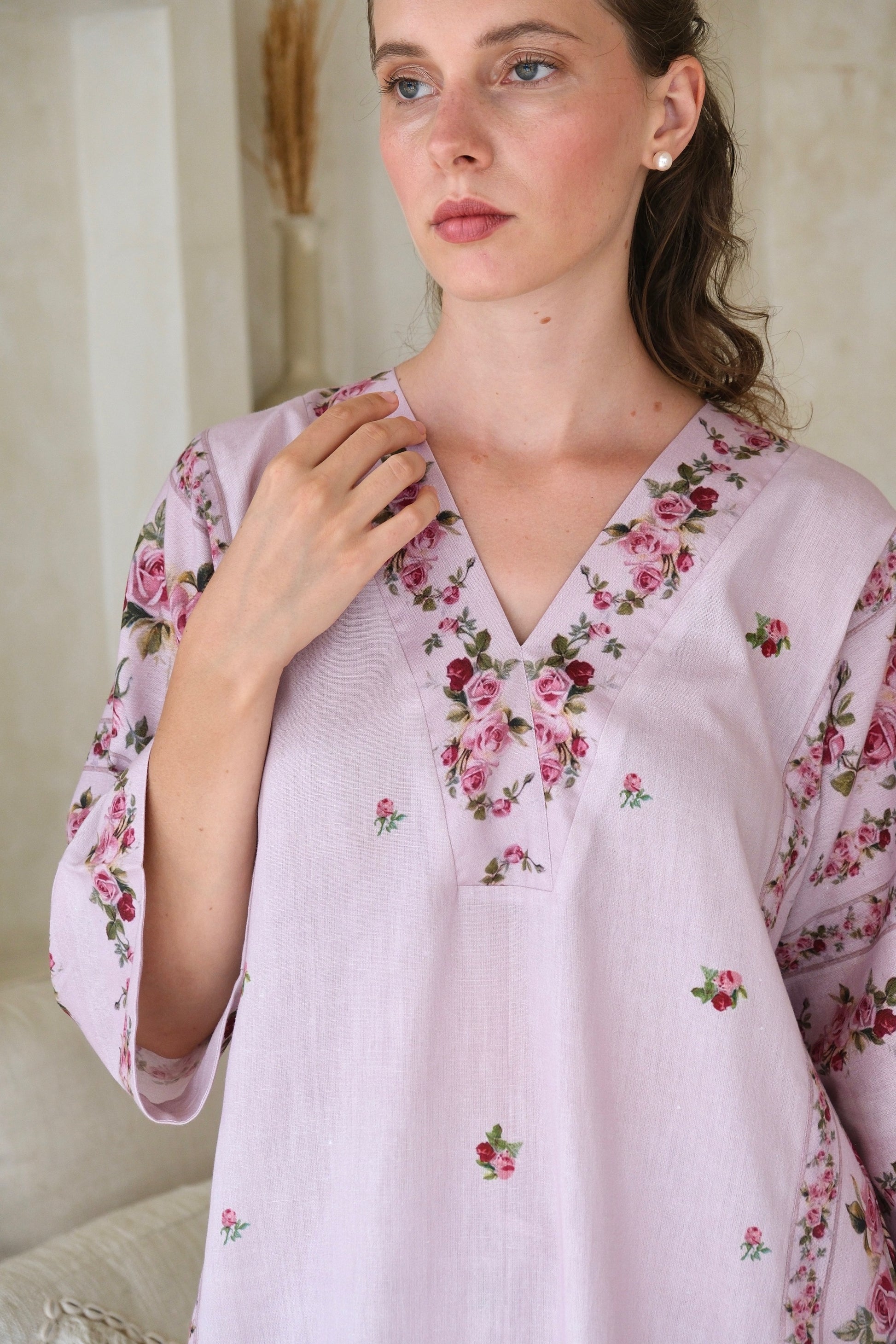 The rose noir phiran set: a cozy and flattering set adorned with vintage rose prints, reminiscent of a beautiful european rose drawn across the kurta and sleeves as a sublime painting with tiny rose all over. Paired perfectly with pleated pants in a matching print.