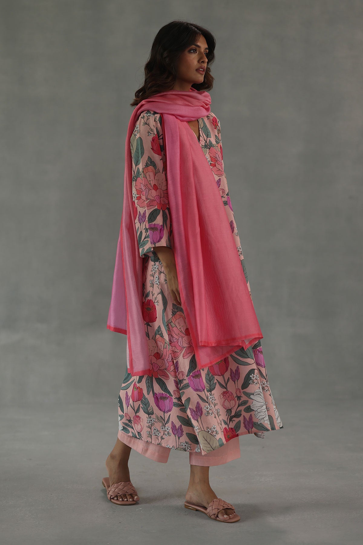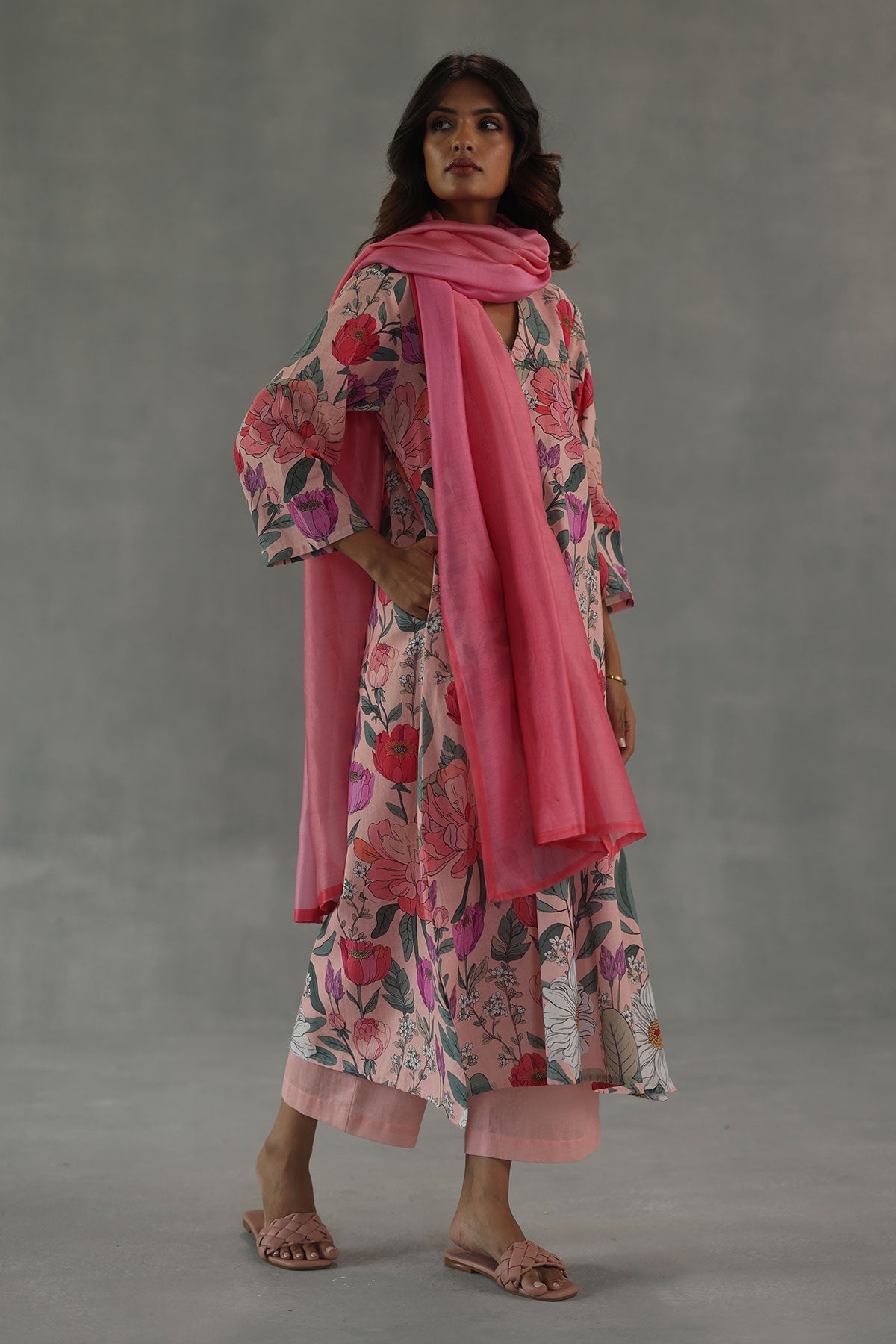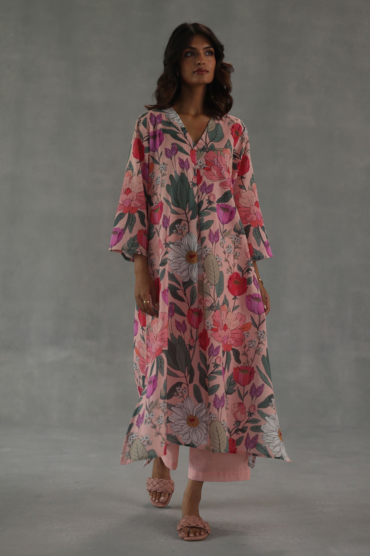 Bright, fresh, and full of life, the roseate kurta set is crafted in soft fabric with an easy a-line silhouette. The kurta and pants are adorned with vibrant watercolor florals in pink and green, creating a playful yet elegant look. Light and effortless, it’s a perfect choice for joyful days and colorful celebrations.