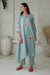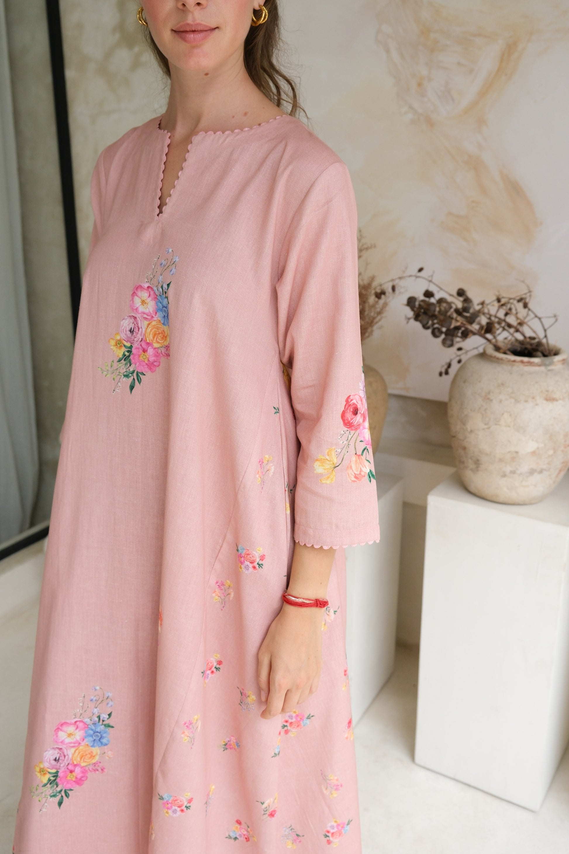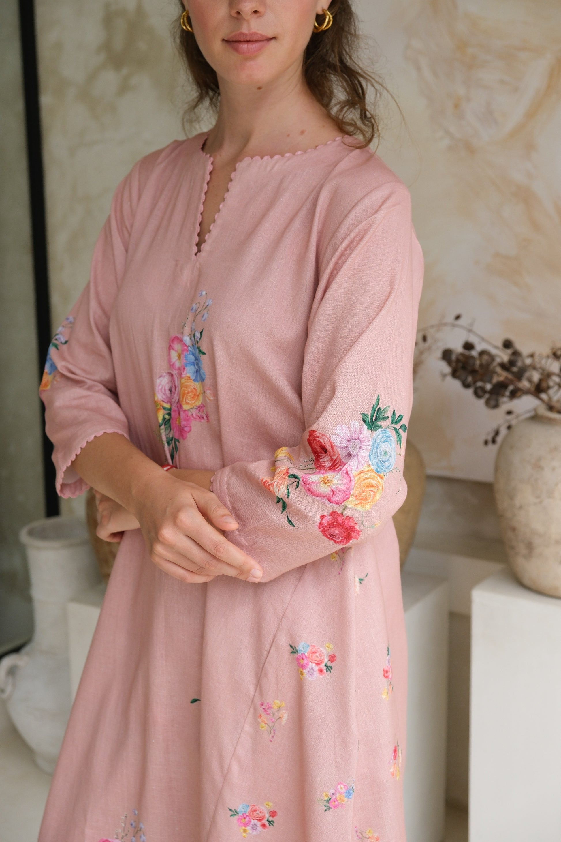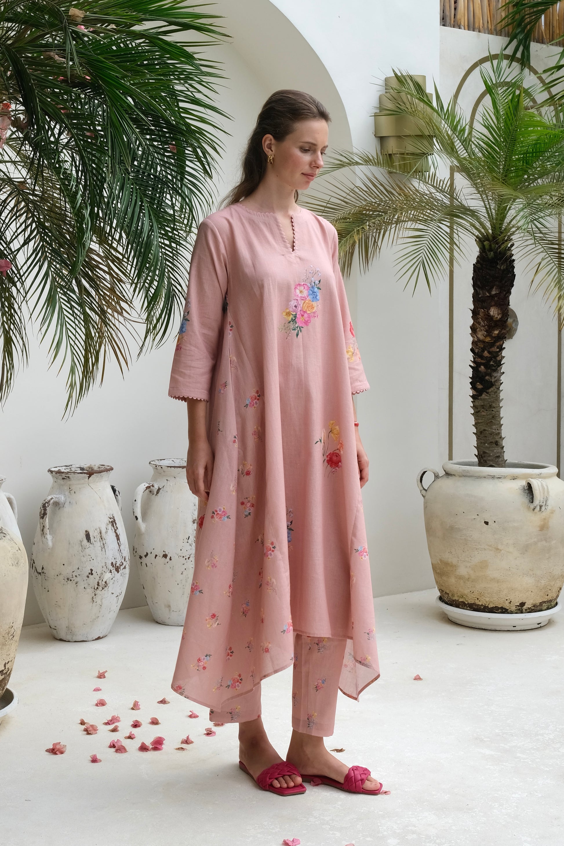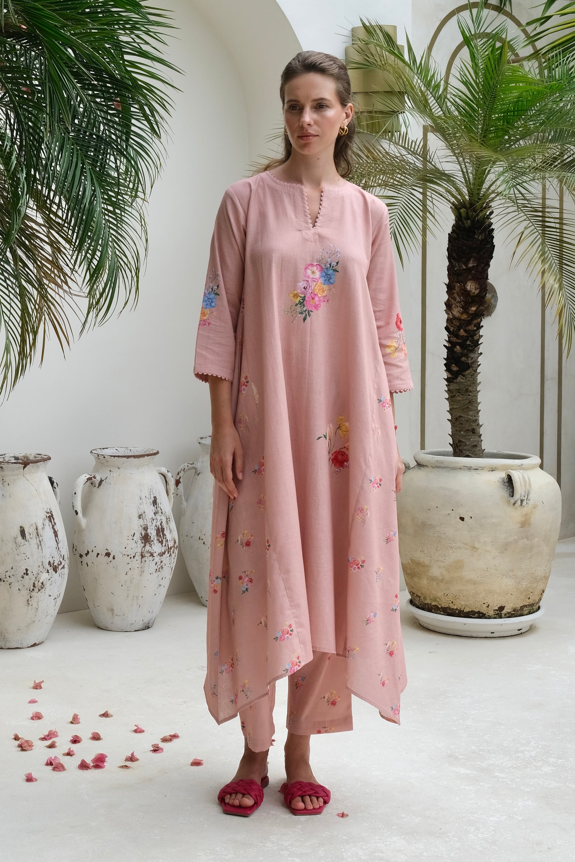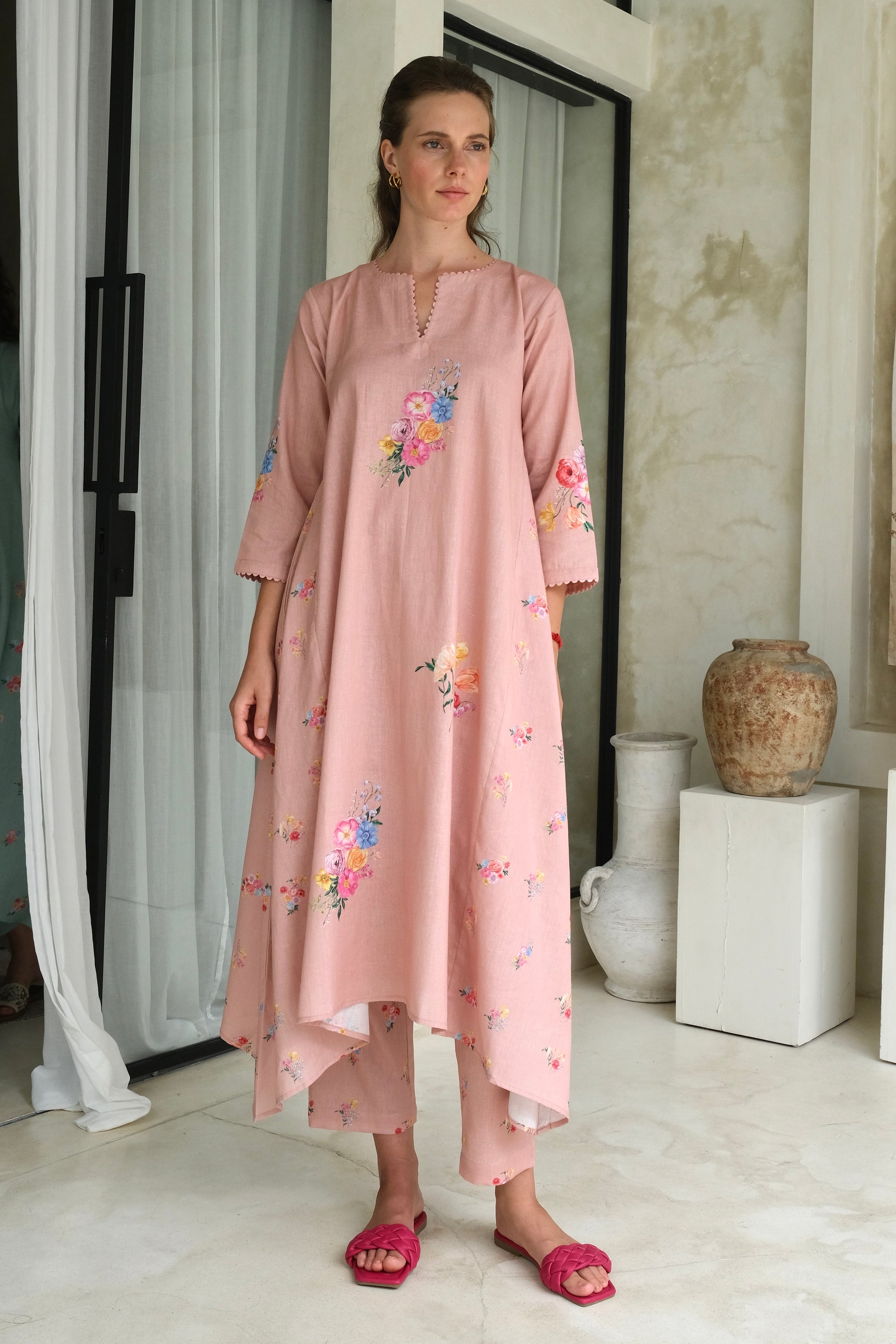 The perfect a-line kurta set in linen features scalloped detailing on the kurta with a cluster of watercolor flowers. The standout feature of the kurta is the cascading droopings on the side, making it a perfect choice for any soiree.
