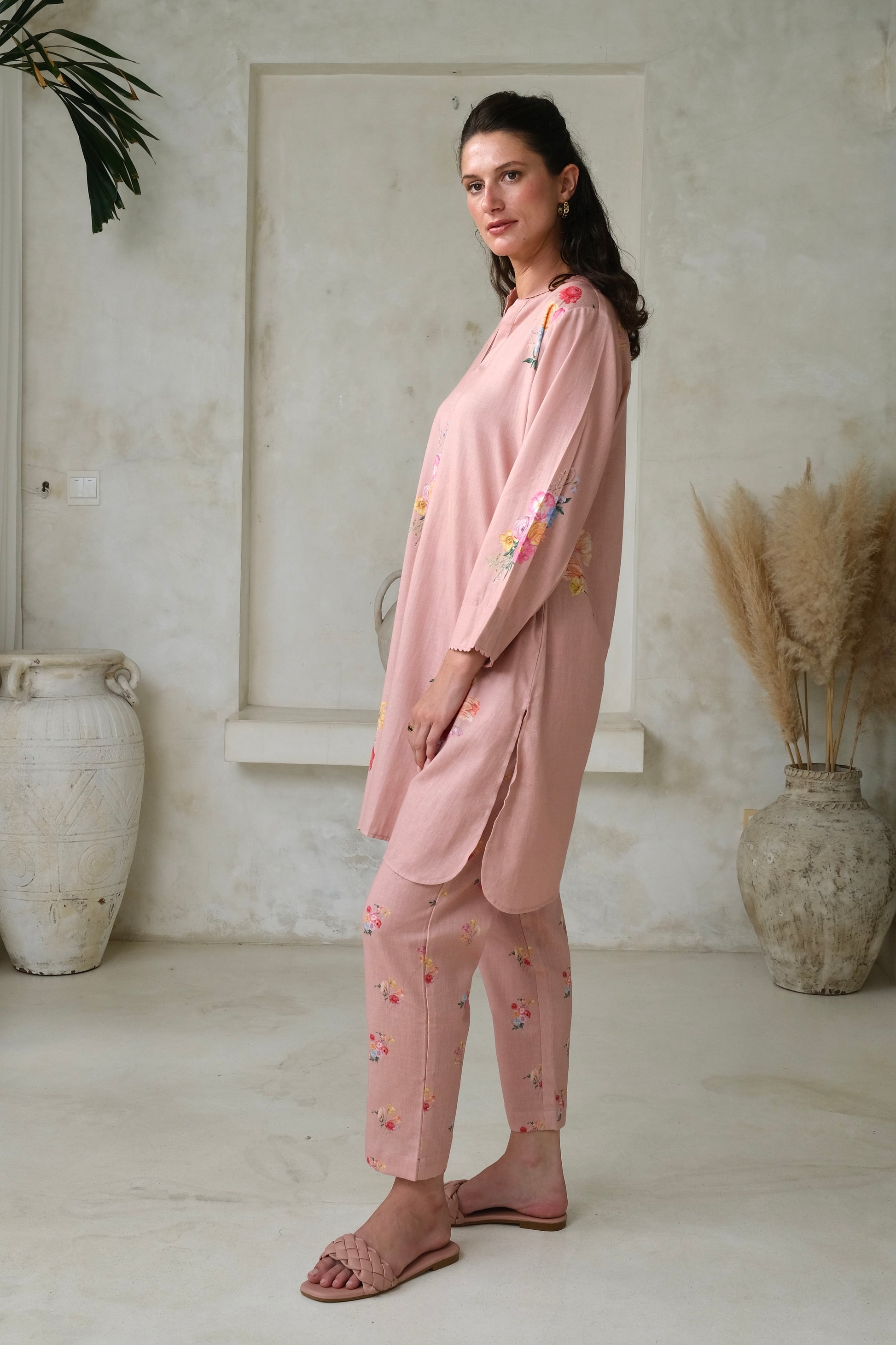 Linen co-ord set with a breezy a-line tunic and relaxed pants in a comfort fit. The co-ord features roza's signature watercolour print and can be carried from day to night.