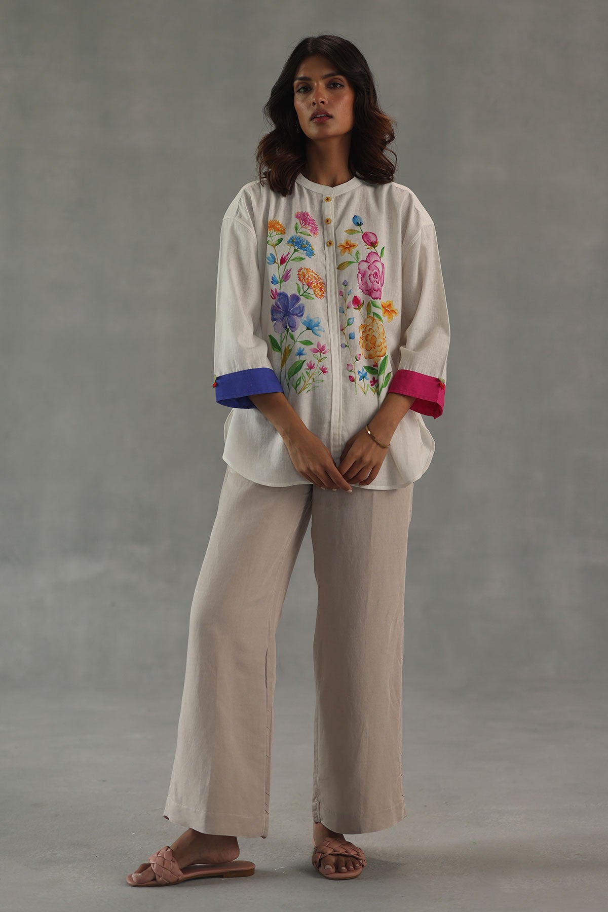 Playful yet refined, the secret garden top features a short silhouette with contrasting navy blue and fuchsia cuffs, framed by soft watercolor florals on the front panel. Designed with a round neck collar and accented with charming contrasting buttons, this top brings a touch of whimsy and color to everyday dressing.