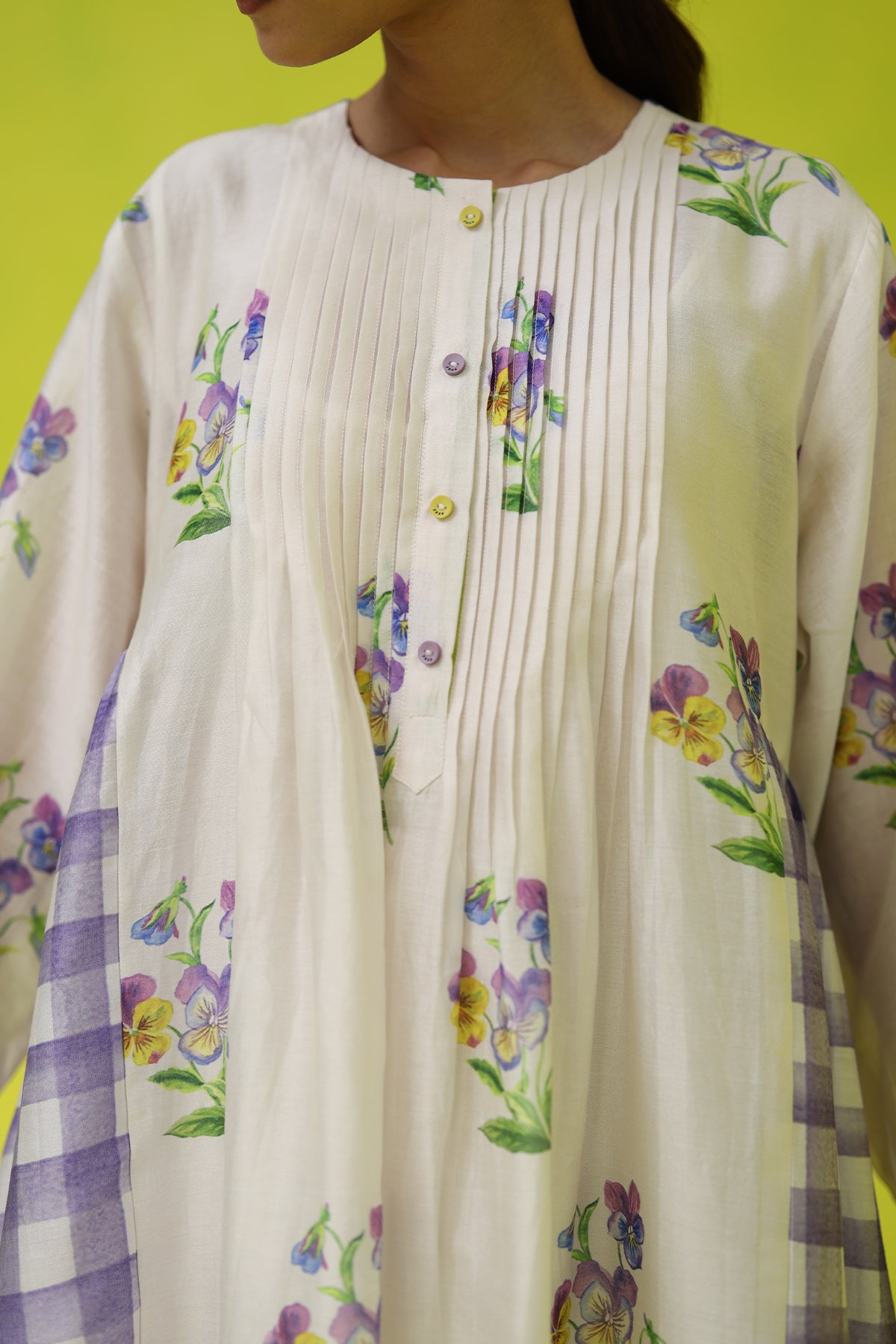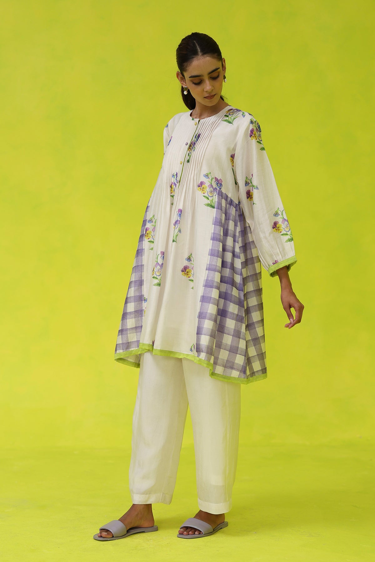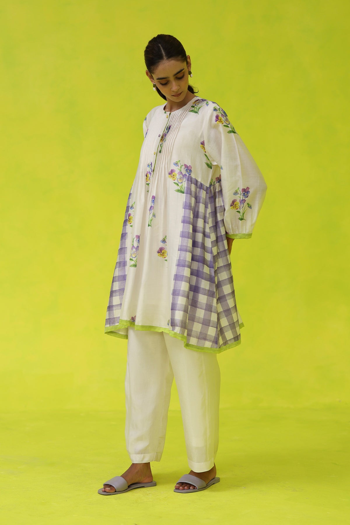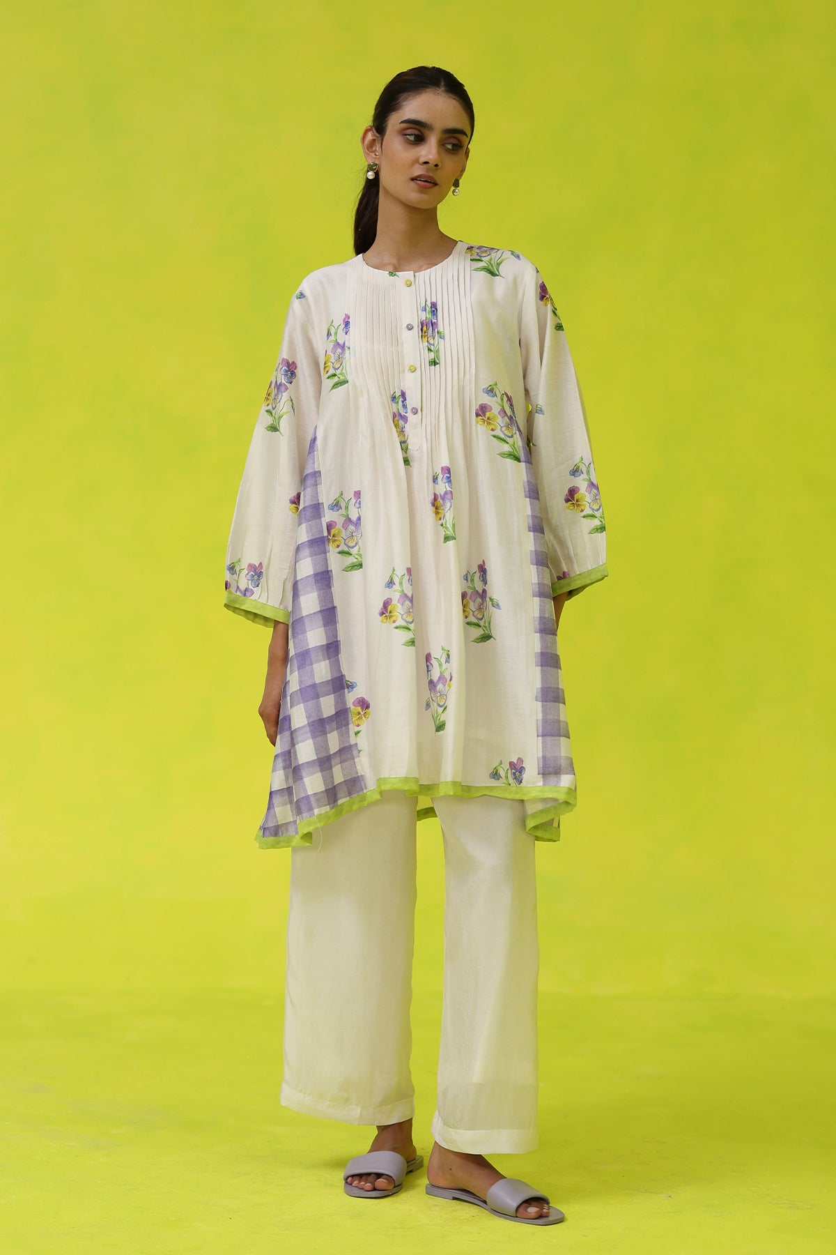 Effortless and elevated, the seminyak co-ord blends dreamy florals and gentle checks on a soft ivory chanderi canvas. The hand-drawn purple motifs give it a slow-crafted feel, while the tailored yet relaxed fit makes it perfect for days when you want to feel dressed, not done up. Wear it together or mix it up this one’s made to travel light and look good.