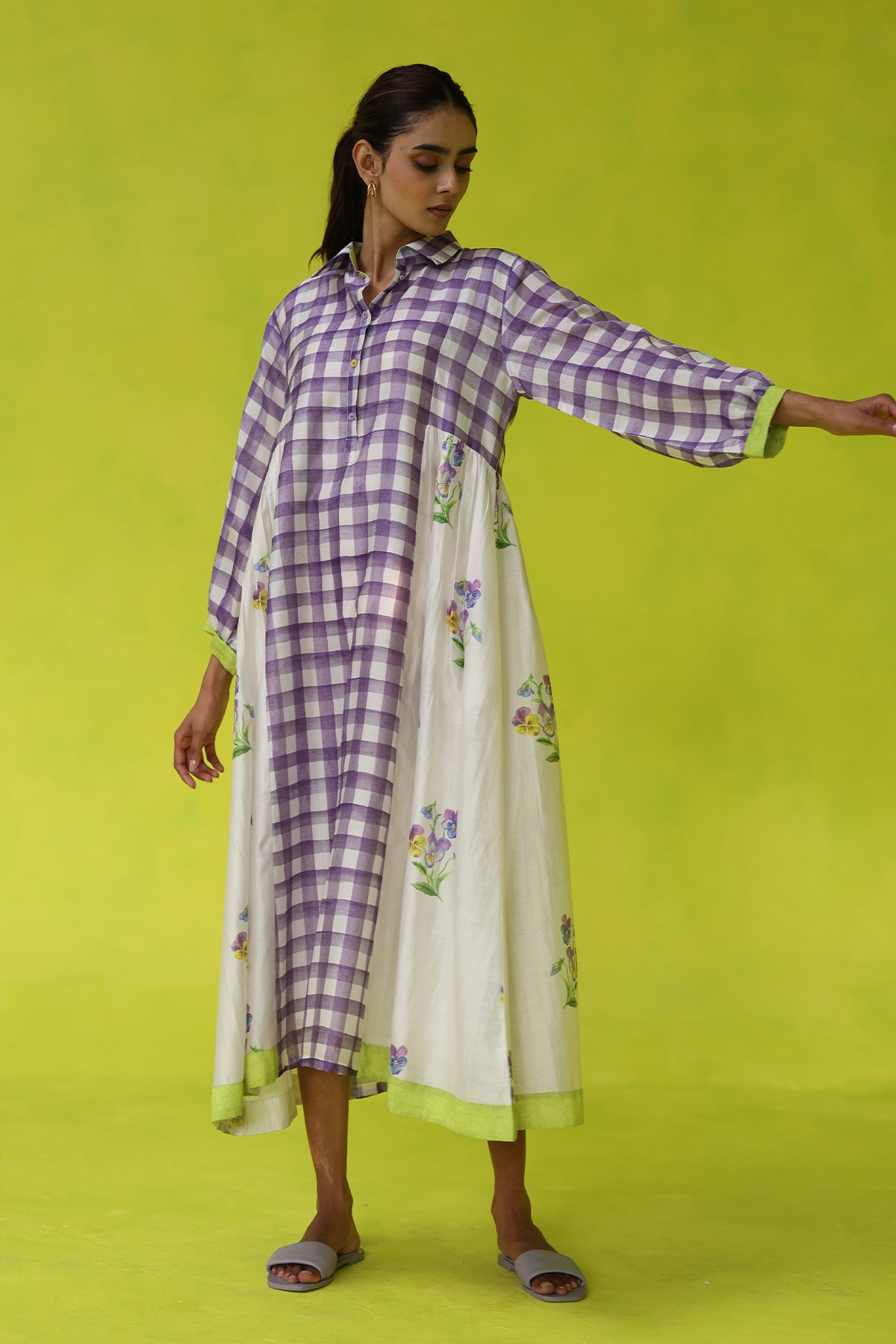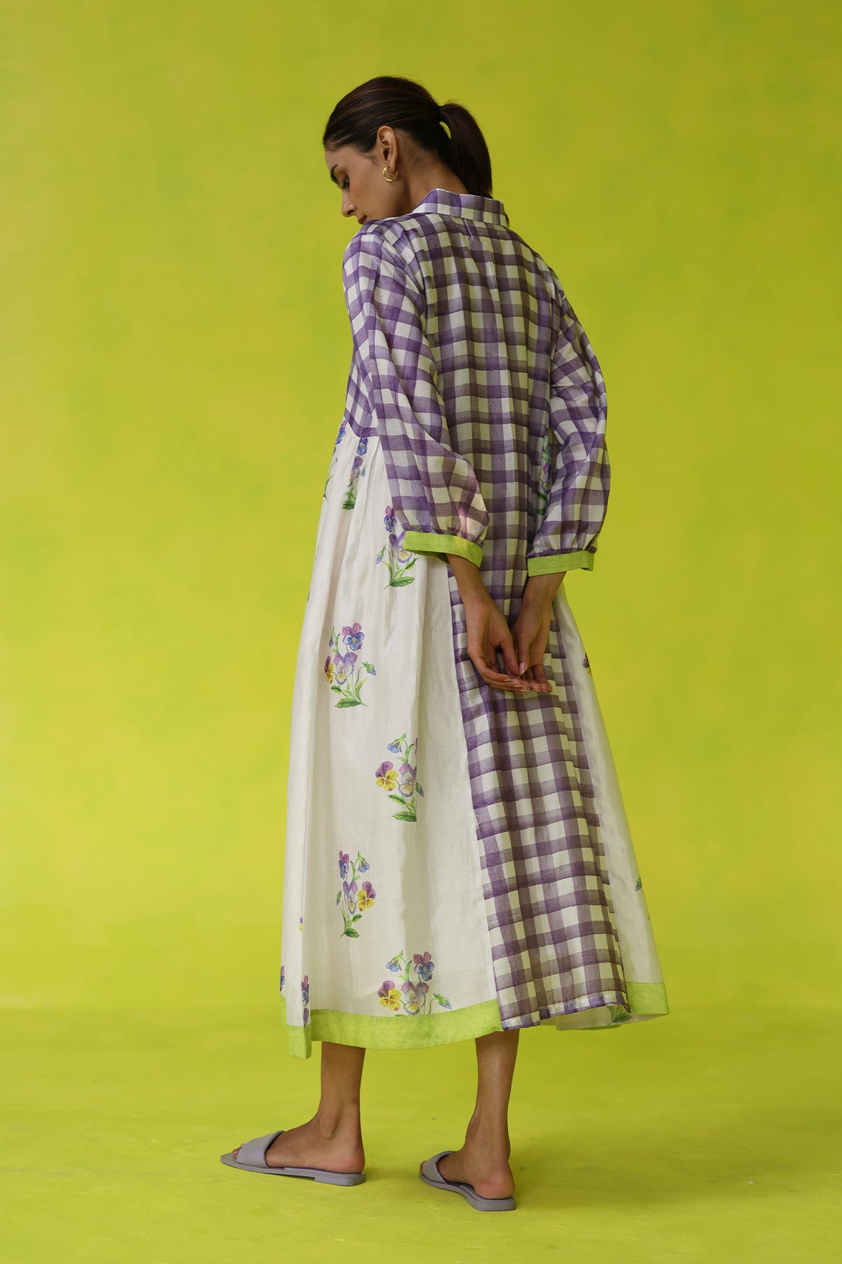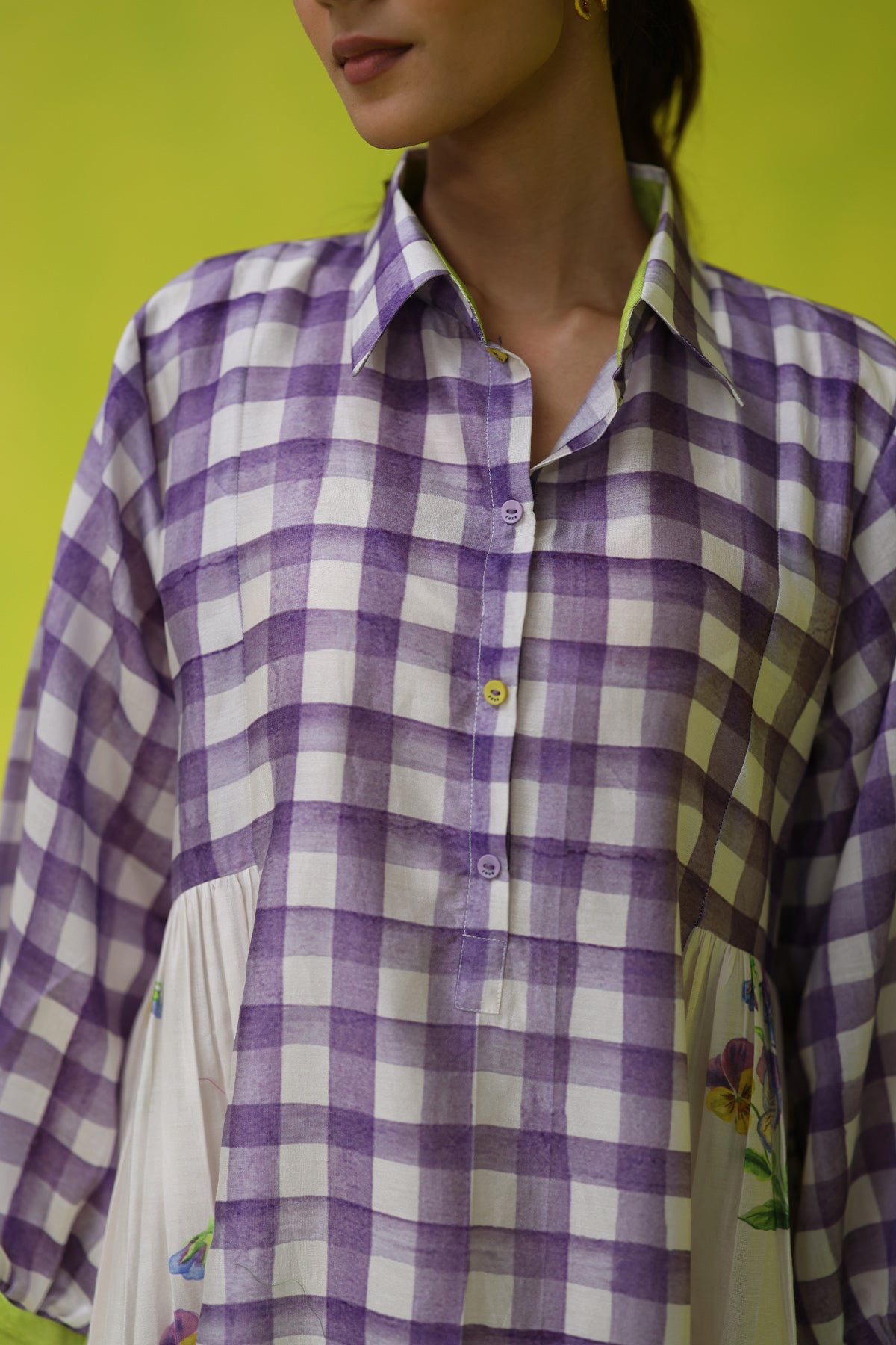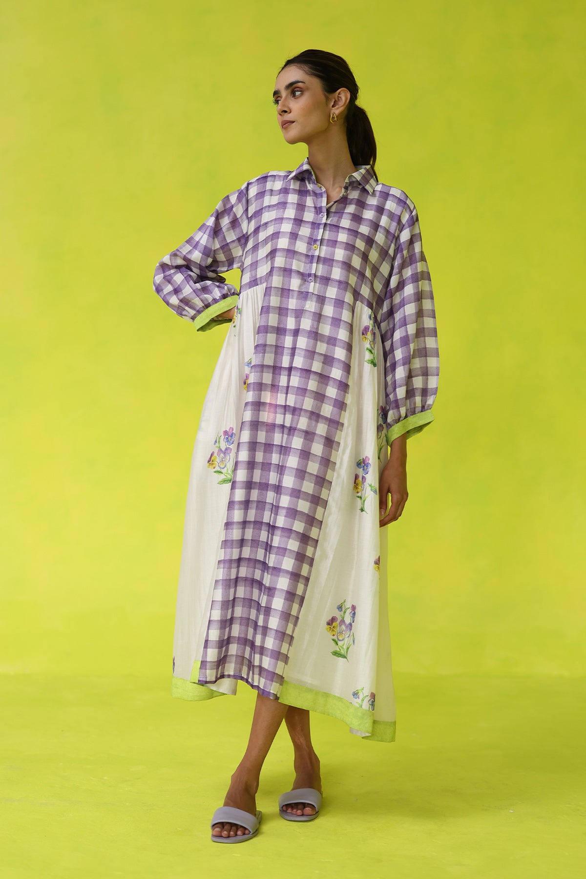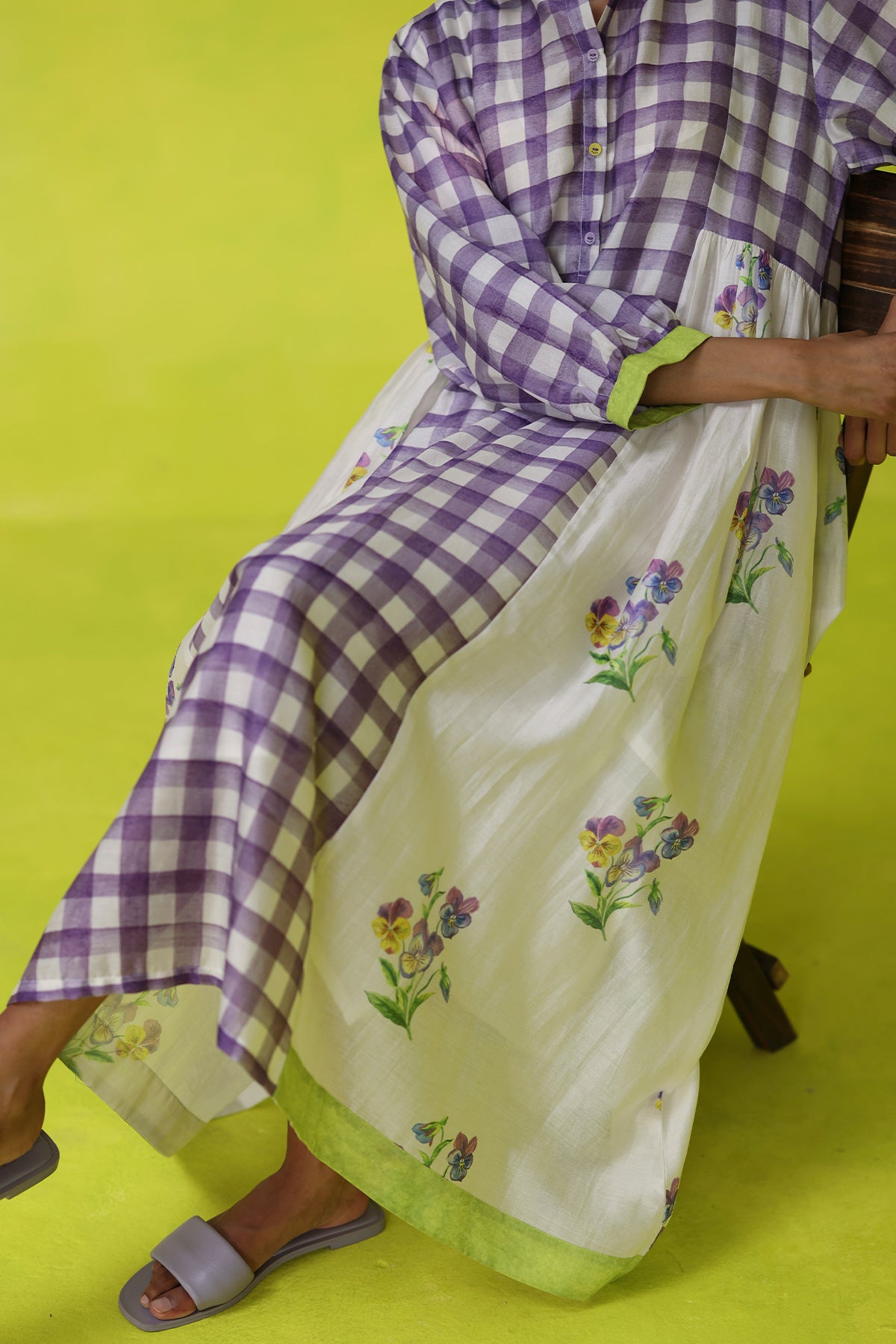 Light as a breeze and artfully detailed, the seminyak dress captures easy elegance with its ivory chanderi base, hand-sketched purple florals, and soft checkered accents. Designed with a relaxed silhouette and subtle structure, it’s the kind of piece that moves effortlessly from day to dinner with just the right touch of whimsy.