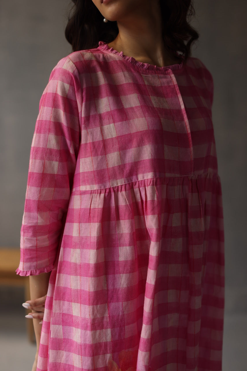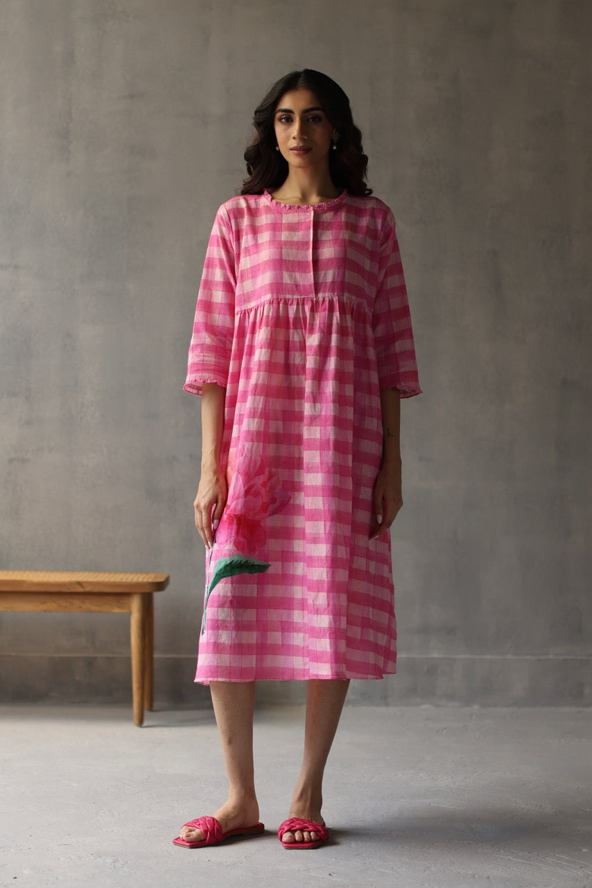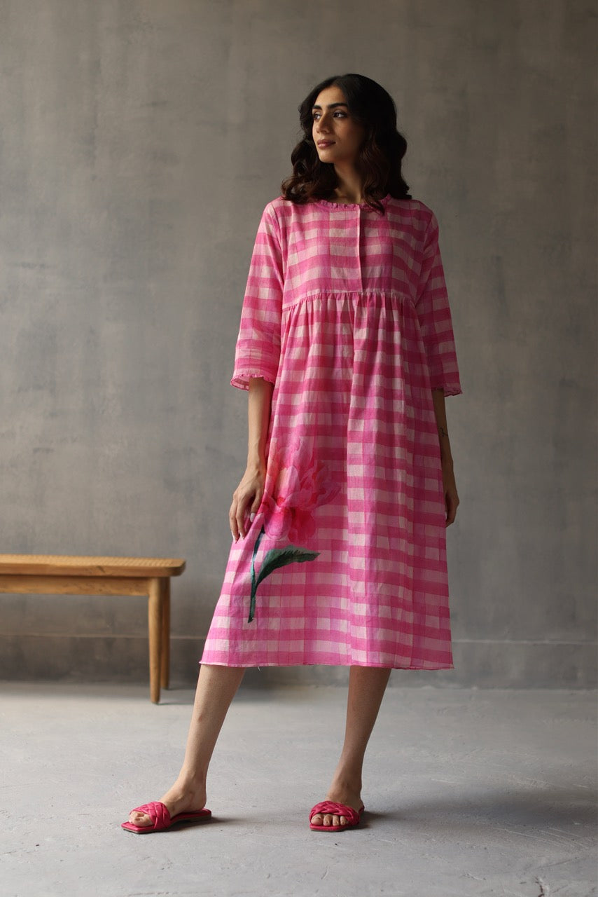 The seville a-line dress features dainty pleates on the yoke with an open front panel. The sleeves have a similar pleating along with a hand painted watercolour check and a hand drawn flower.