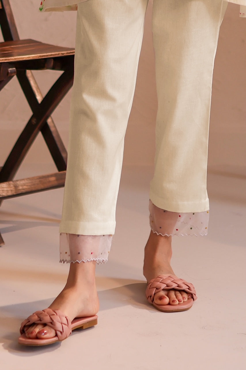 A pair of linen pants in a mauve colour with organza trimmings on the bottom with an organza trim with hand embroidered polkas for a pop of colour.