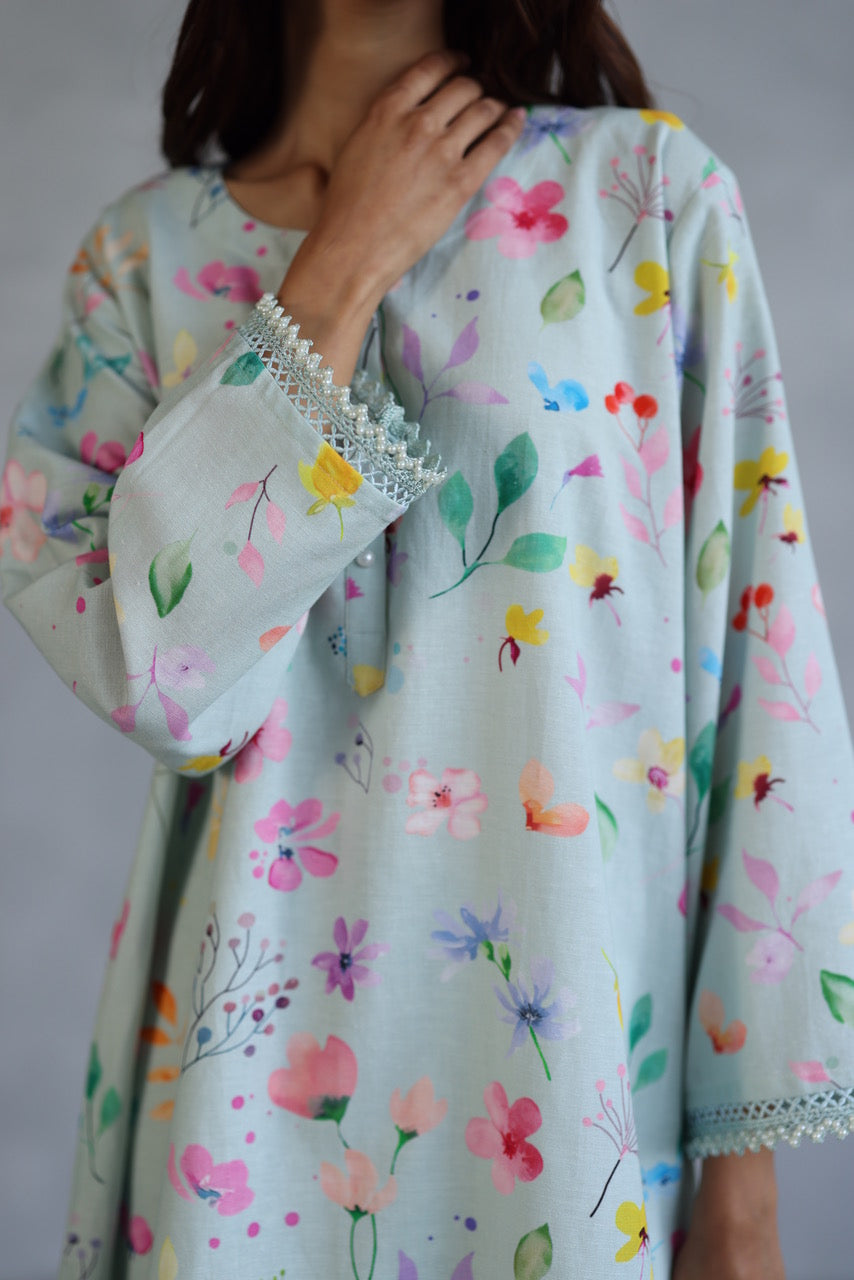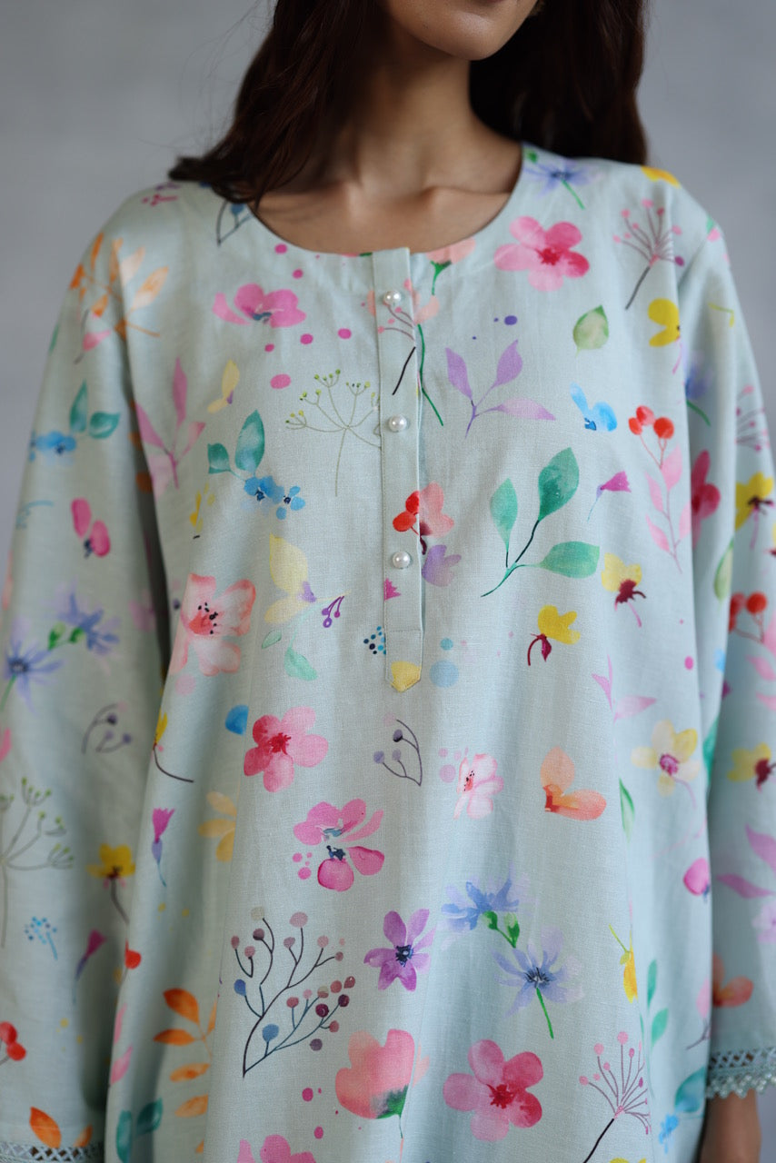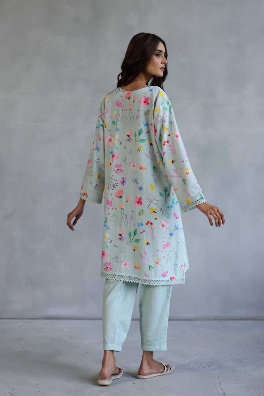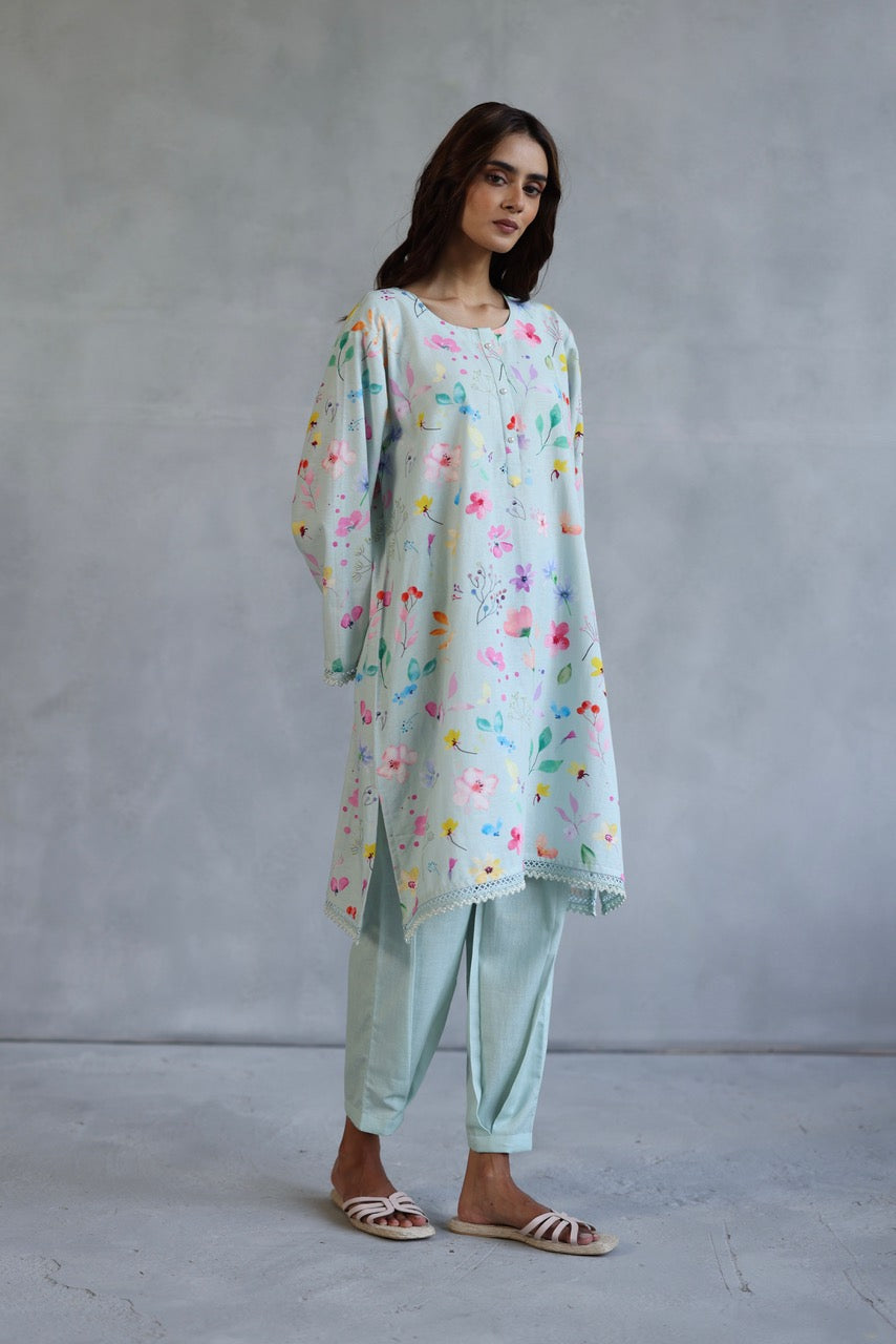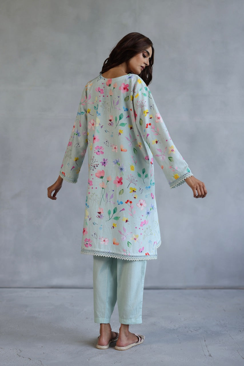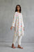Gracefully adorned with delicate floral motifs, this mid-length ivory kurta is a vision of effortless charm. Beaded buttons add a hint of elegance, while intricate lace detailing on the sleeves enhances its femininity. Paired with tapered salwar pants, this set is perfect for days that call for subtle sophistication and breezy comfort.