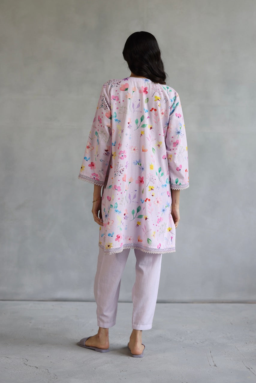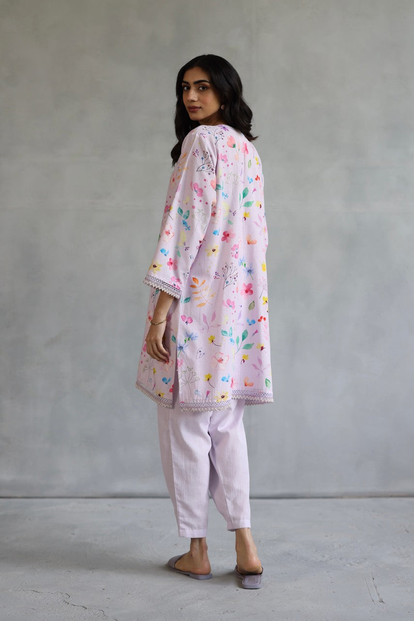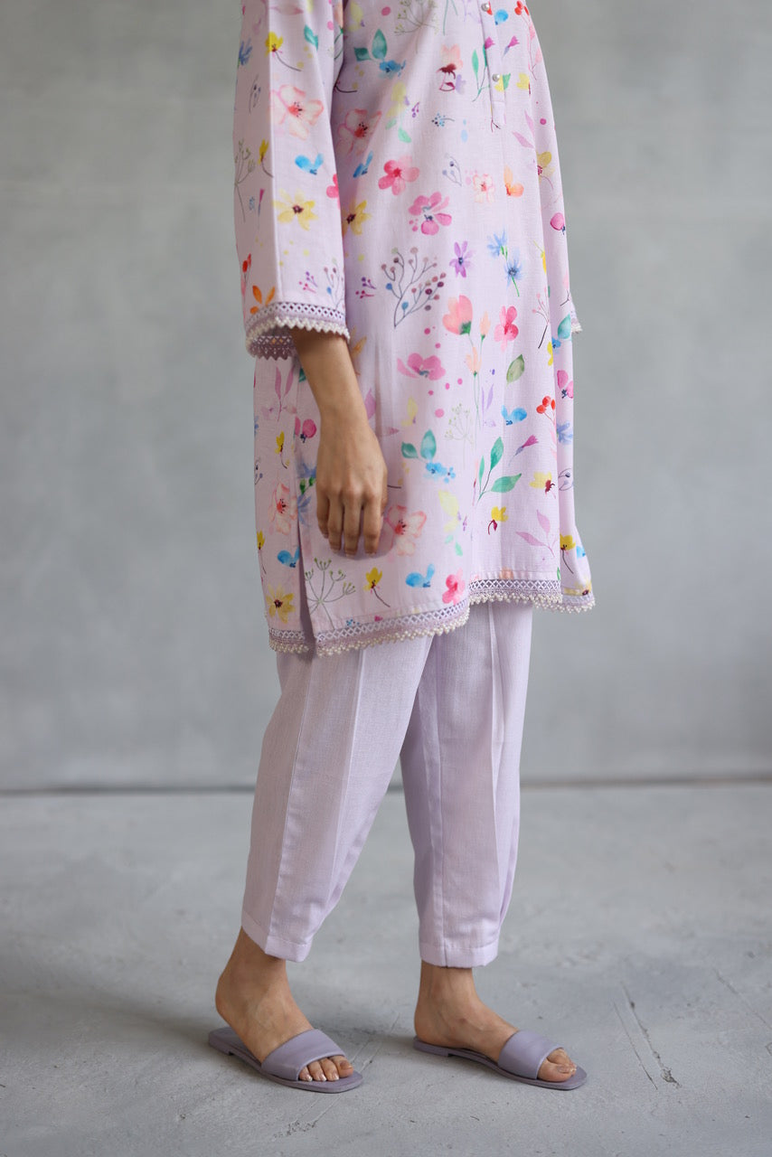 Gracefully adorned with delicate floral motifs, this mid-length ivory kurta is a vision of effortless charm. Beaded buttons add a hint of elegance, while intricate lace detailing on the sleeves enhances its femininity. Paired with tapered salwar pants, this set is perfect for days that call for subtle sophistication and breezy comfort.