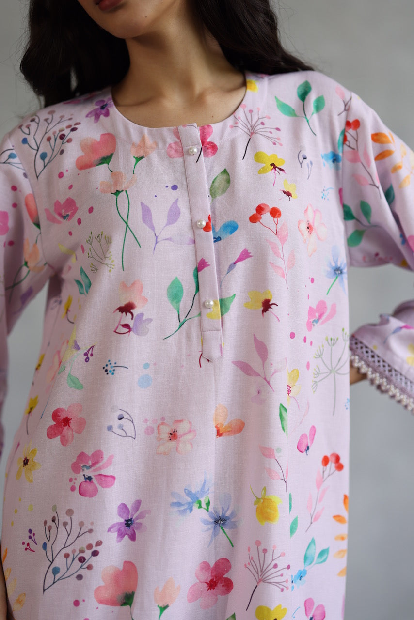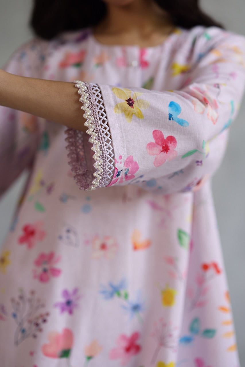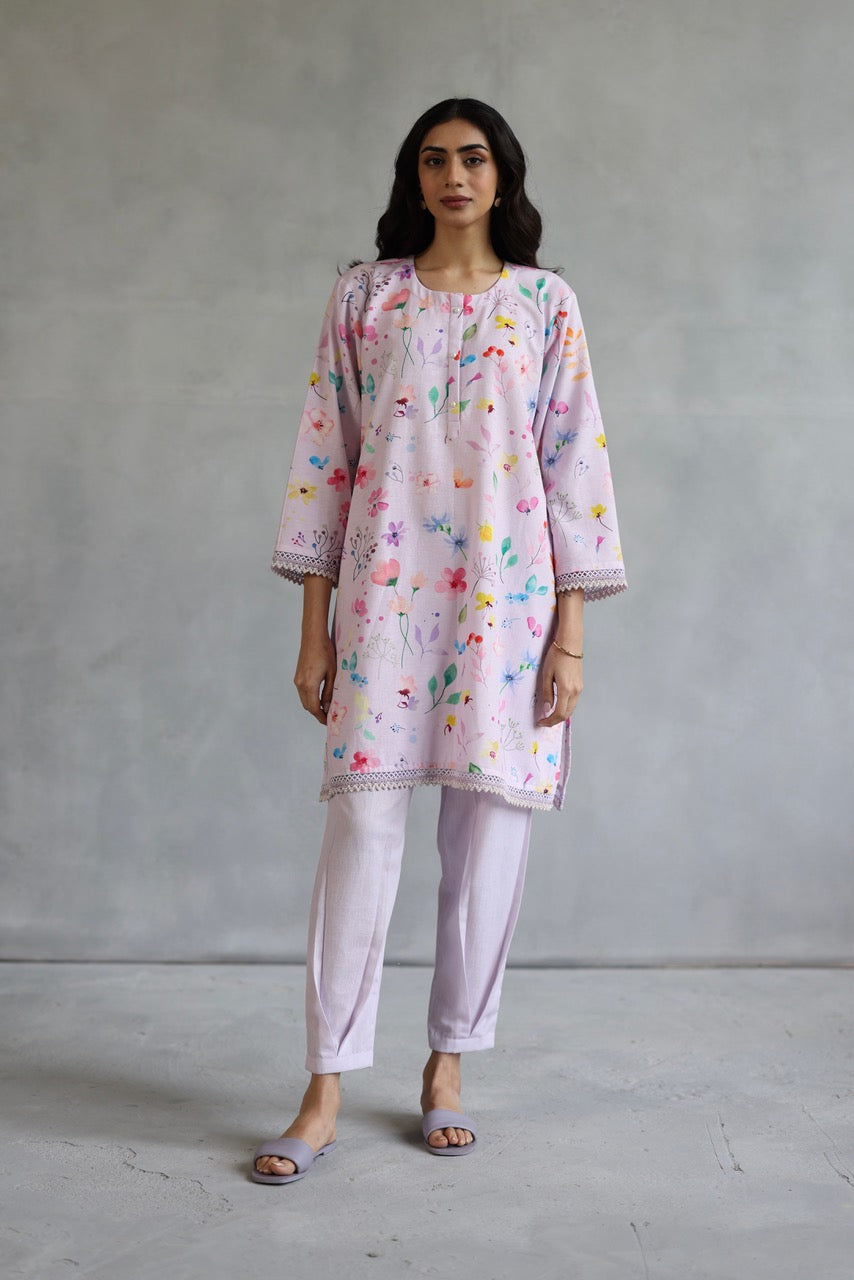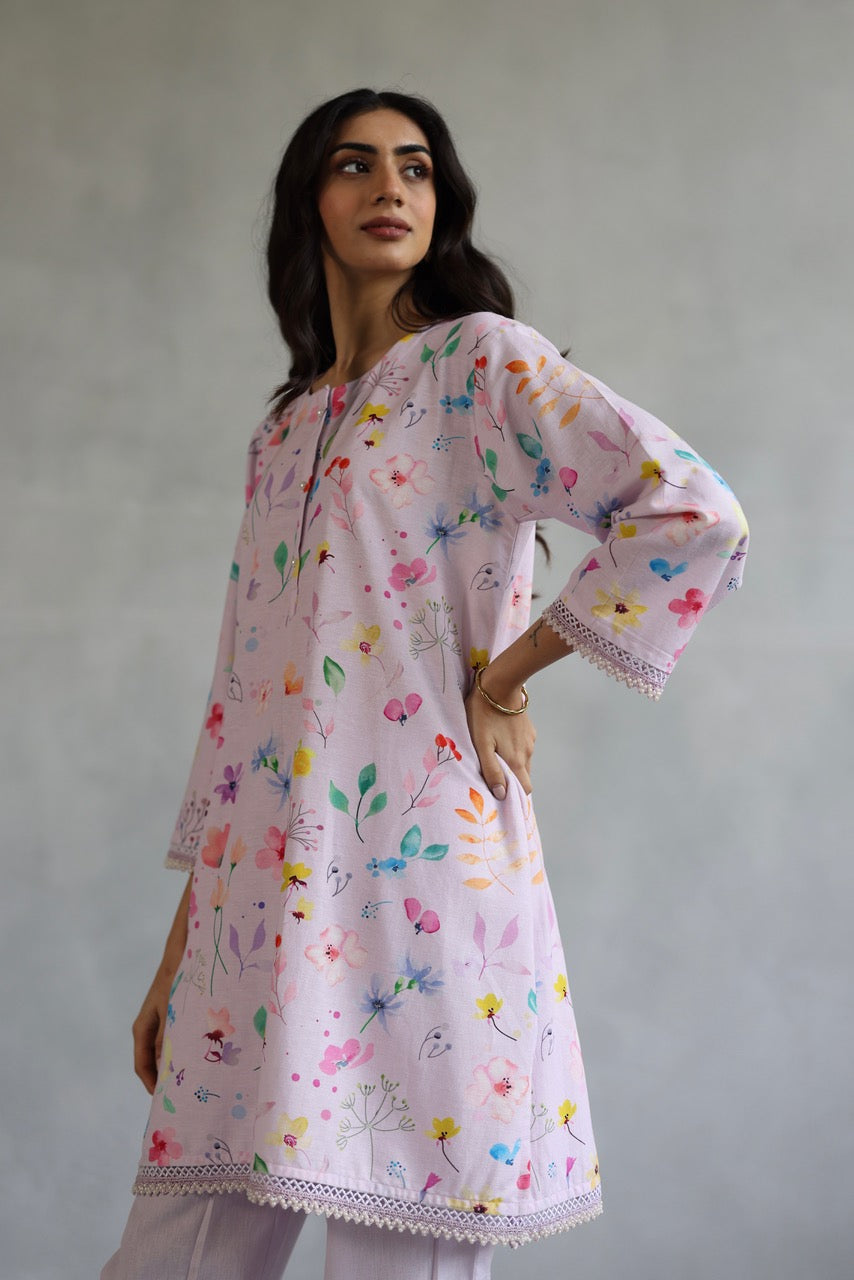 Gracefully adorned with delicate floral motifs, this mid-length ivory kurta is a vision of effortless charm. Beaded buttons add a hint of elegance, while intricate lace detailing on the sleeves enhances its femininity. Paired with tapered salwar pants, this set is perfect for days that call for subtle sophistication and breezy comfort.
