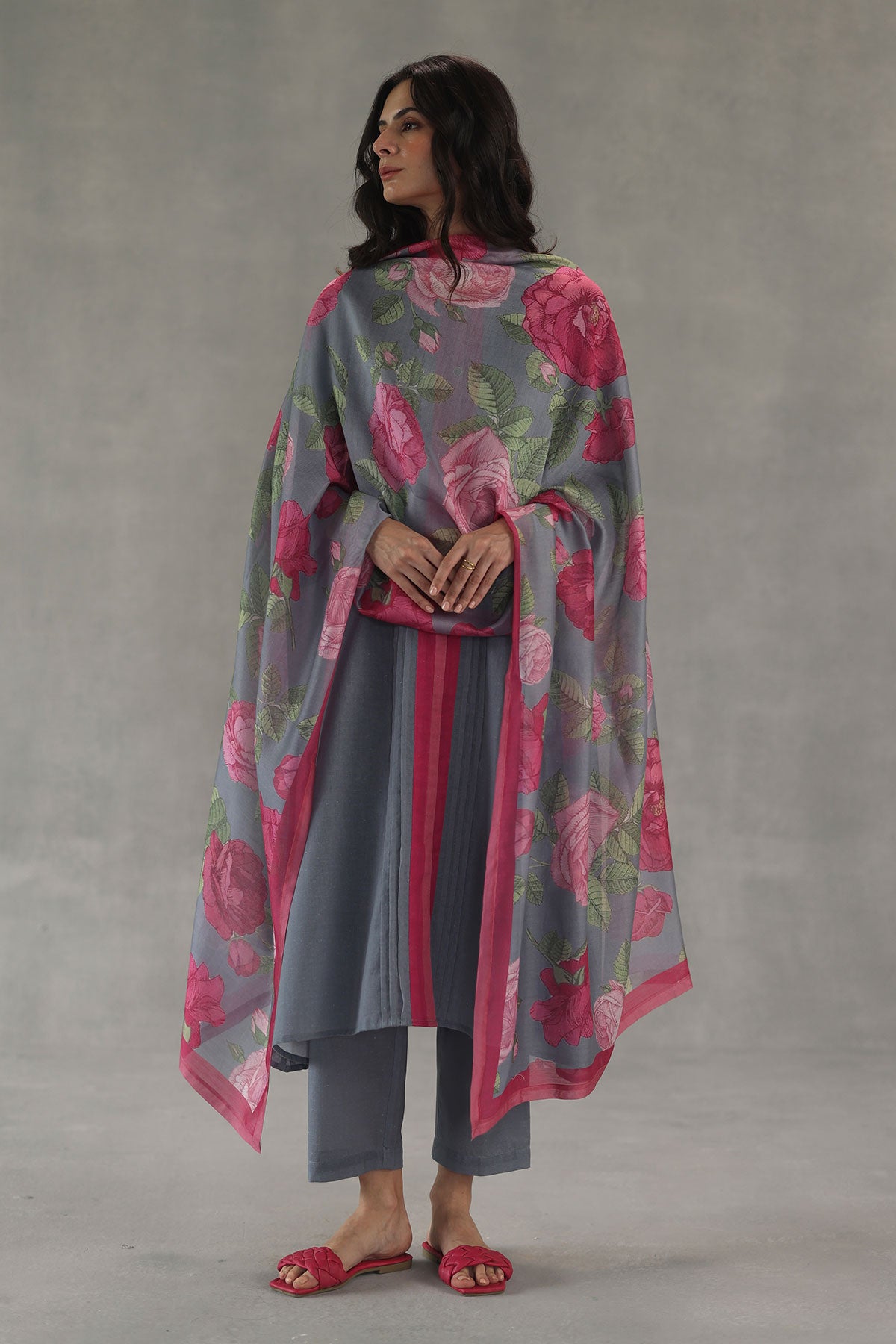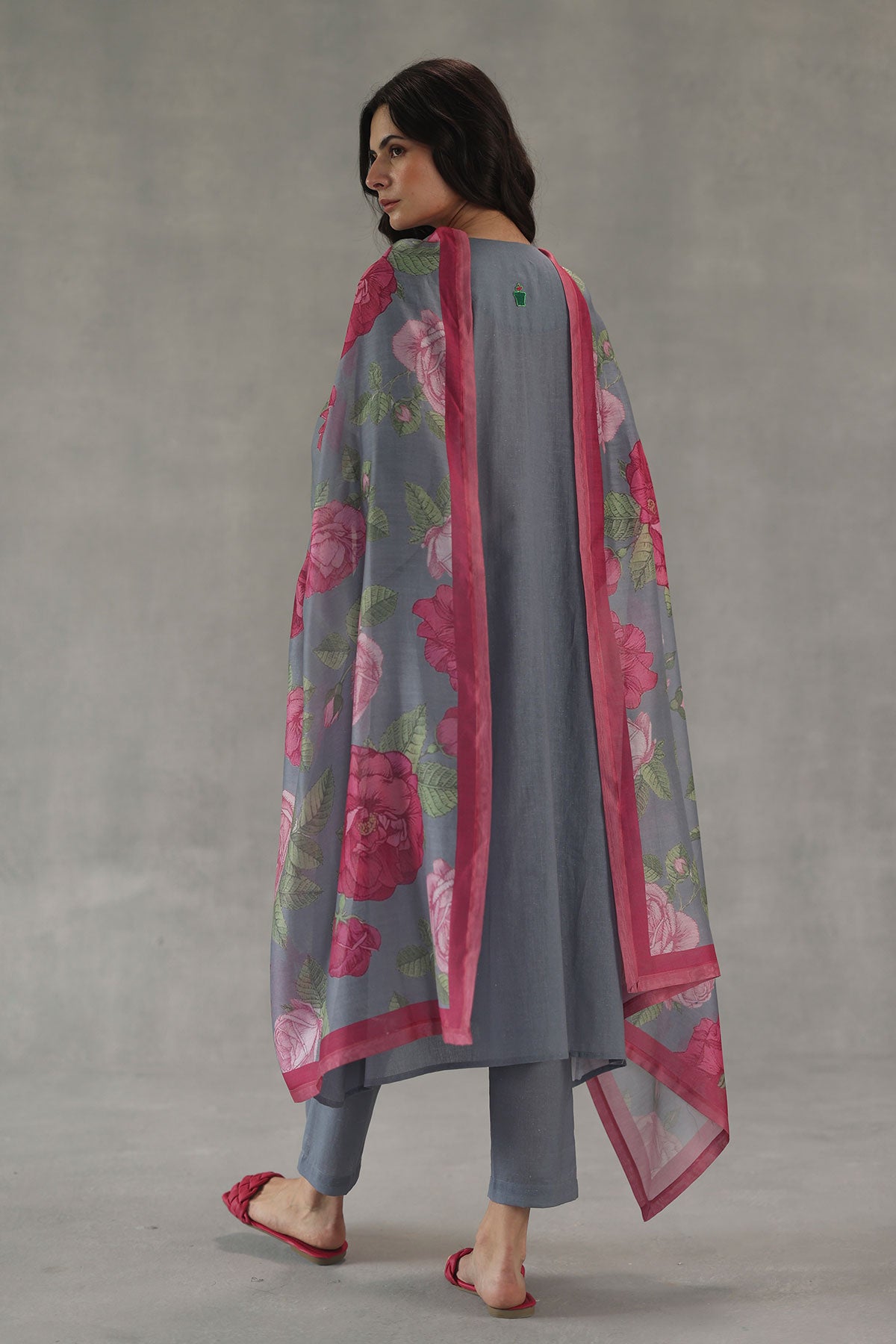 Understated and graceful, the tuberose kurta set in grey showcases a muted base with a contrasting deeper grey panel that adds quiet sophistication. Paired with hand painted flowers printed on a chanderi dupatta featuring soft floral rose patterns and magenta-fuchsia trims, this set strikes the right balance between minimalism and timeless charm.