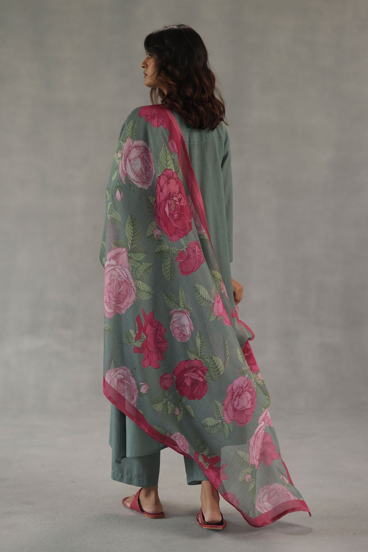 Rich and earthy, the tuberose kurta set in olive is defined by its tonal contrast panel that enhances the depth of the color. The look is completed with a watercolor floral chanderi dupatta, where soft rose motifs and bold magenta-fuchsia trims add a touch of vibrance to this effortlessly elegant ensemble.