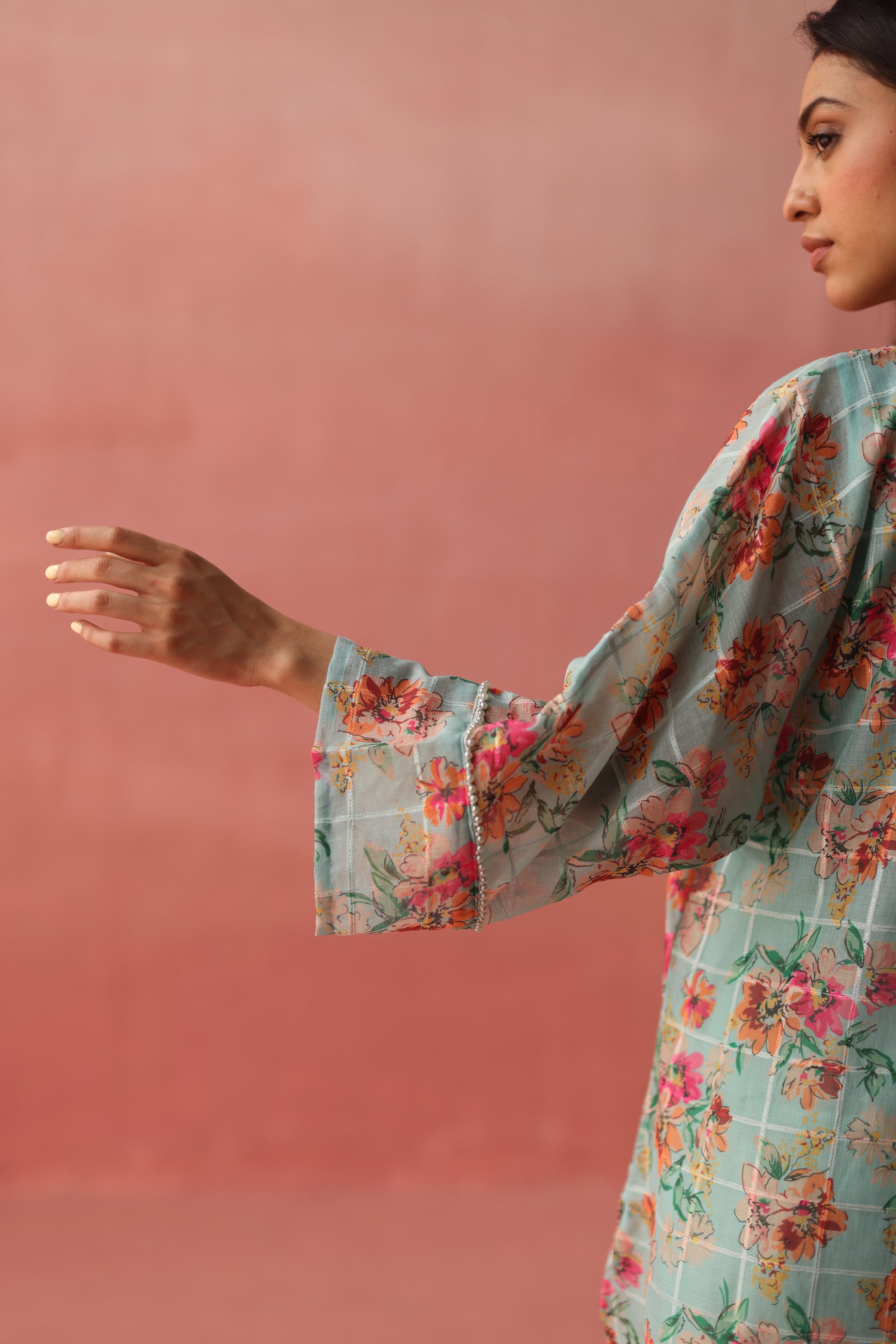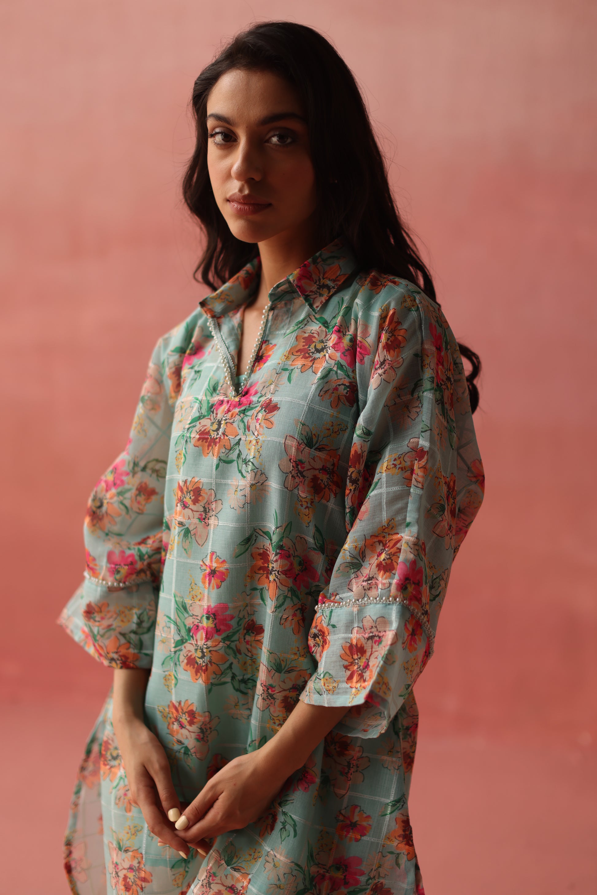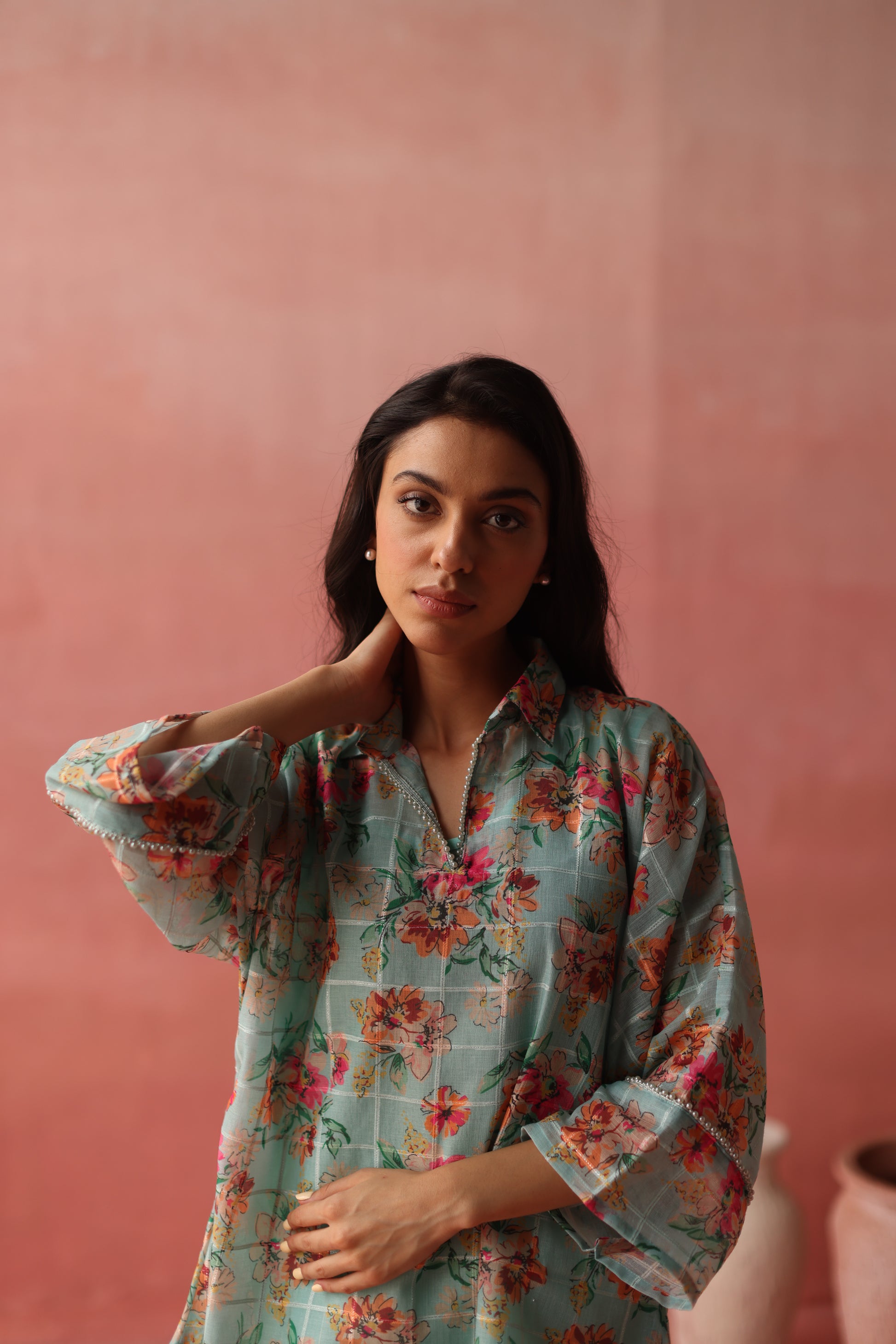 The valley kaftan comes in a beautifully designed print. It has a 3-quarter sleeve with an additional slip. It has a collared v-neckline with pearl lace work on the collar and sleeves. Its flowy texture and beautiful pearls on the floral prints are perfect for any type of occasions.