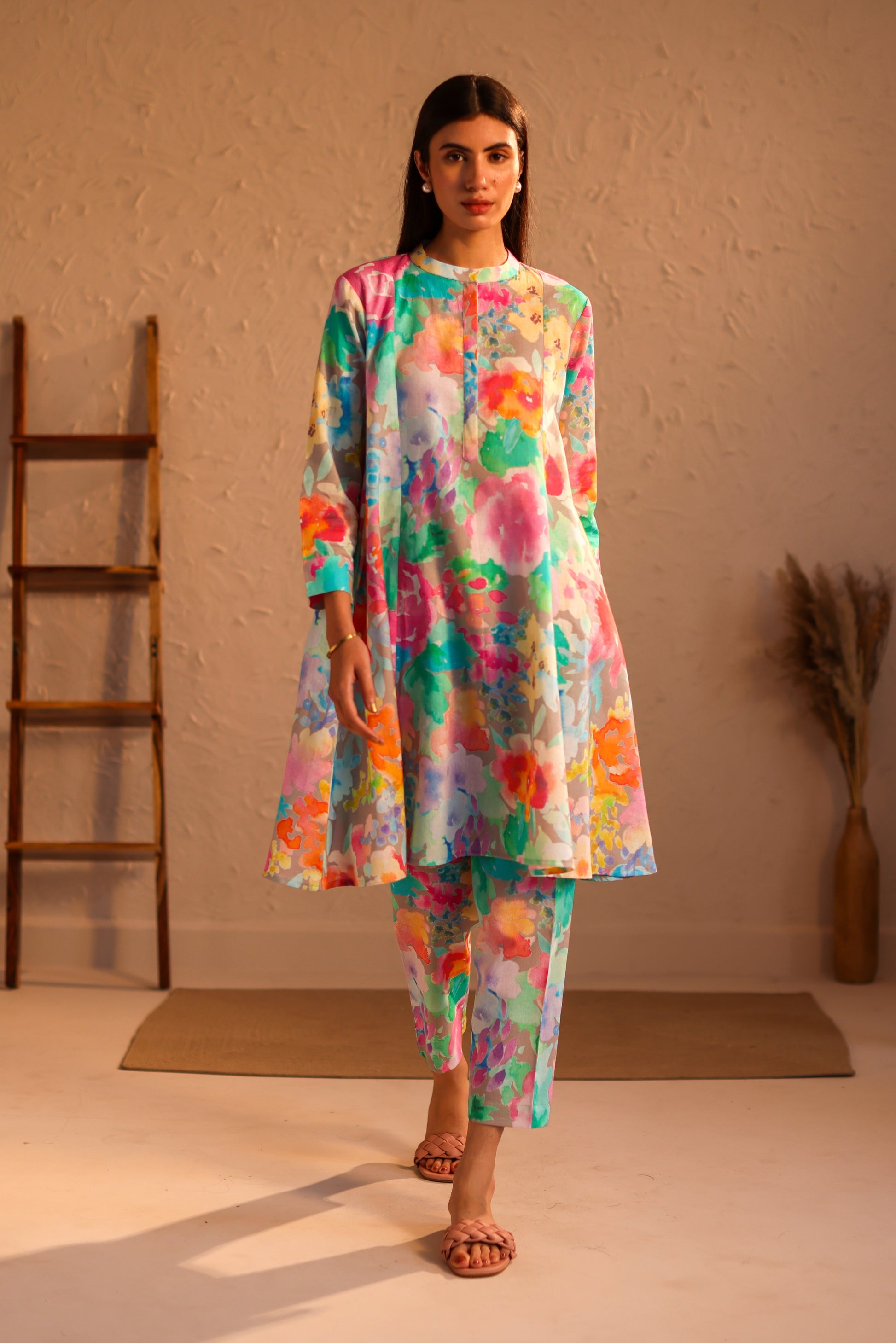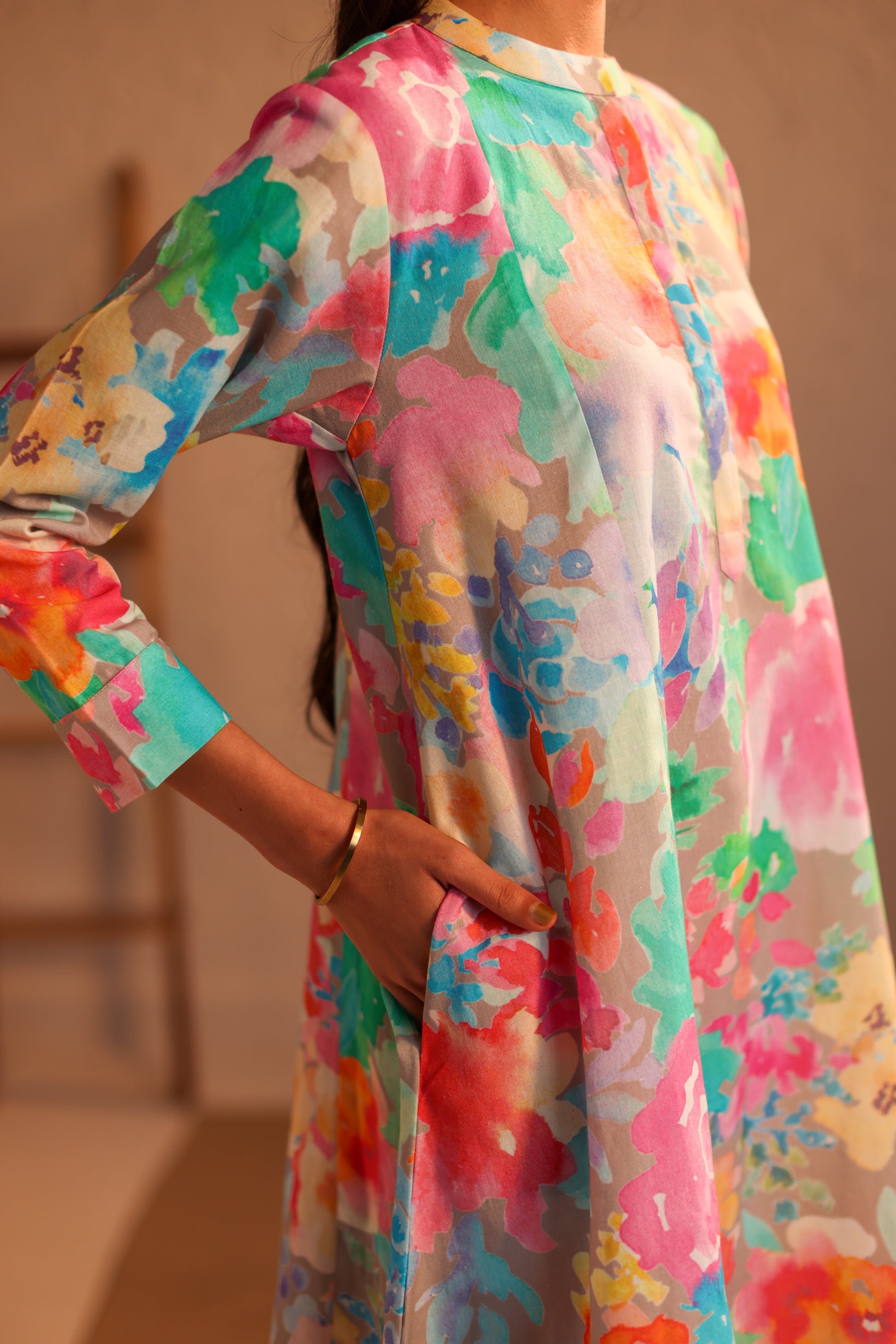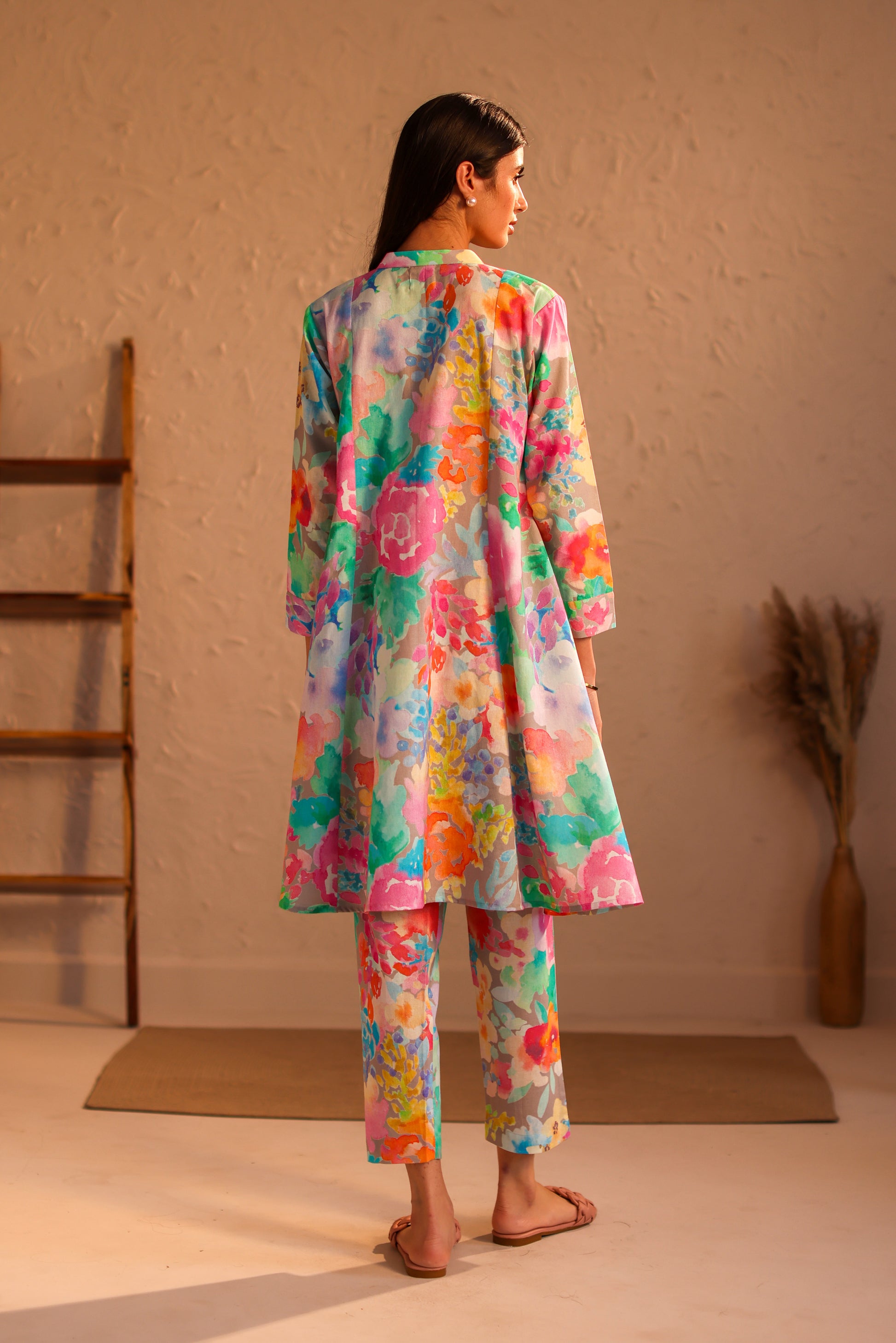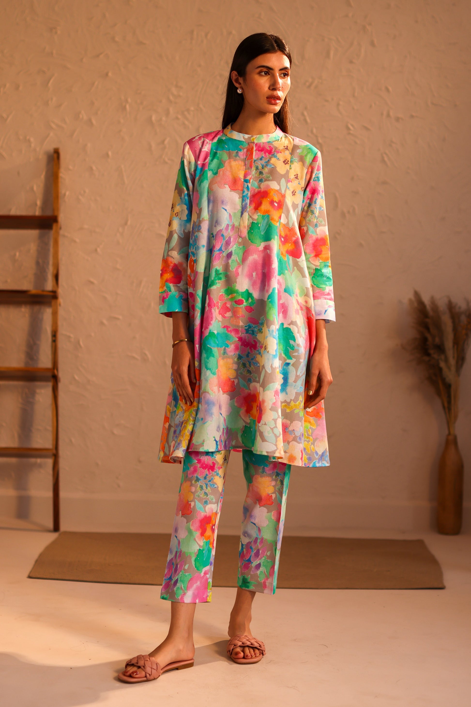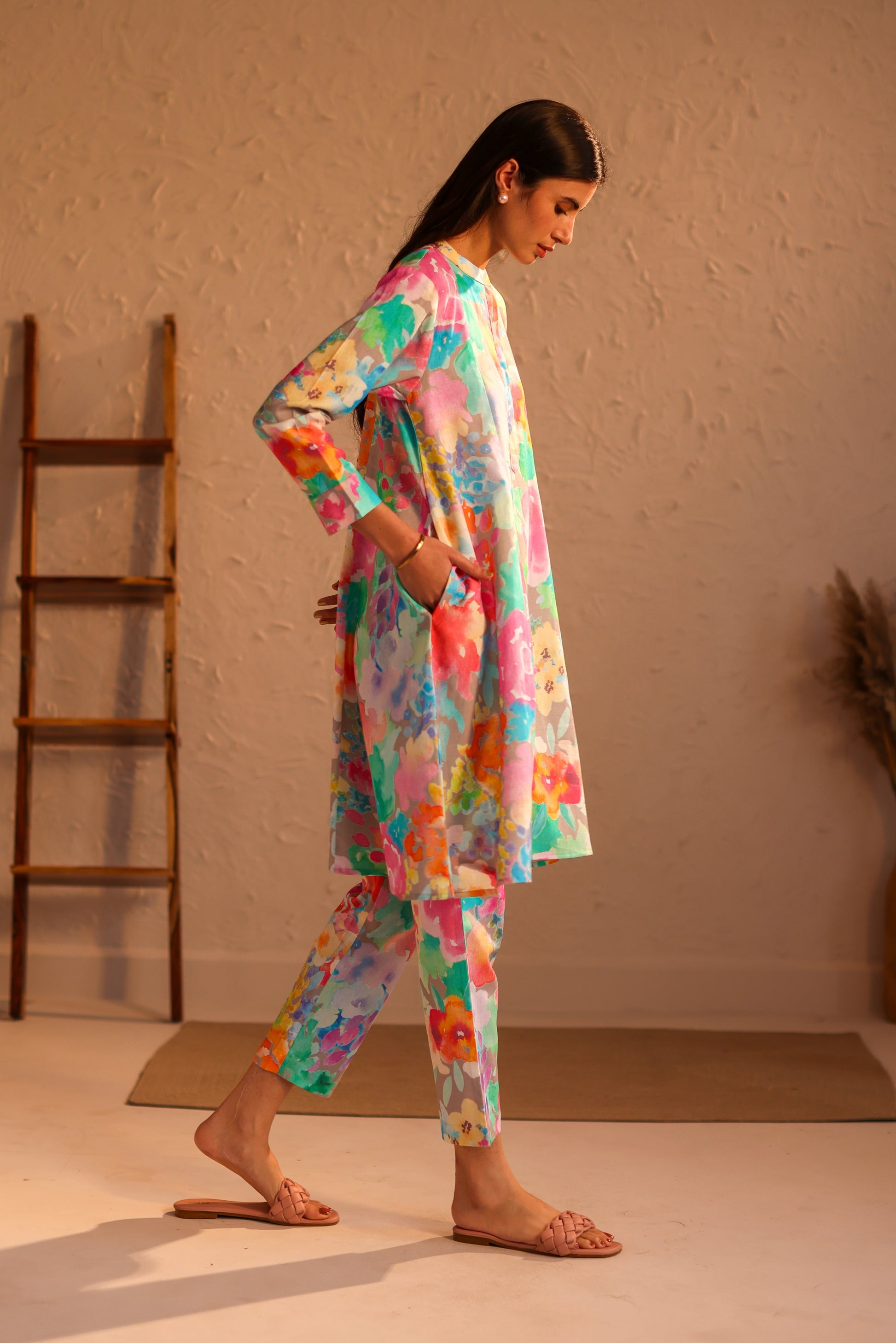 Linen co-ord set with a breezy a-line tunic and relaxed pants in a comfort fit. The co-ord features roza's signature watercolour print and can be carried from day to night.