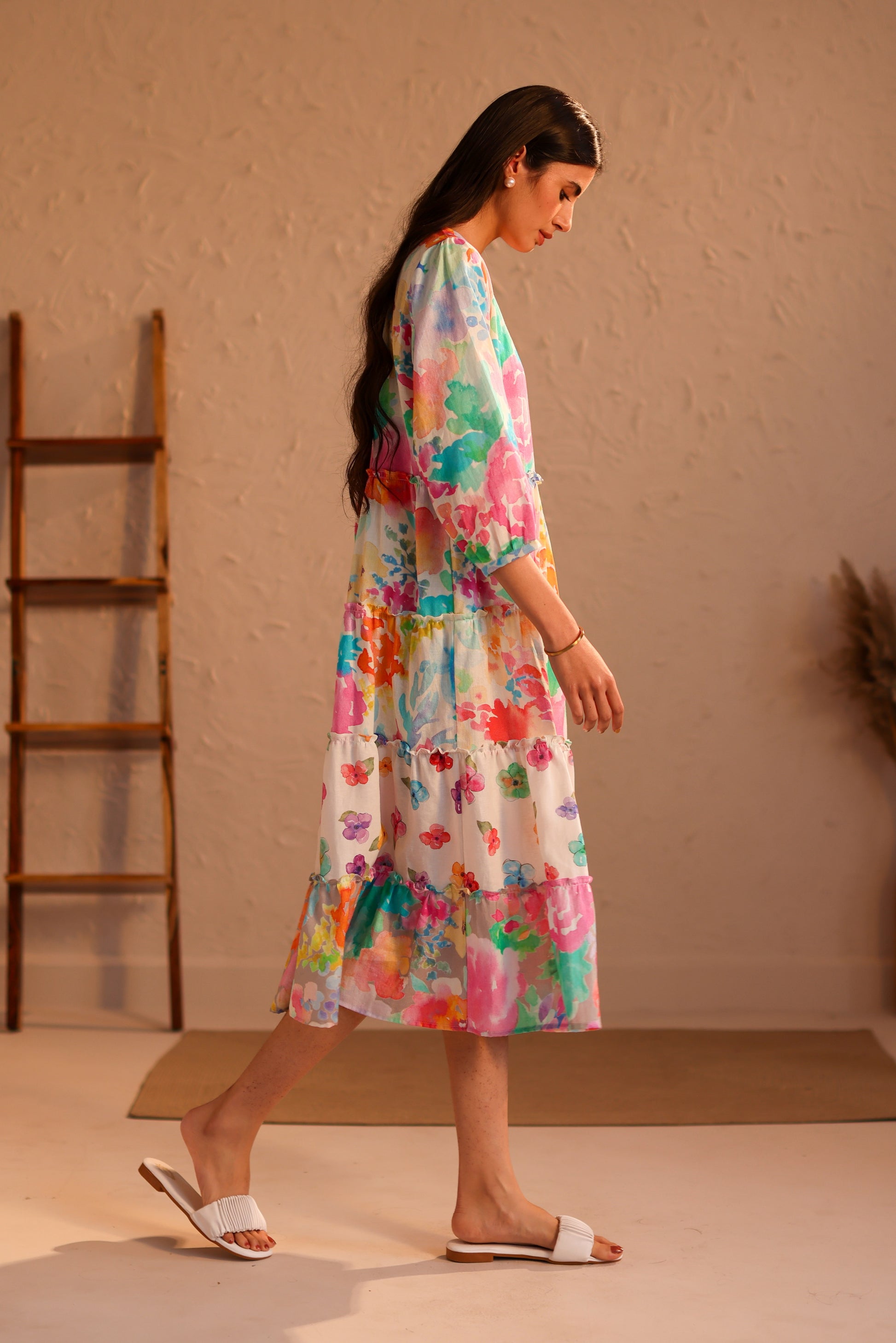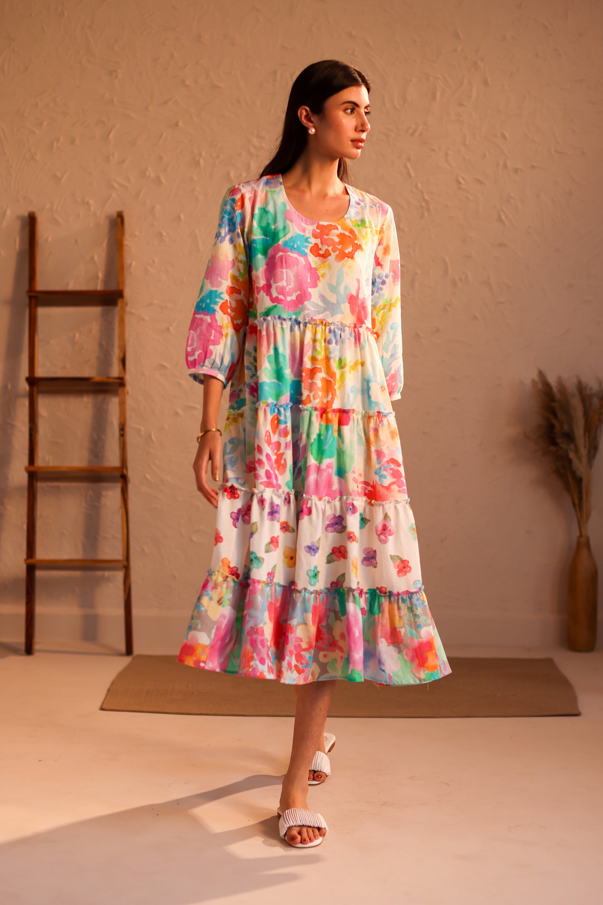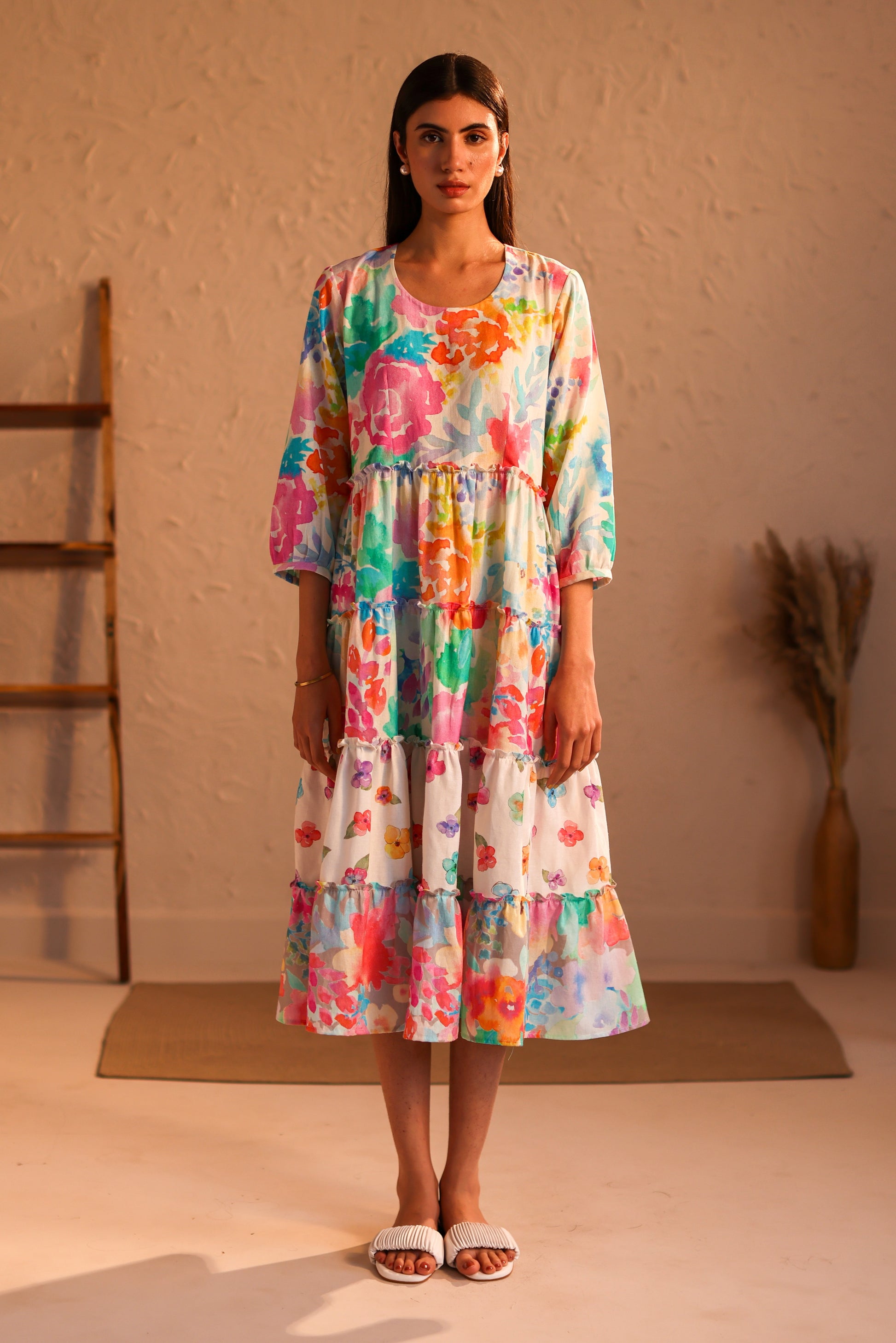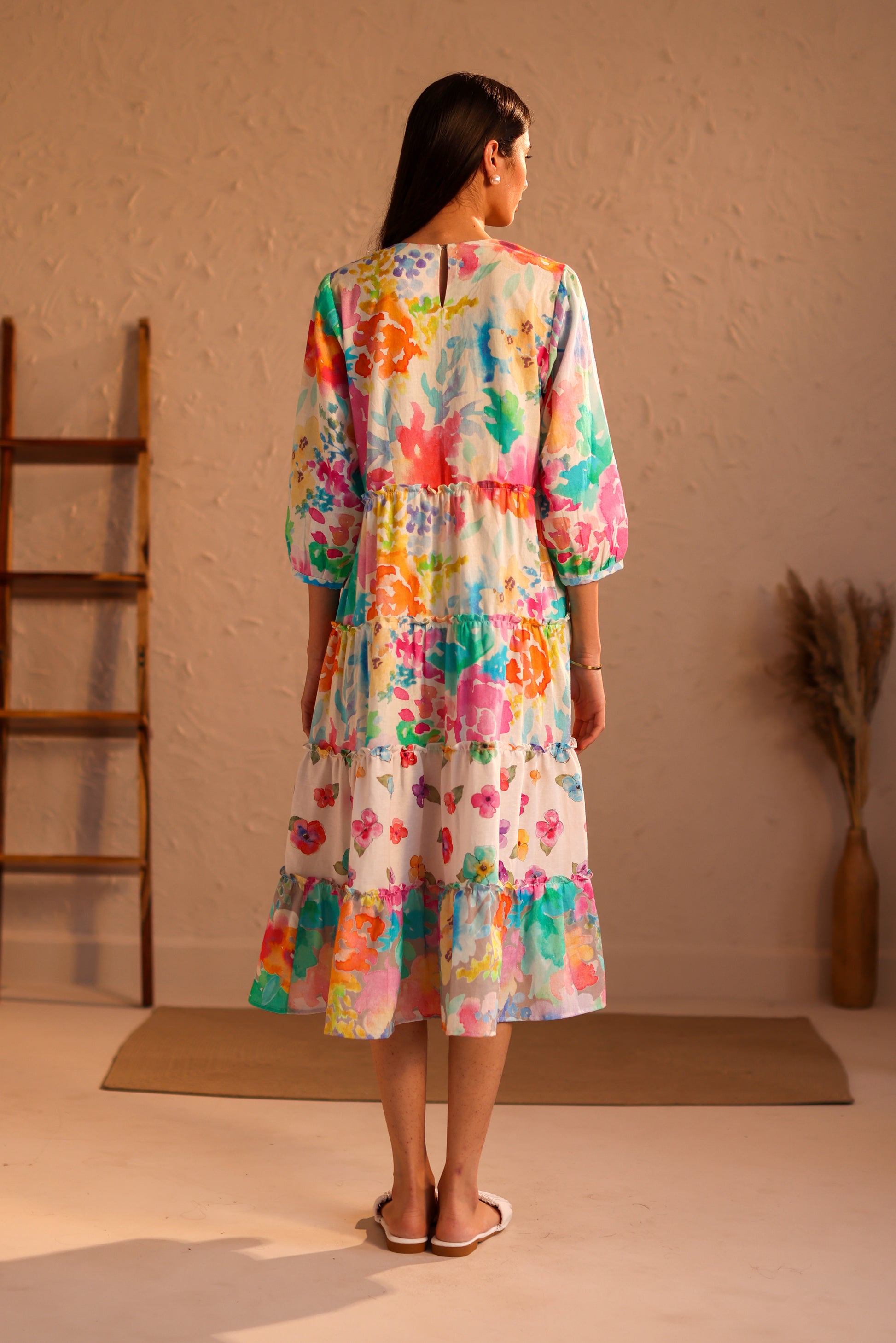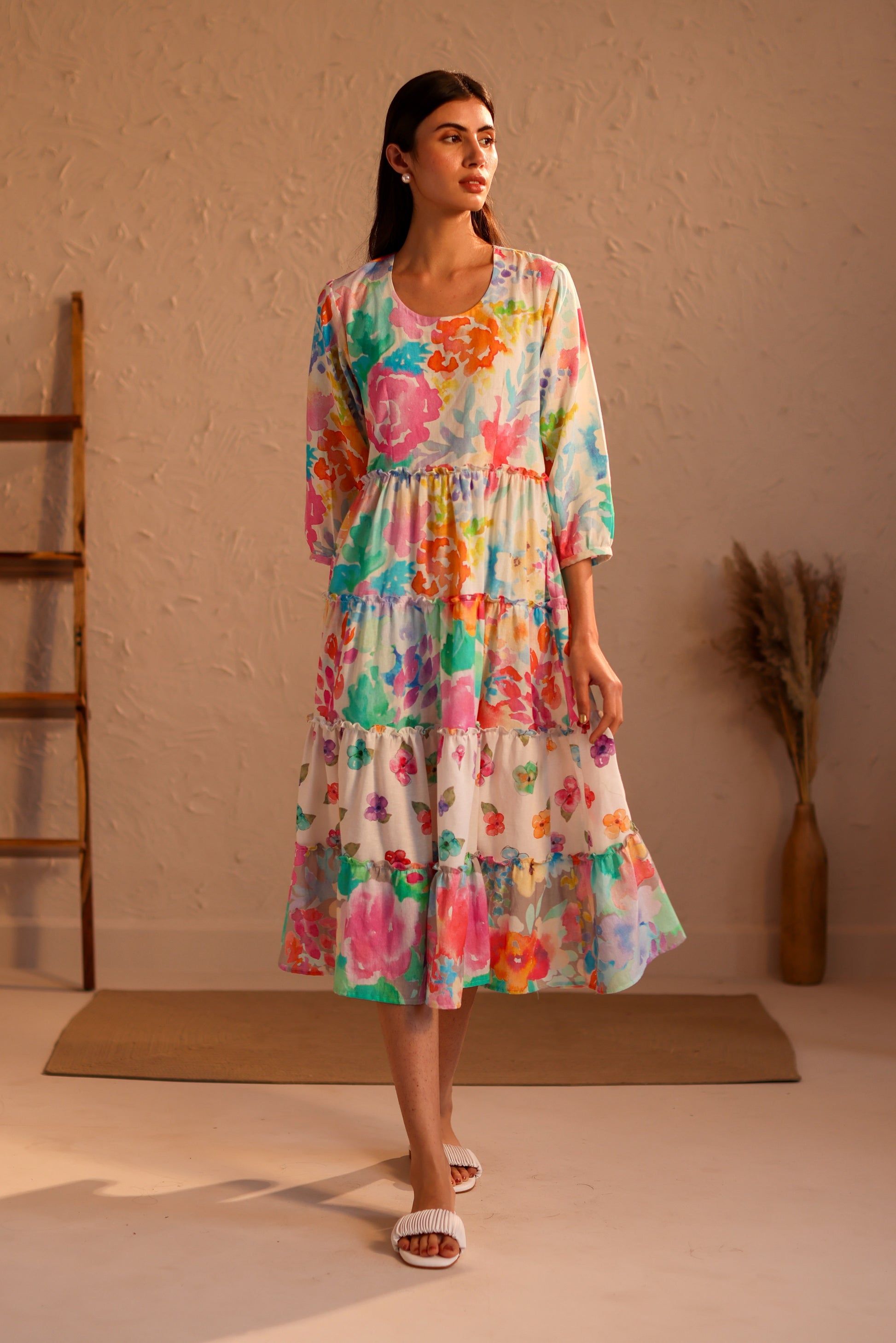 Elevate your occasion wear with the venice tiered dress in roza's signature hand drawn print.
