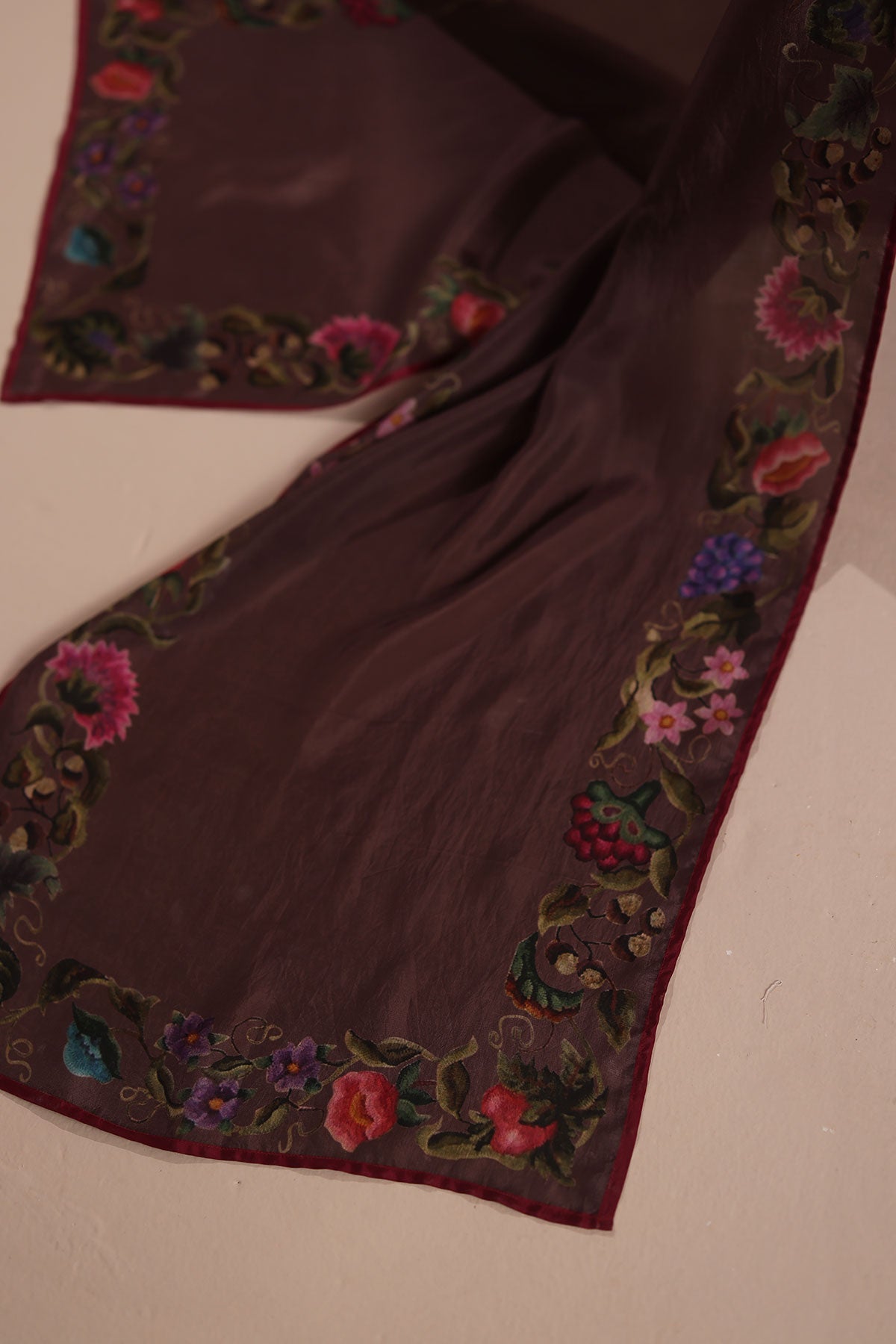 A plum Habutai silk stole with floral prints four sided border and a magenta accents, designed to complement the Vine kurta set.