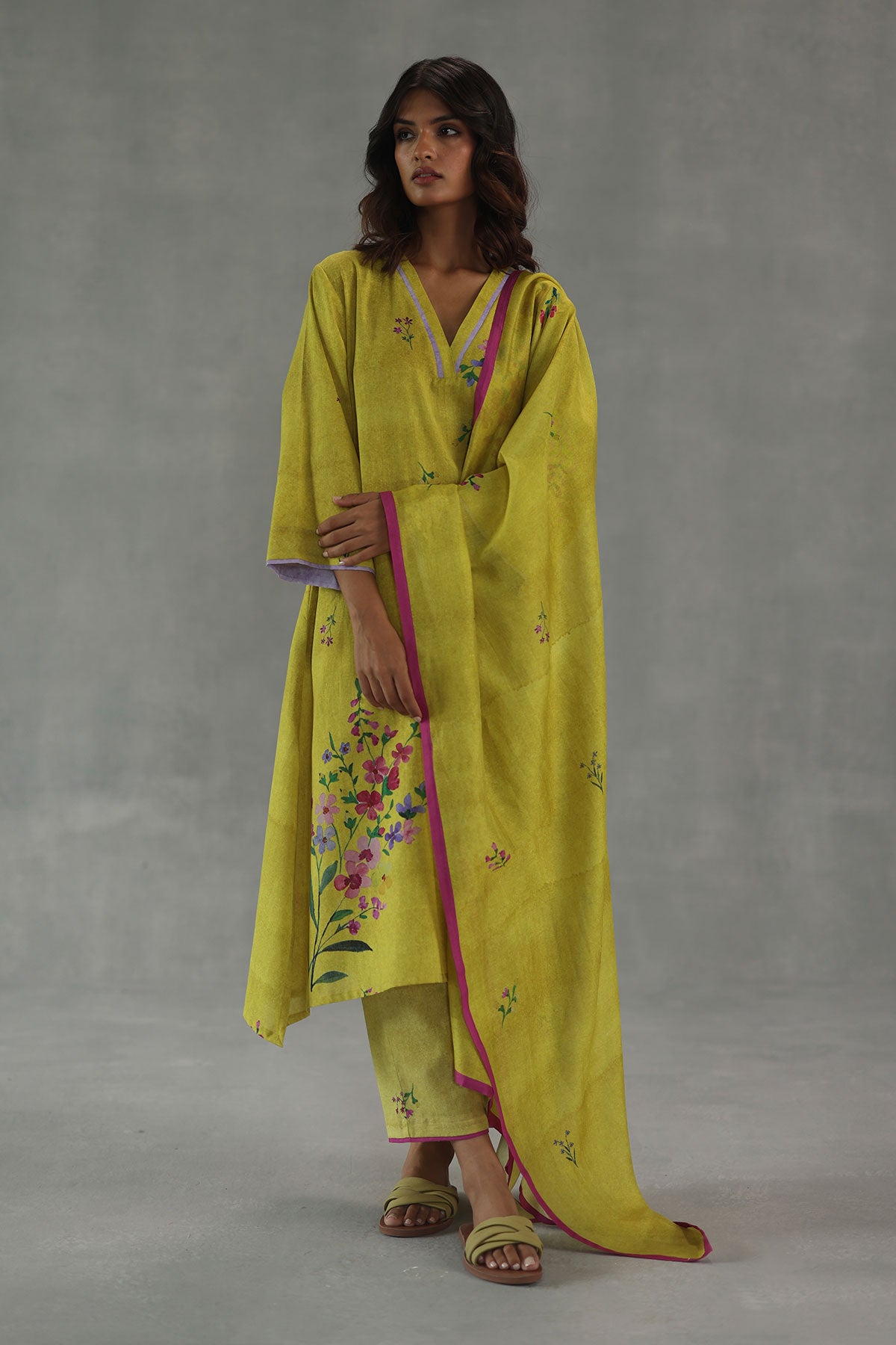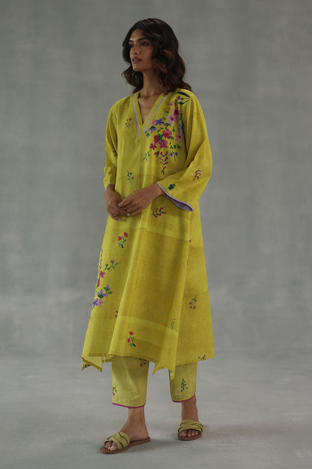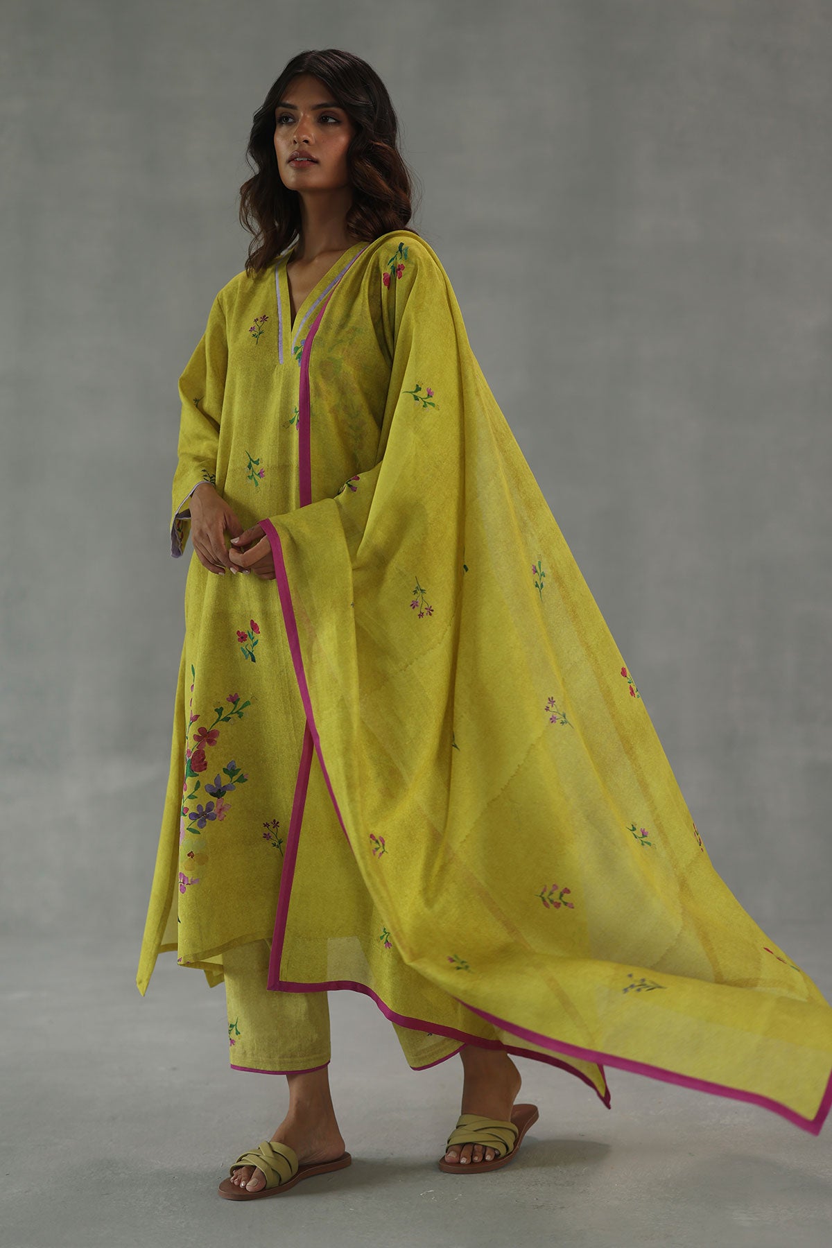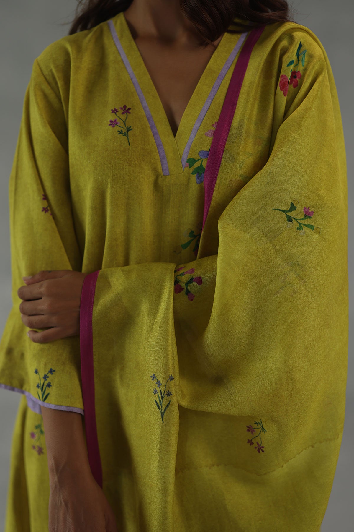 Romantic and artfully detailed, the viola kurta set features a soft watercolor-painted base with graceful floral vines blooming from the shoulder to the yoke and along the ghera. The flowers, rendered in dried fuchsia, red, and pink tones, create a painterly charm that is both delicate and striking. The look is completed with matching pants featuring dainty floral prints for a beautifully coordinated ensemble.